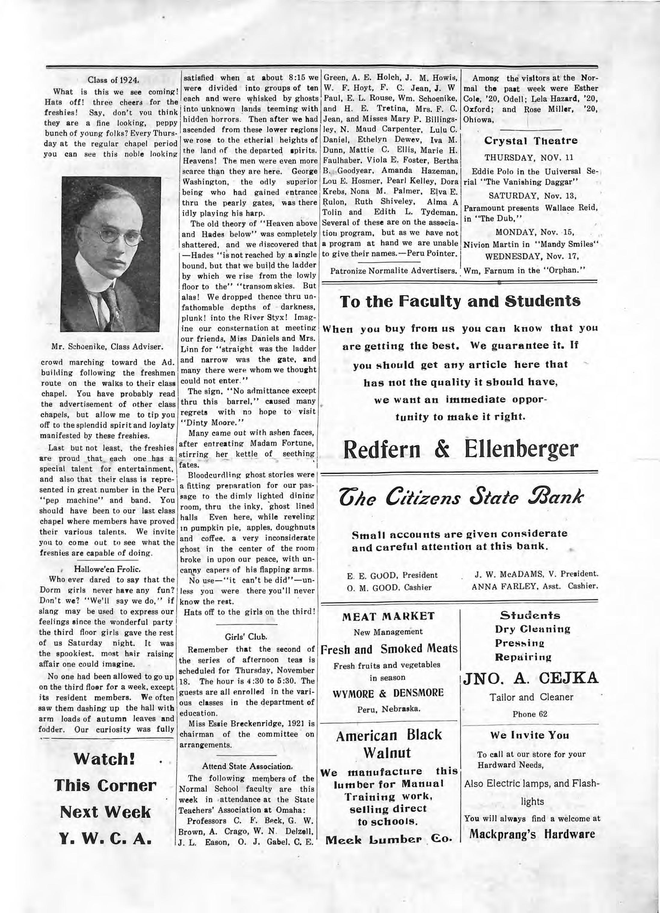 At the beginning of th e f .;u rrh The Peru boys pa id h igh tribut e h · f th · Y W C A We dn e sday 7 ·30 pm body, su pe rvi s or s, pr i ncipa ls a.nd Ed R I d to t e 1r opp one nts or e rr S:J o rts- · · · · · quarter ose nquist r ep ac e C W d d t eac hers, and ca n get along so Bracke at ha lf bai!k , made some mans hip and clea n pla yi ng. Y t>s Y. M. . A. e nee ay, 7:::!0 pm b h ·r1 1 d h d N C A Su da 10 a we ll wit h a ll eleme nle whi ch go to go od gains, taki ng the hal l ba ck in ot Si es pave . a ar clean ., n y, m. g am e. But the officia ls we h ad Band, Tues day-Thurs day, 7:3 0 pm make up st ud ent l ife . He has to York's te rritory. Yo rk in te r- d we re of the typP of me n wh o wou ld Or chestra. Monday -We dn e sday ,8:15 poise, an w ill be ready to m eet cepted a forward pass on Per u' s Specia l Ev Pnl s. any em ergency , and sta rts out with d not sta nd for anyt hin g else. Nor ten yar lin e C. Ro se nq ui st in - October 22, Foorba ll ga m e, Kear-the good will of ever ybody in the terce ted Yo rk 's punt be hind th e wo ul d the two c6ache s. Th e r efe r ee n ey. lin e. Wi ls on, Peru' s fighting ce n- was b ur former Coac h Joh nson who Octob er 15, Mov ies <Co ntinu ed on F'ourth P age.' IS a wa l kin g advert ise ment for O ld 29 , Movies.