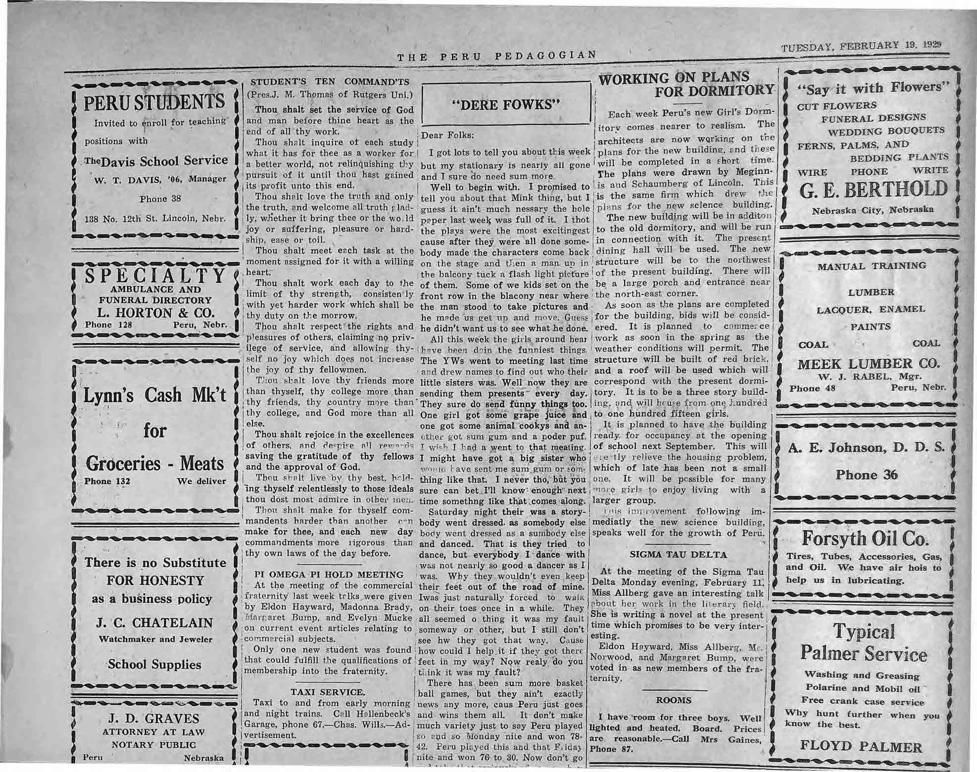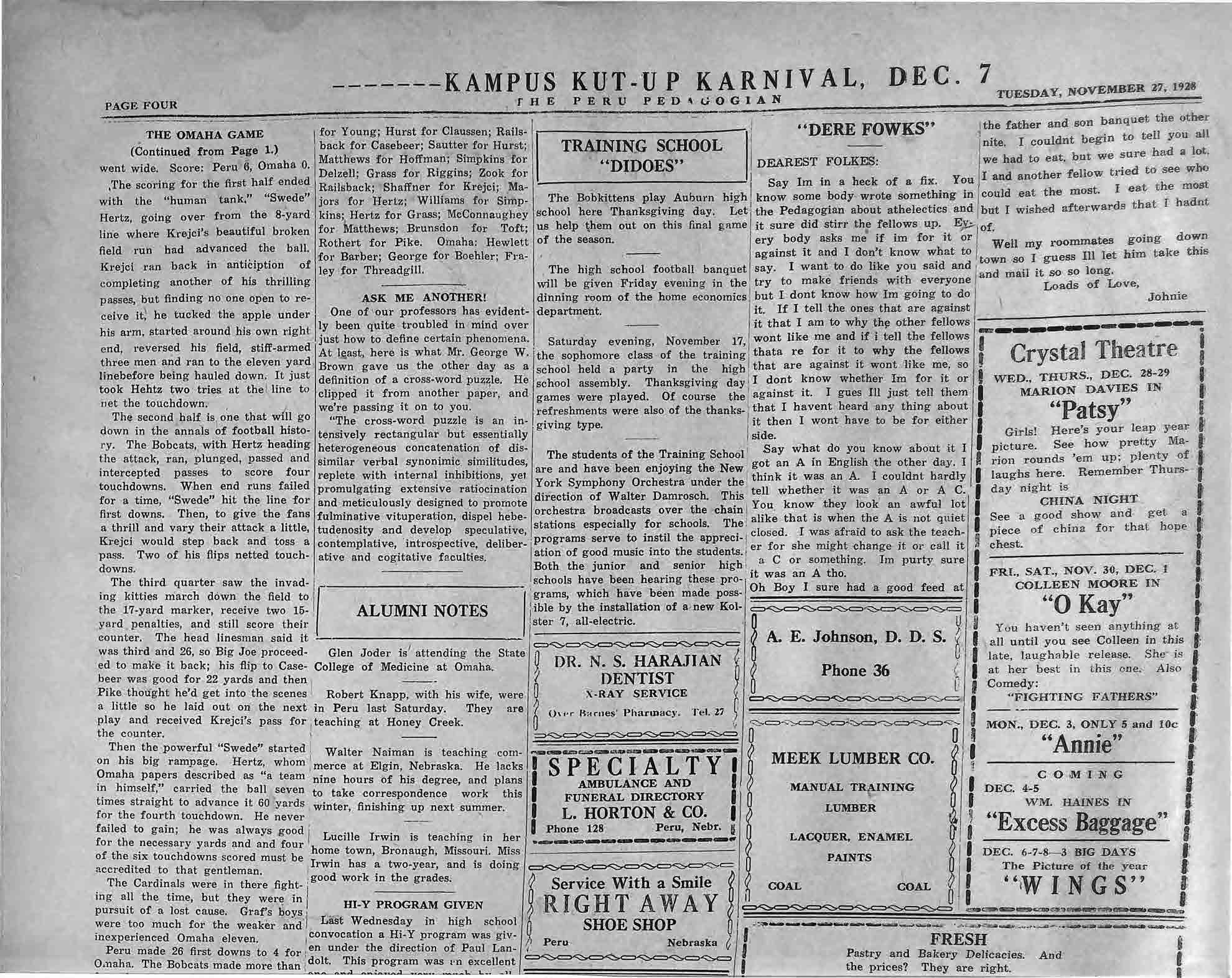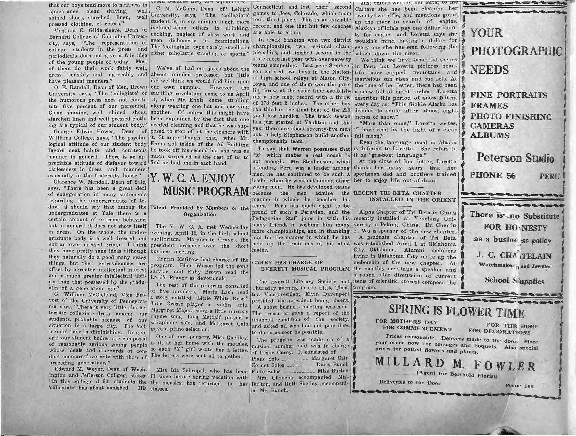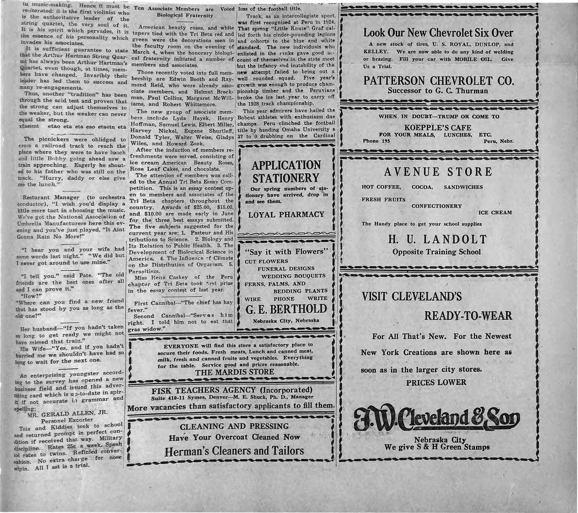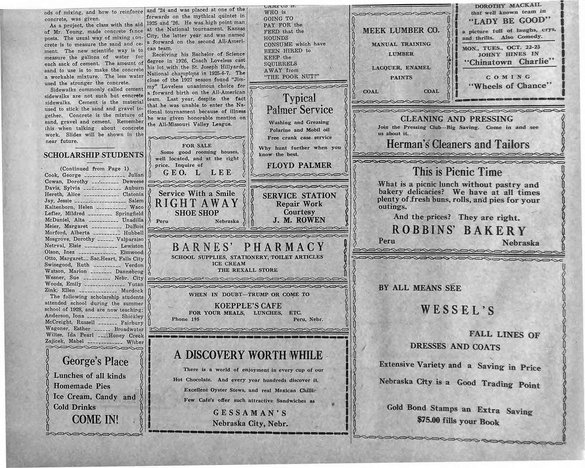 What does the aven1g e Co-ed come According to God's plans H d h' r I d · 1 J e was particularly inter es te on t is were se a e m a arge envelove and ' NING ' to co lle!!e for? Yo u say tha t "a To g rac·e the home her task shall be '- f I d" h' f · t h 'th d MANUAL TRAI trip in t e grav e o an n ian c 1e , g iven o w1 or ers not to open I w man w-0u'ld starge to death in the To win. the bre ad the man's. in the buffs below tow n. He was brot t hem un ti l she got to Ste amboat I home t.hese days and have fewer ' to Peru by T. J. Long, of the Nebras- Sprin gs, Colorado- then to on ly LUMBER ' cloth.es" so i.t is assumed that. t he wolf So greetin gs to you sister ka Ci ty Ph arma "'y. Conc erning this. one a day. Marguerite Gr aves, El sie's ' ""' LACQUER, ENAMEL is at t he door. Clothes - Yo u need May yo u gain fame and r enow n, work of Mr. Blackman, The Nebraska ro om-mate dese rves a ll the credit for not have mentioned clot hes. An edu - And you may tramp Ulp oin our necks qty News-Press of We dnesday says : this farewell party. ' PAINTS I cation for clothes to y0tur j But _YO U can't keep a g ood man down. "E. E. B.lackman. curator of the I COAL COAL ' o wn sta tements! 'ifhere1n hes the e x- . - By Heck. Nebr asklll State Historical Society Geor ge Abe '27, is av is- ; plan atio1;1 of the word diverse. What museum, who for the past 30 years itor on the Peru campus. MacElro y I PERU LUMBER CO. does the man come to colle ge for? To "BLOWSERS" AND "WOWSERS" has been connected with th€ org a niza- coac hed at Brid geport, N eb., last year w. J. RABEL, Mgr. J better ,himself' an d .the immediate SO'- Headw ay · is at l ast bein g made by tiori in exiploring former stampin g and will return to Br id g eport t hi s Phone 48 Peru, Nebr. ciety in which he lives. You have the gallant pion eers str u ggling to im- gro unds od' vario us Indi an t rib es, will fall to continue coachin g. Abe was J done many an inju s tive be- Iprove the idiotic dre ss that men p ut do some in v es'tigati.oill work along the a star on the Bobcat