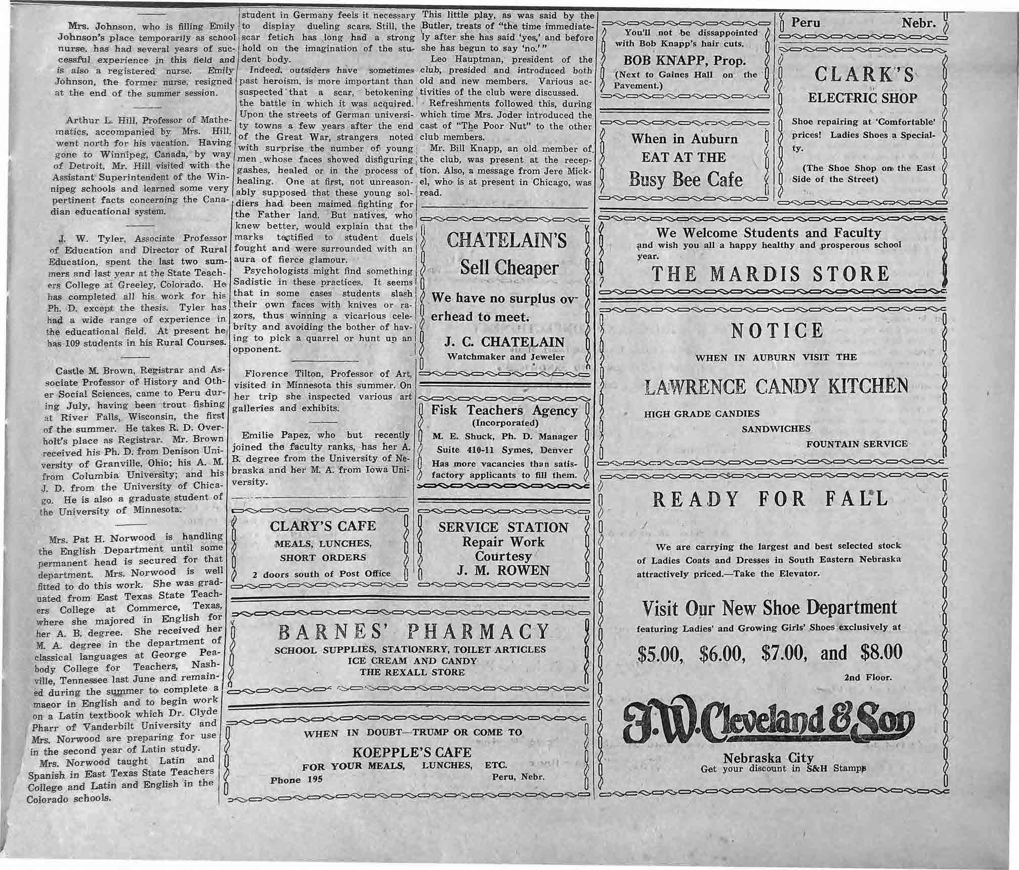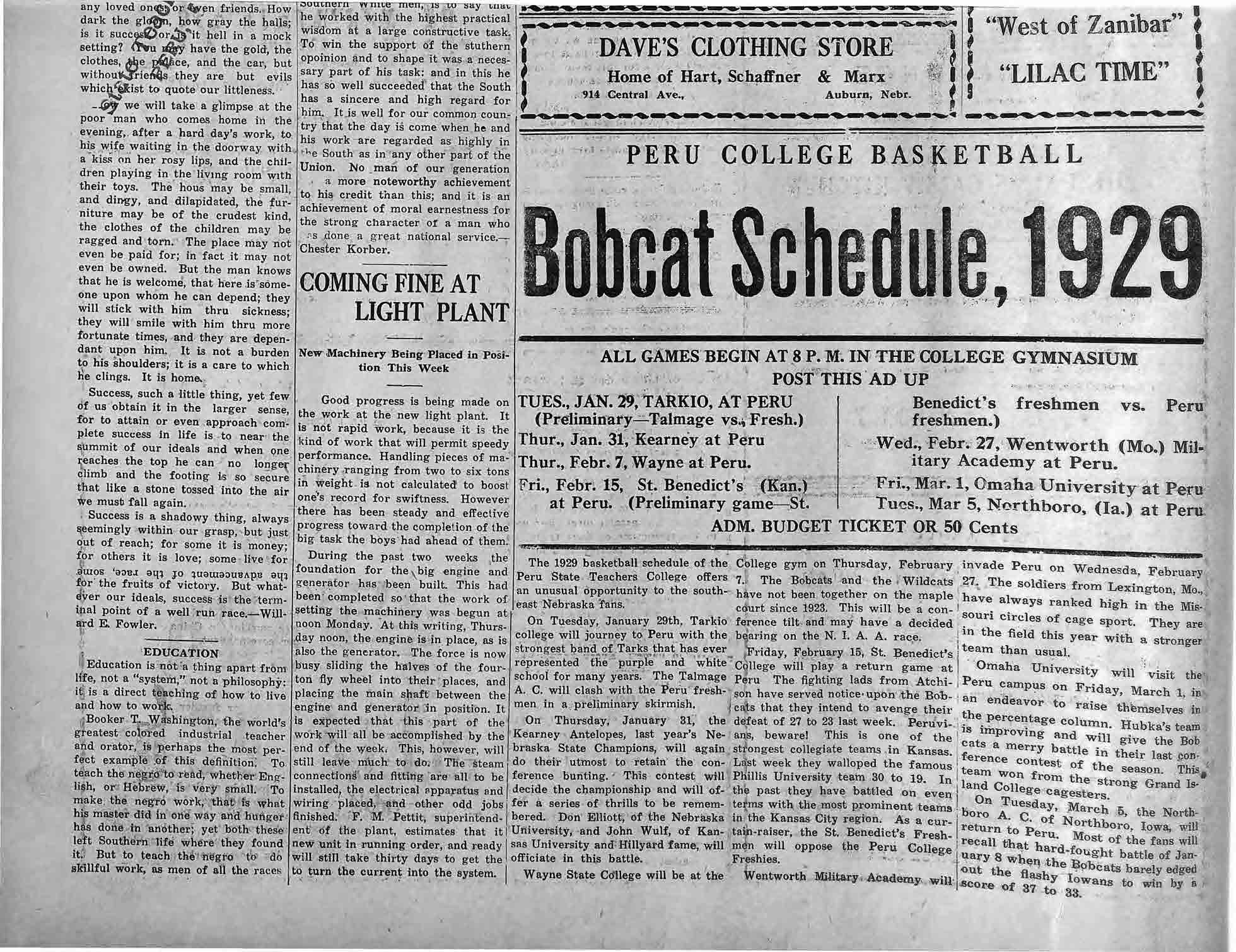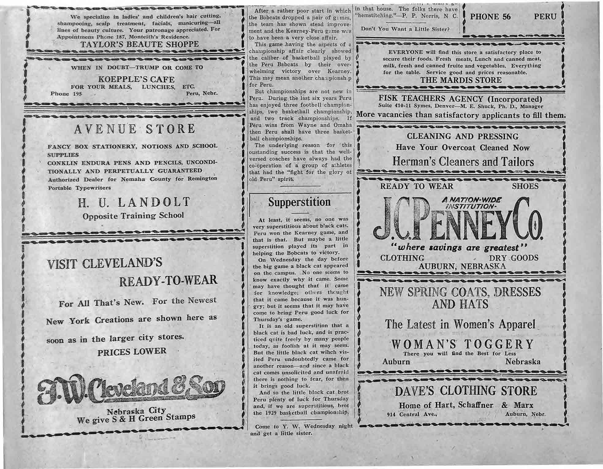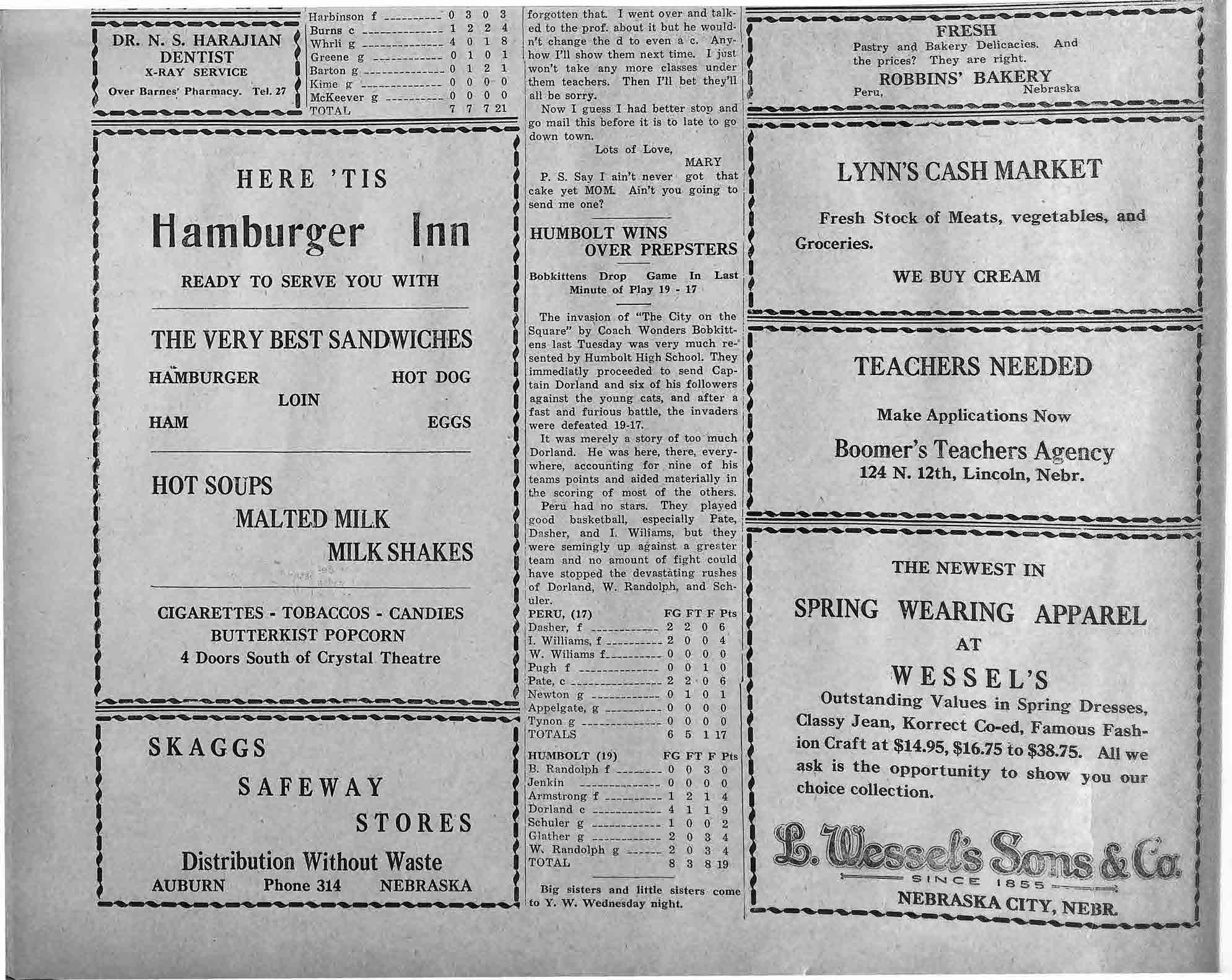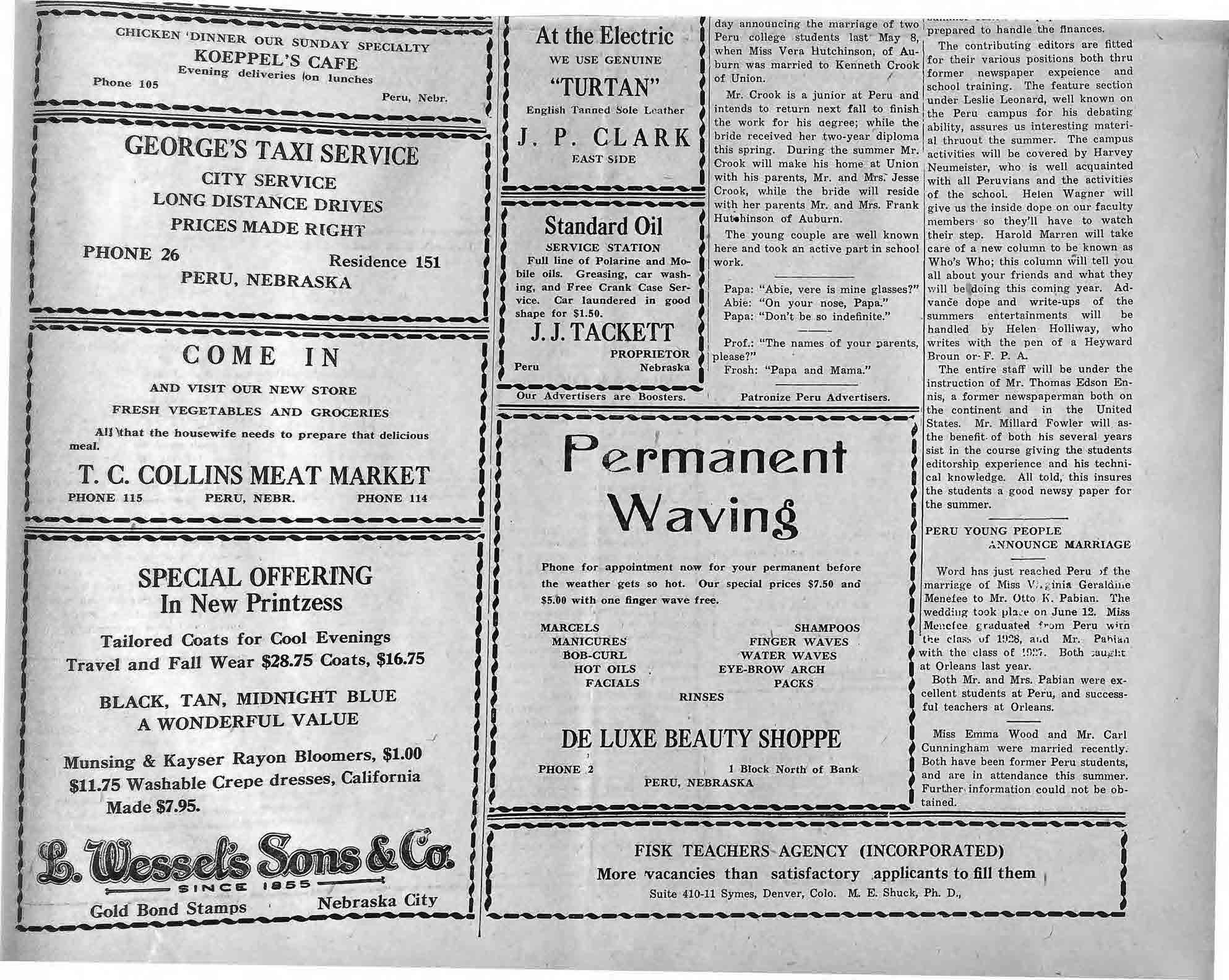What does the aven1g e Co-ed come According to God's plans H d h' r I d · 1 J e was particularly inter es te on t is were se a e m a arge envelove and ' NING ' to co lle!!e for? Yo u say tha t "a To g rac·e the home her task shall be '- f I d" h' f · t h 'th d MANUAL TRAI trip in t e grav e o an n ian c 1e , g iven o w1 or ers not to open I w man w-0u'ld starge to death in the To win. the bre ad the man's. in the buffs below tow n. He was brot t hem un ti l she got to Ste amboat I home t.hese days and have fewer ' to Peru by T. J. Long, of the Nebras- Sprin gs, Colorado- then to on ly LUMBER ' cloth.es" so i.t is assumed that. t he wolf So greetin gs to you sister ka Ci ty Ph arma "'y. Conc erning this. one a day. Marguerite Gr aves, El sie's ' ""' LACQUER, ENAMEL is at t he door. Clothes - Yo u need May yo u gain fame and r enow n, work of Mr. Blackman, The Nebraska ro om-mate dese rves a ll the credit for not have mentioned clot hes. An edu - And you may tramp Ulp oin our necks qty News-Press of We dnesday says : this farewell party. ' PAINTS I cation for clothes to y0tur j But _YO U can't keep a g ood man down. "E. E. B.lackman. curator of the I COAL COAL ' o wn sta tements! 'ifhere1n hes the e x- . - By Heck. Nebr asklll State Historical Society Geor ge Abe '27, is av is- ; plan atio1;1 of the word diverse. What museum, who for the past 30 years itor on the Peru campus. MacElro y I PERU LUMBER CO. does the man come to colle ge for? To "BLOWSERS" AND "WOWSERS" has been connected with th€ org a niza- coac hed at Brid geport, N eb., last year w. J. RABEL, Mgr. J better ,himself' an d .the immediate SO'- Headw ay · is at l ast bein g made by tiori in exiploring former stampin g and will return to Br id g eport t hi s Phone 48 Peru, Nebr. ciety in which he lives. You have the gallant pion eers str u ggling to im- gro unds od' vario us Indi an t rib es, will fall to continue coachin g. Abe was J done many an inju s tive be- Iprove the idiotic dre ss that men p ut do some in v es'tigati.oill work along the a star on the Bobcat