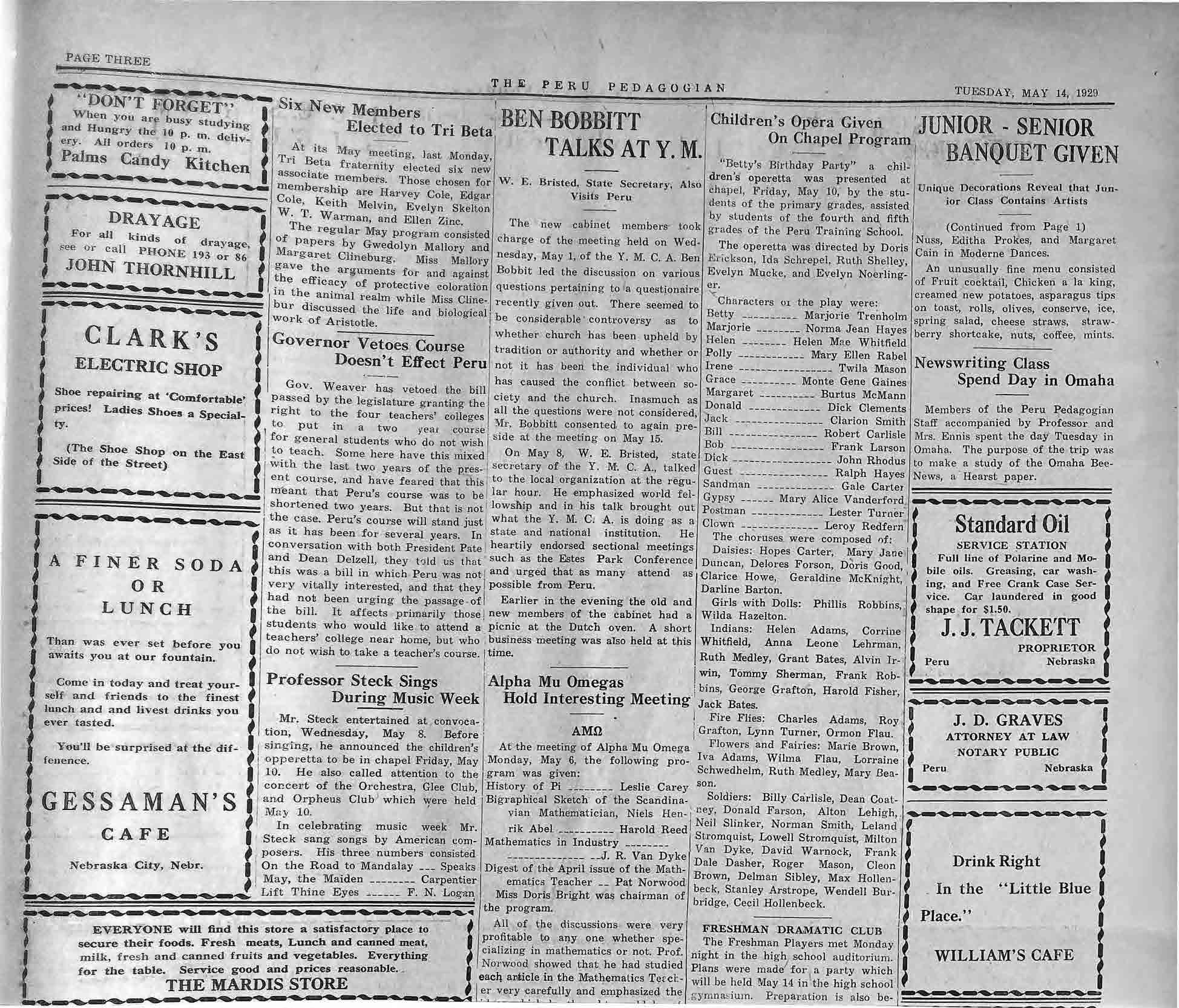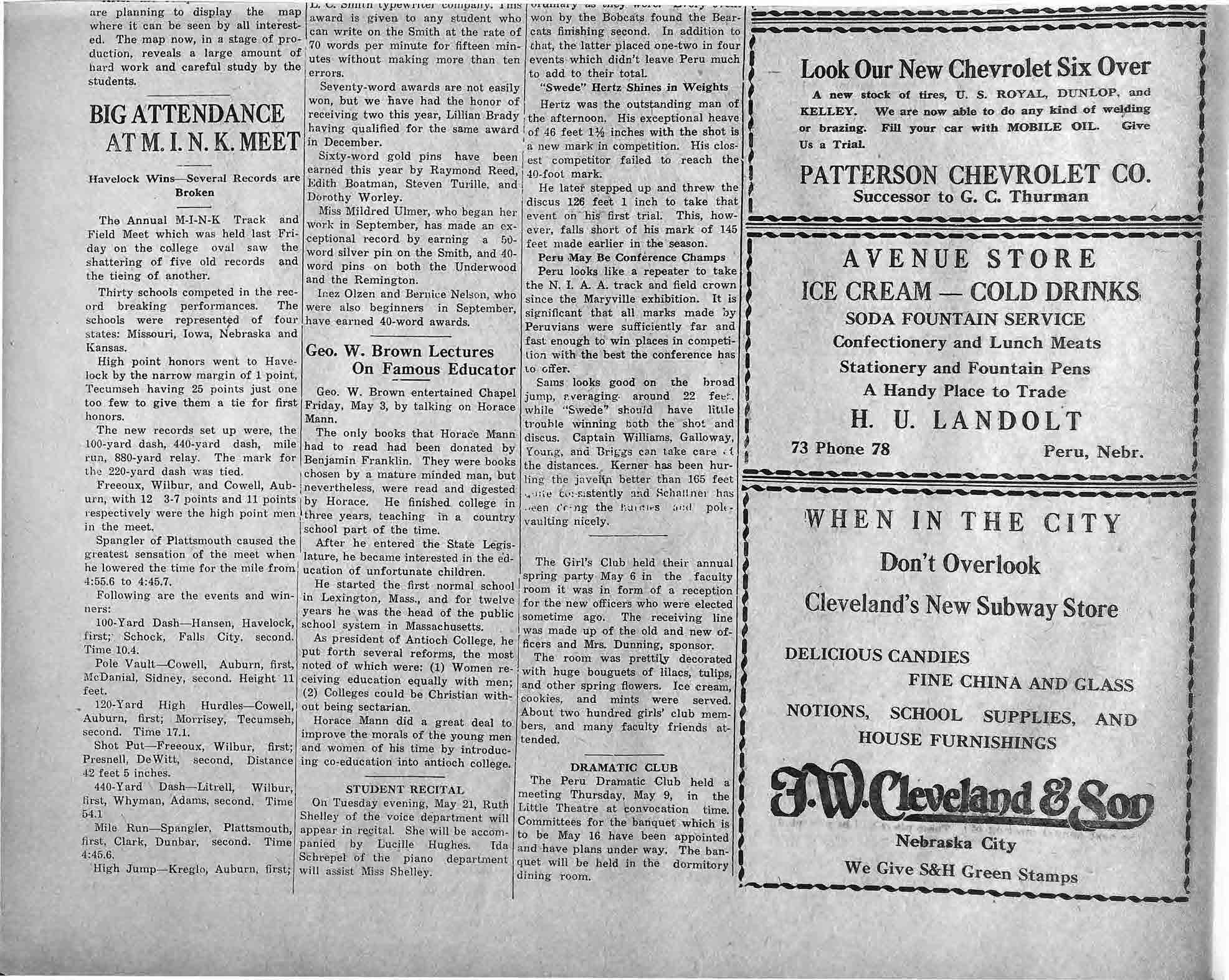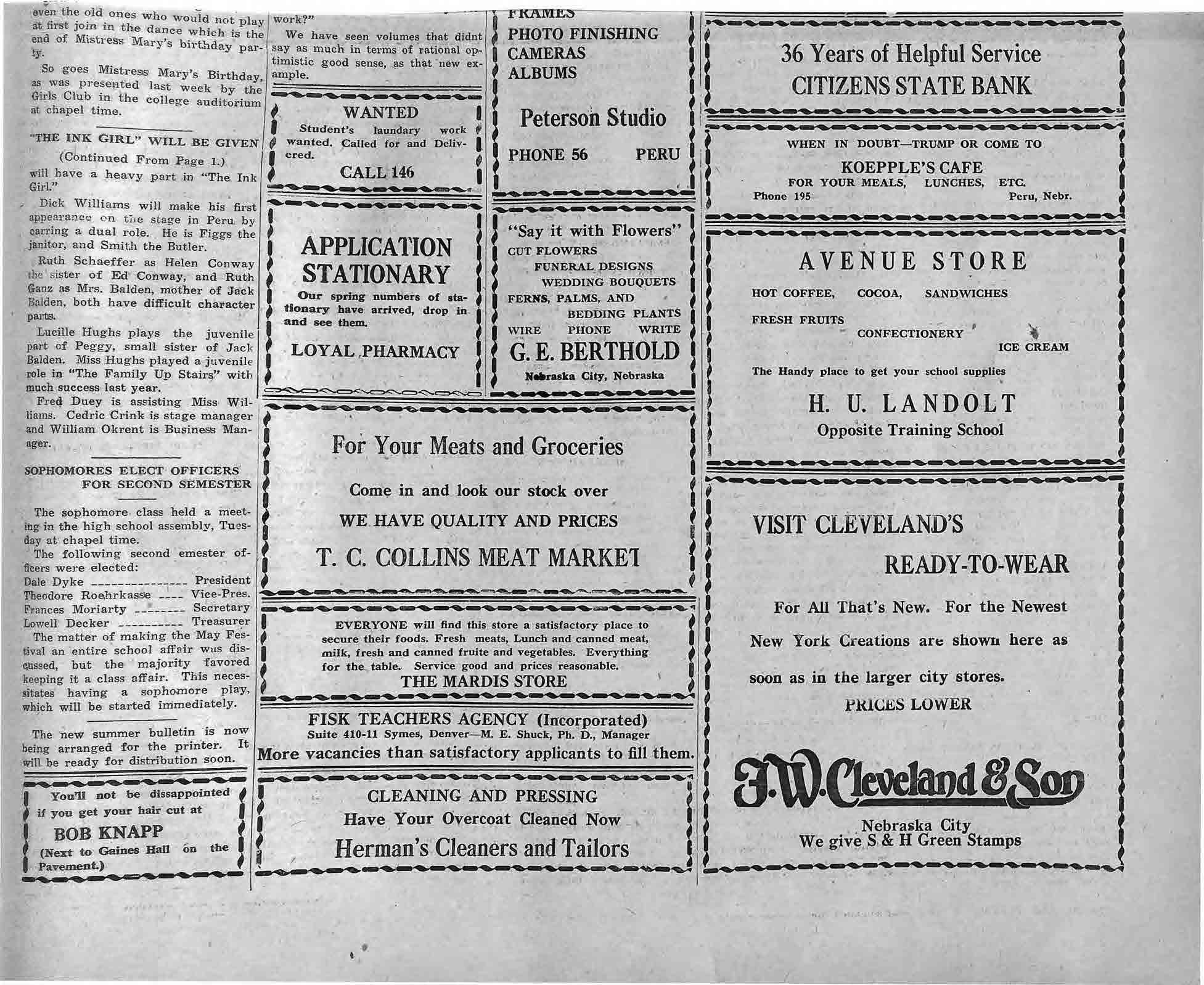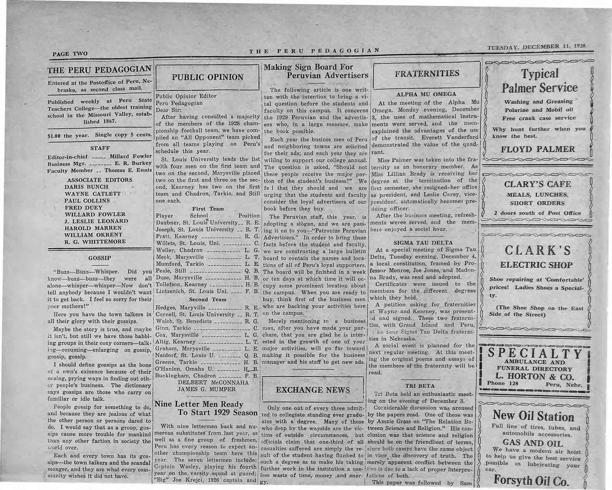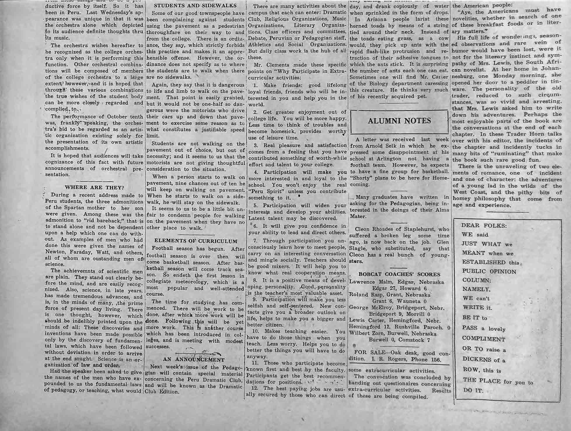 What does the aven1g e Co-ed come According to God's plans H d h' r I d · 1 J e was particularly inter es te on t is were se a e m a arge envelove and ' NING ' to co lle!!e for? Yo u say tha t "a To g rac·e the home her task shall be '- f I d" h' f · t h 'th d MANUAL TRAI trip in t e grav e o an n ian c 1e , g iven o w1 or ers not to open I w man w-0u'ld starge to death in the To win. the bre ad the man's. in the buffs below tow n. He was brot t hem un ti l she got to Ste amboat I home t.hese days and have fewer ' to Peru by T. J. Long, of the Nebras- Sprin gs, Colorado- then to on ly LUMBER ' cloth.es" so i.t is assumed that. t he wolf So greetin gs to you sister ka Ci ty Ph arma "'y. Conc erning this. one a day. Marguerite Gr aves, El sie's ' ""' LACQUER, ENAMEL is at t he door. Clothes - Yo u need May yo u gain fame and r enow n, work of Mr. Blackman, The Nebraska ro om-mate dese rves a ll the credit for not have mentioned clot hes. An edu - And you may tramp Ulp oin our necks qty News-Press of We dnesday says : this farewell party. ' PAINTS I cation for clothes to y0tur j But _YO U can't keep a g ood man down. "E. E. B.lackman. curator of the I COAL COAL ' o wn sta tements! 'ifhere1n hes the e x- . - By Heck. Nebr asklll State Historical Society Geor ge Abe '27, is av is- ; plan atio1;1 of the word diverse. What museum, who for the past 30 years itor on the Peru campus. MacElro y I PERU LUMBER CO. does the man come to colle ge for? To "BLOWSERS" AND "WOWSERS" has been connected with th€ org a niza- coac hed at Brid geport, N eb., last year w. J. RABEL, Mgr. J better ,himself' an d .the immediate SO'- Headw ay · is at l ast bein g made by tiori in exiploring former stampin g and will return to Br id g eport t hi s Phone 48 Peru, Nebr. ciety in which he lives. You have the gallant pion eers str u ggling to im- gro unds od' vario us Indi an t rib es, will fall to continue coachin g. Abe was J done many an inju s tive be- Iprove the idiotic dre ss that men p ut do some in v es'tigati.oill work along the a star on the Bobcat