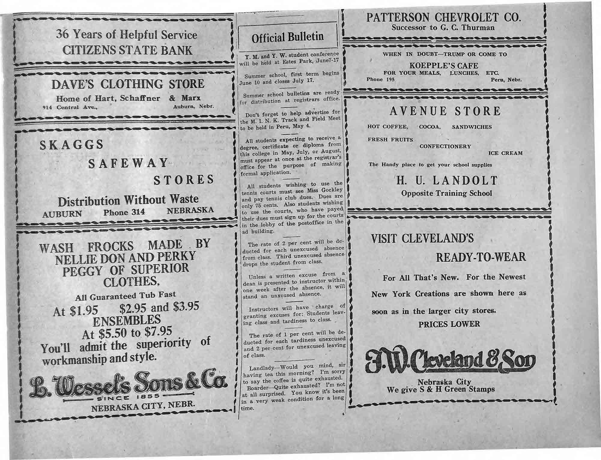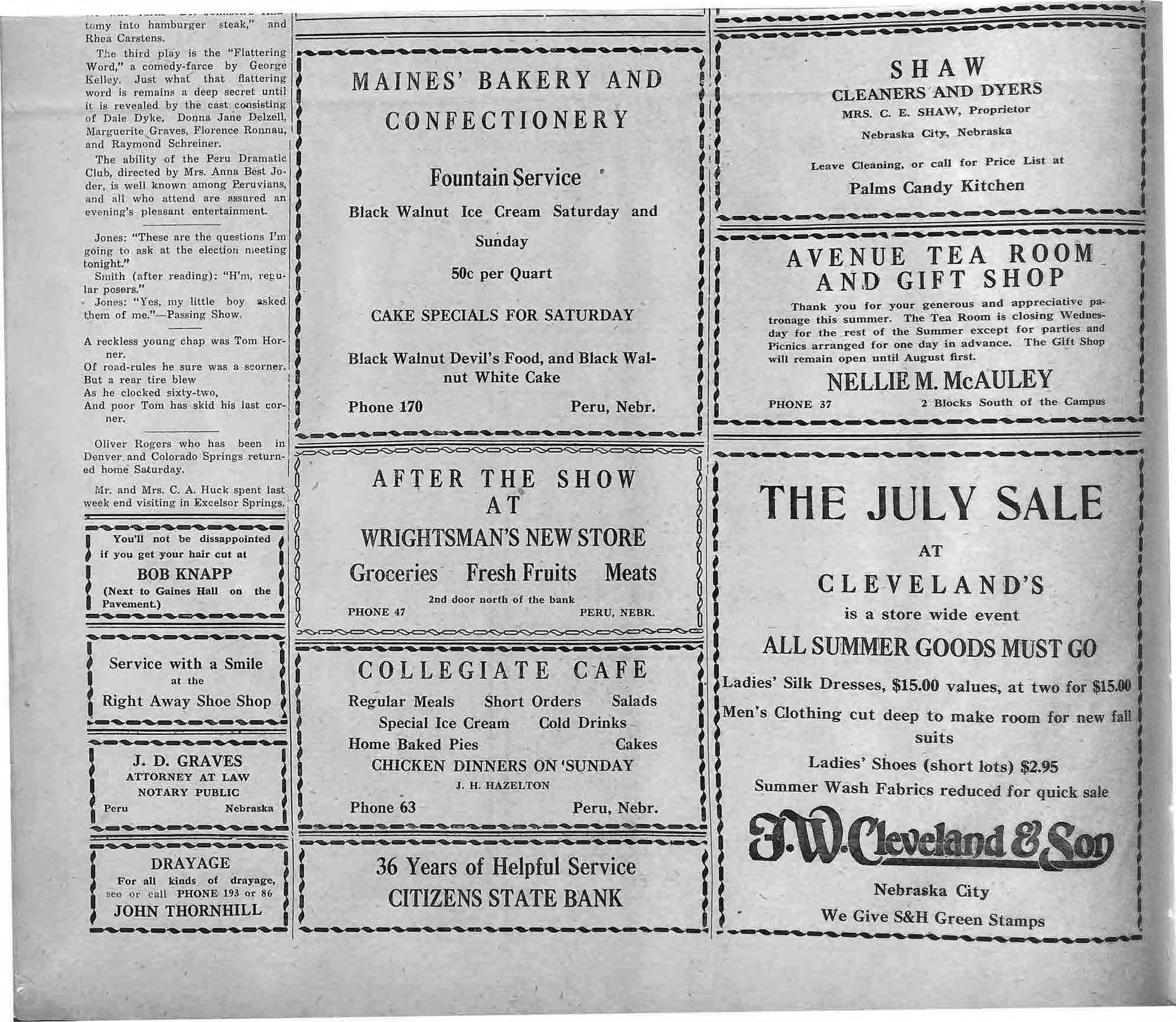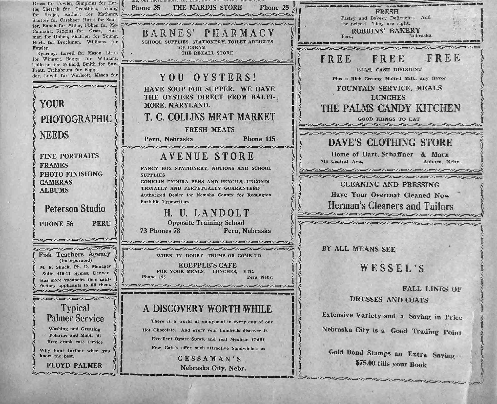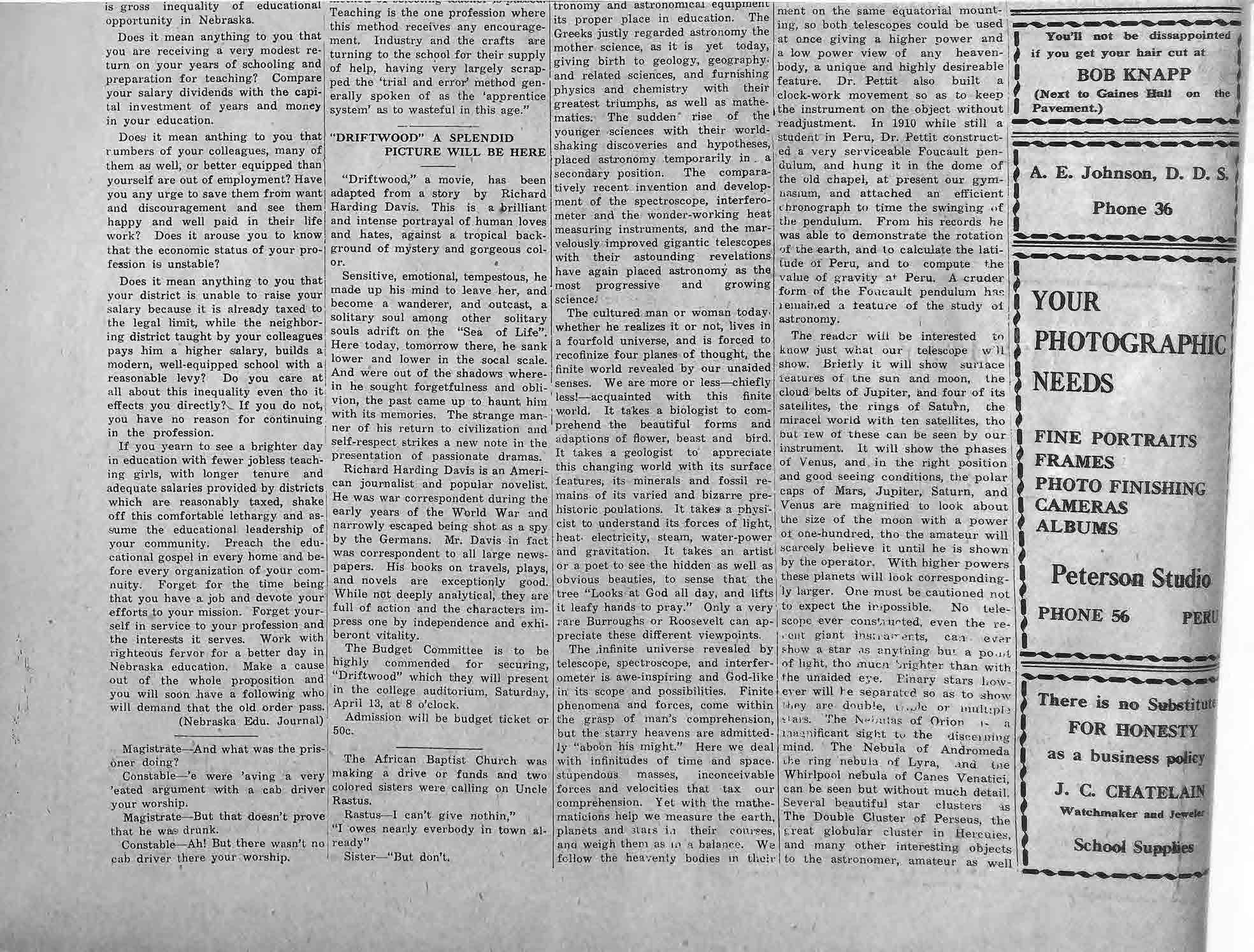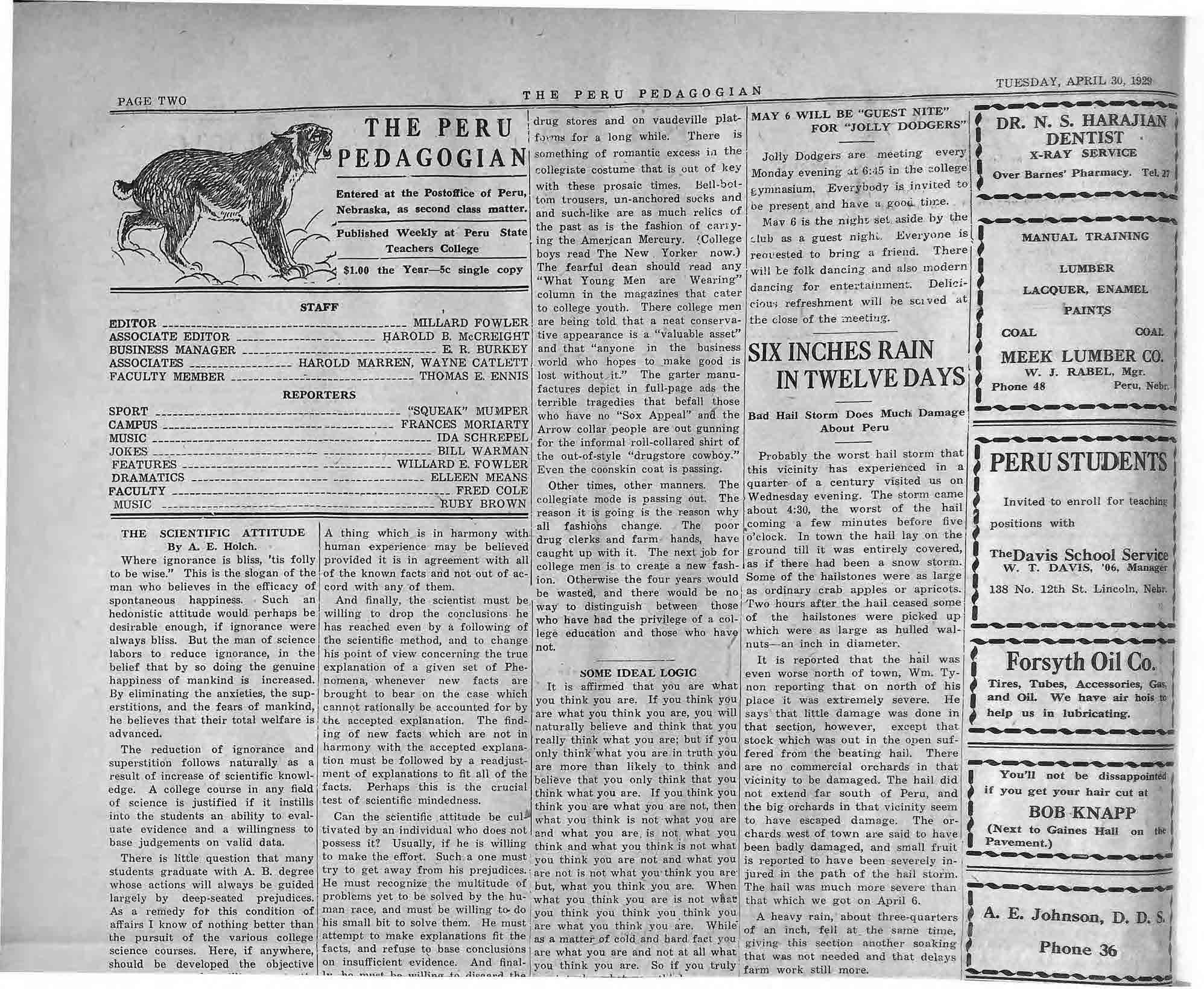 What does the aven1g e Co-ed come According to God's plans H d h' r I d · 1 J e was particularly inter es te on t is were se a e m a arge envelove and ' NING ' to co lle!!e for? Yo u say tha t "a To g rac·e the home her task shall be '- f I d" h' f · t h 'th d MANUAL TRAI trip in t e grav e o an n ian c 1e , g iven o w1 or ers not to open I w man w-0u'ld starge to death in the To win. the bre ad the man's. in the buffs below tow n. He was brot t hem un ti l she got to Ste amboat I home t.hese days and have fewer ' to Peru by T. J. Long, of the Nebras- Sprin gs, Colorado- then to on ly LUMBER ' cloth.es" so i.t is assumed that. t he wolf So greetin gs to you sister ka Ci ty Ph arma "'y. Conc erning this. one a day. Marguerite Gr aves, El sie's ' ""' LACQUER, ENAMEL is at t he door. Clothes - Yo u need May yo u gain fame and r enow n, work of Mr. Blackman, The Nebraska ro om-mate dese rves a ll the credit for not have mentioned clot hes. An edu - And you may tramp Ulp oin our necks qty News-Press of We dnesday says : this farewell party. ' PAINTS I cation for clothes to y0tur j But _YO U can't keep a g ood man down. "E. E. B.lackman. curator of the I COAL COAL ' o wn sta tements! 'ifhere1n hes the e x- . - By Heck. Nebr asklll State Historical Society Geor ge Abe '27, is av is- ; plan atio1;1 of the word diverse. What museum, who for the past 30 years itor on the Peru campus. MacElro y I PERU LUMBER CO. does the man come to colle ge for? To "BLOWSERS" AND "WOWSERS" has been connected with th€ org a niza- coac hed at Brid geport, N eb., last year w. J. RABEL, Mgr. J better ,himself' an d .the immediate SO'- Headw ay · is at l ast bein g made by tiori in exiploring former stampin g and will return to Br id g eport t hi s Phone 48 Peru, Nebr. ciety in which he lives. You have the gallant pion eers str u ggling to im- gro unds od' vario us Indi an t rib es, will fall to continue coachin g. Abe was J done many an inju s tive be- Iprove the idiotic dre ss that men p ut do some in v es'tigati.oill work along the a star on the Bobcat