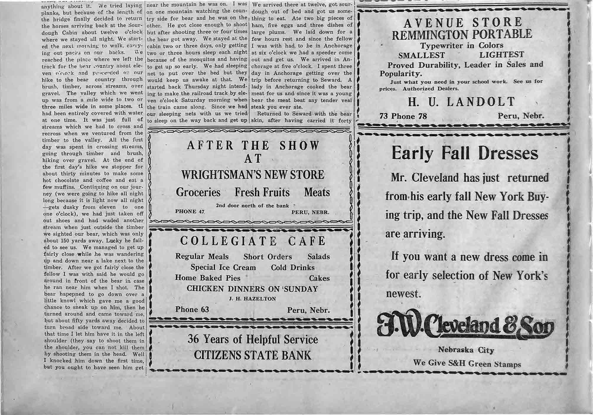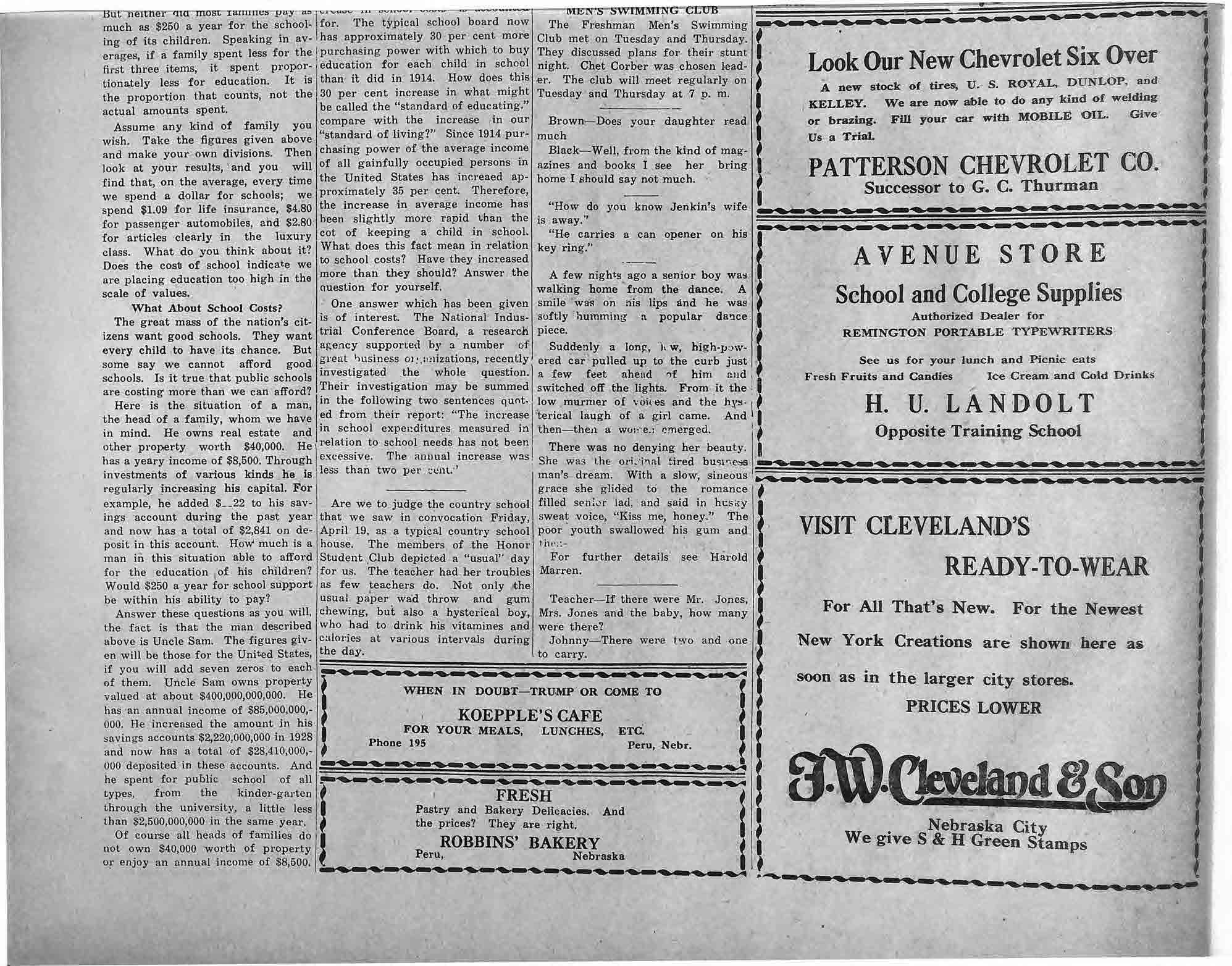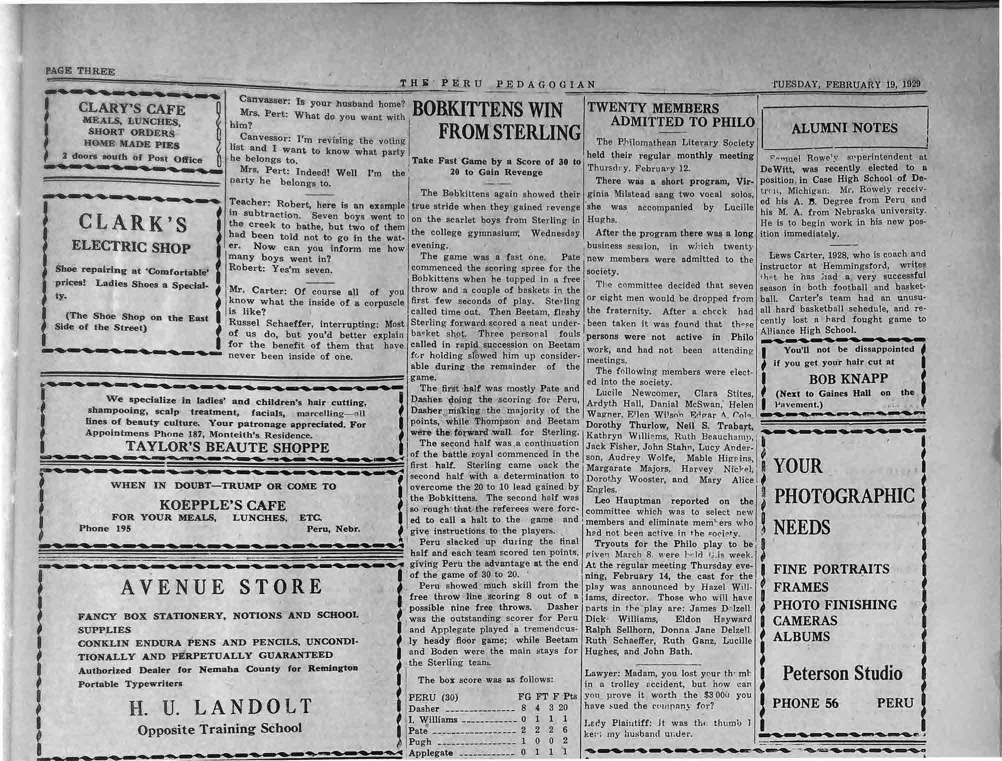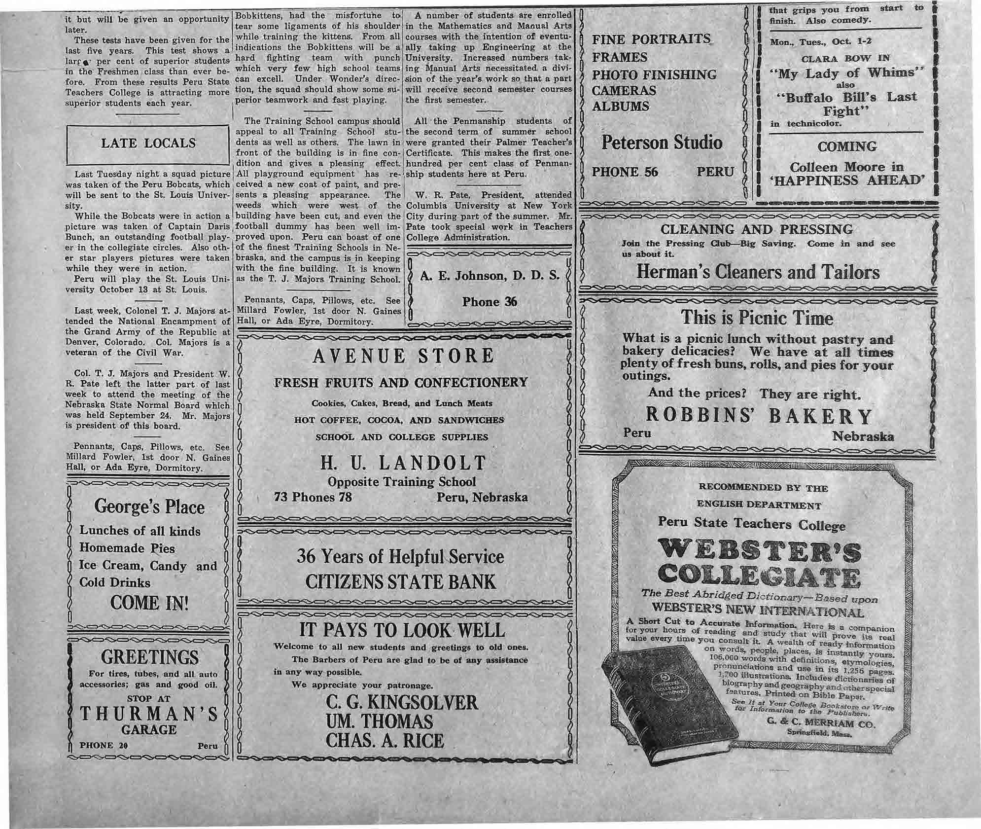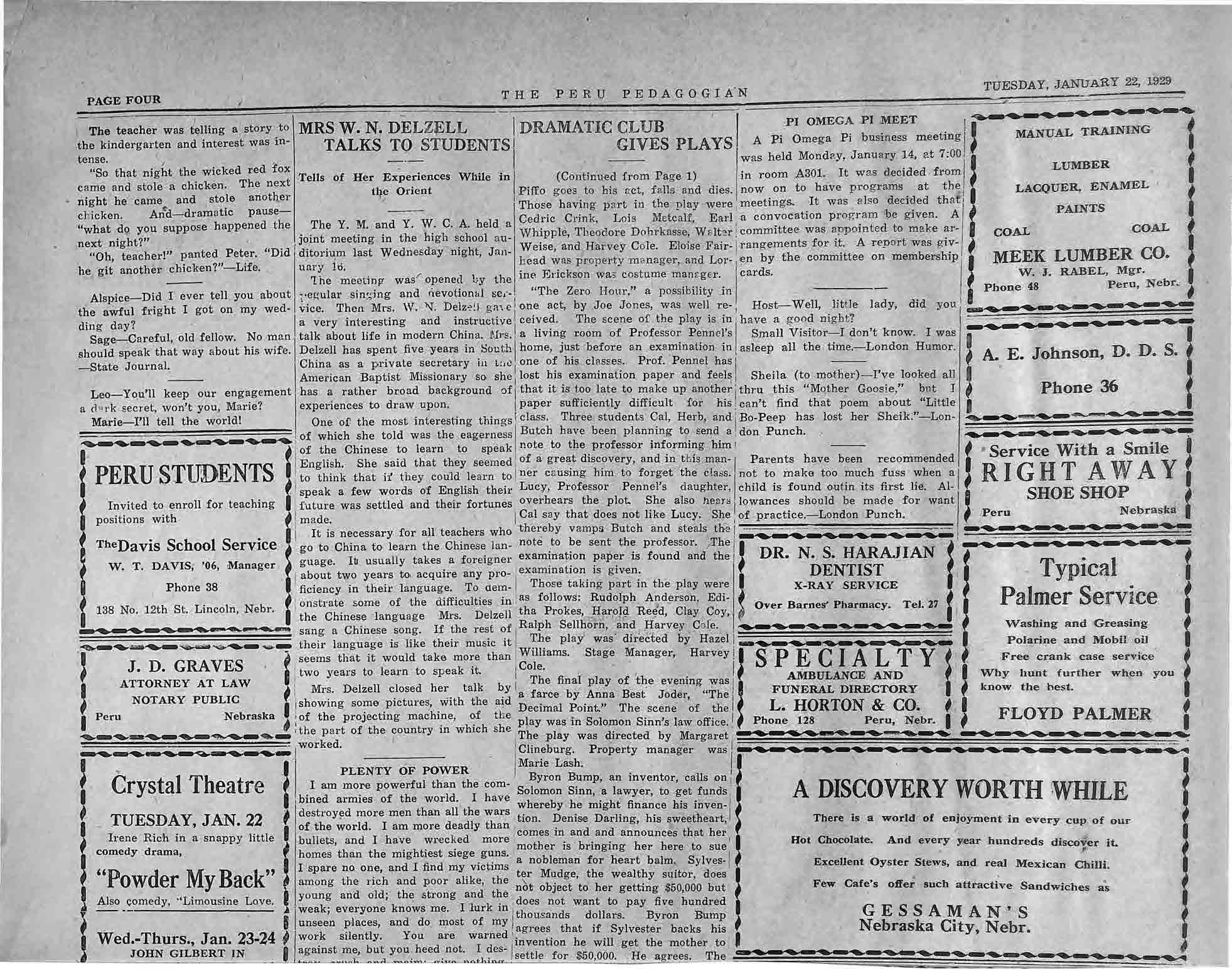 What does the aven1g e Co-ed come According to God's plans H d h' r I d · 1 J e was particularly inter es te on t is were se a e m a arge envelove and ' NING ' to co lle!!e for? Yo u say tha t "a To g rac·e the home her task shall be '- f I d" h' f · t h 'th d MANUAL TRAI trip in t e grav e o an n ian c 1e , g iven o w1 or ers not to open I w man w-0u'ld starge to death in the To win. the bre ad the man's. in the buffs below tow n. He was brot t hem un ti l she got to Ste amboat I home t.hese days and have fewer ' to Peru by T. J. Long, of the Nebras- Sprin gs, Colorado- then to on ly LUMBER ' cloth.es" so i.t is assumed that. t he wolf So greetin gs to you sister ka Ci ty Ph arma "'y. Conc erning this. one a day. Marguerite Gr aves, El sie's ' ""' LACQUER, ENAMEL is at t he door. Clothes - Yo u need May yo u gain fame and r enow n, work of Mr. Blackman, The Nebraska ro om-mate dese rves a ll the credit for not have mentioned clot hes. An edu - And you may tramp Ulp oin our necks qty News-Press of We dnesday says : this farewell party. ' PAINTS I cation for clothes to y0tur j But _YO U can't keep a g ood man down. "E. E. B.lackman. curator of the I COAL COAL ' o wn sta tements! 'ifhere1n hes the e x- . - By Heck. Nebr asklll State Historical Society Geor ge Abe '27, is av is- ; plan atio1;1 of the word diverse. What museum, who for the past 30 years itor on the Peru campus. MacElro y I PERU LUMBER CO. does the man come to colle ge for? To "BLOWSERS" AND "WOWSERS" has been connected with th€ org a niza- coac hed at Brid geport, N eb., last year w. J. RABEL, Mgr. J better ,himself' an d .the immediate SO'- Headw ay · is at l ast bein g made by tiori in exiploring former stampin g and will return to Br id g eport t hi s Phone 48 Peru, Nebr. ciety in which he lives. You have the gallant pion eers str u ggling to im- gro unds od' vario us Indi an t rib es, will fall to continue coachin g. Abe was J done many an inju s tive be- Iprove the idiotic dre ss that men p ut do some in v es'tigati.oill work along the a star on the Bobcat
