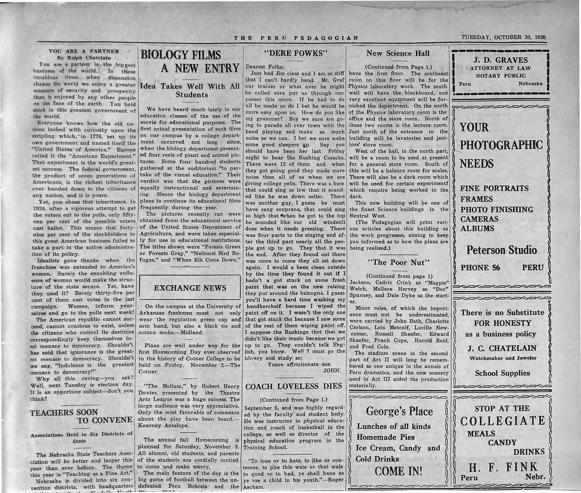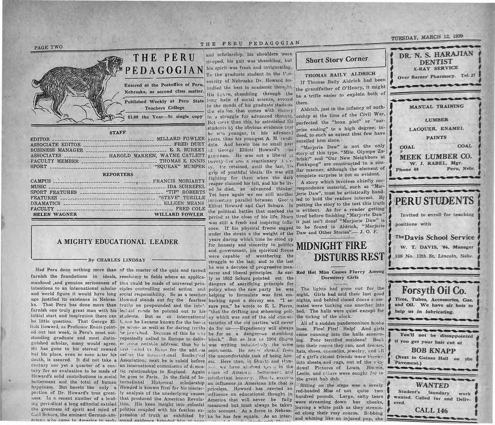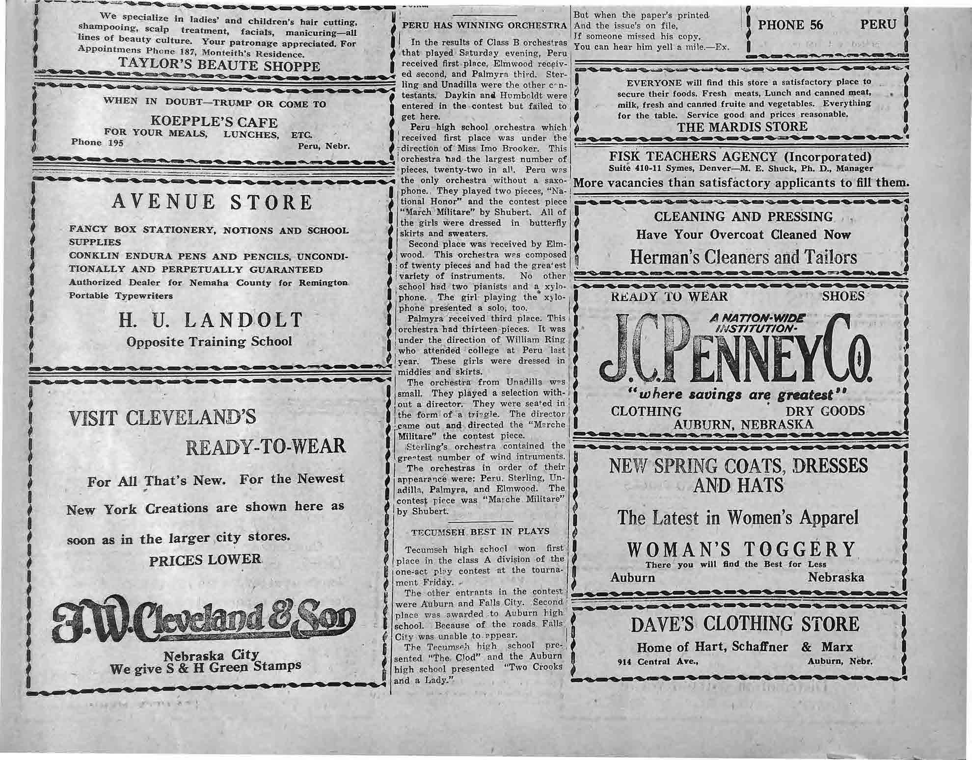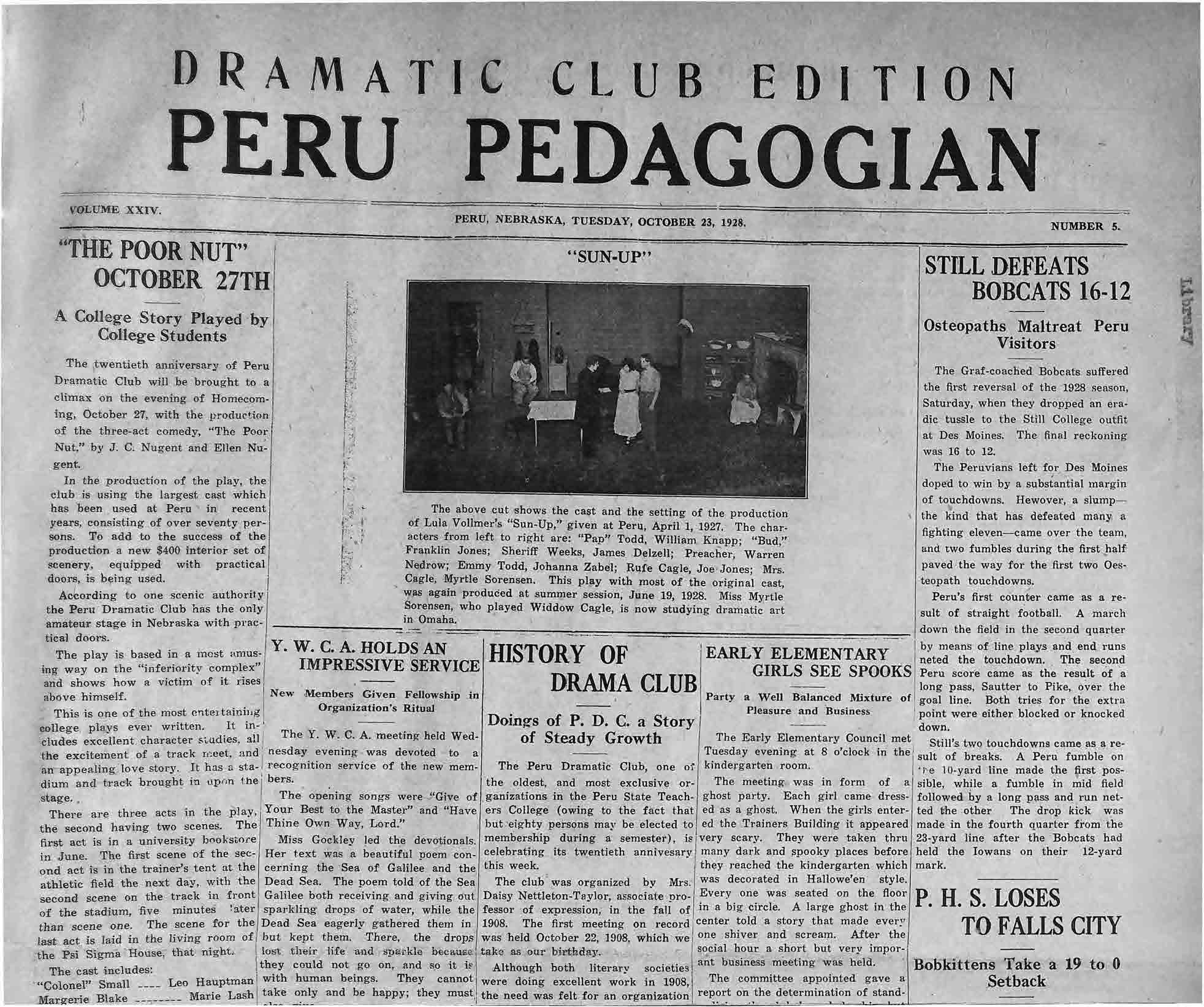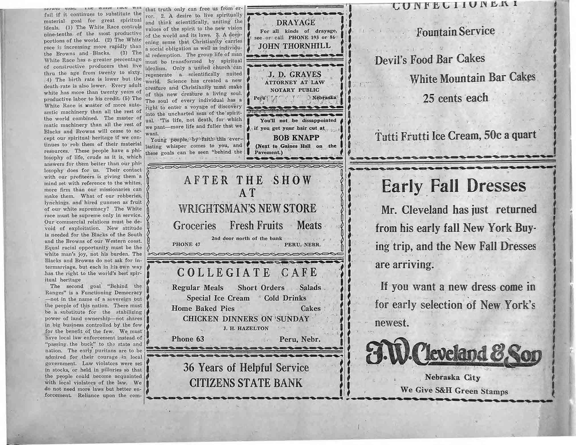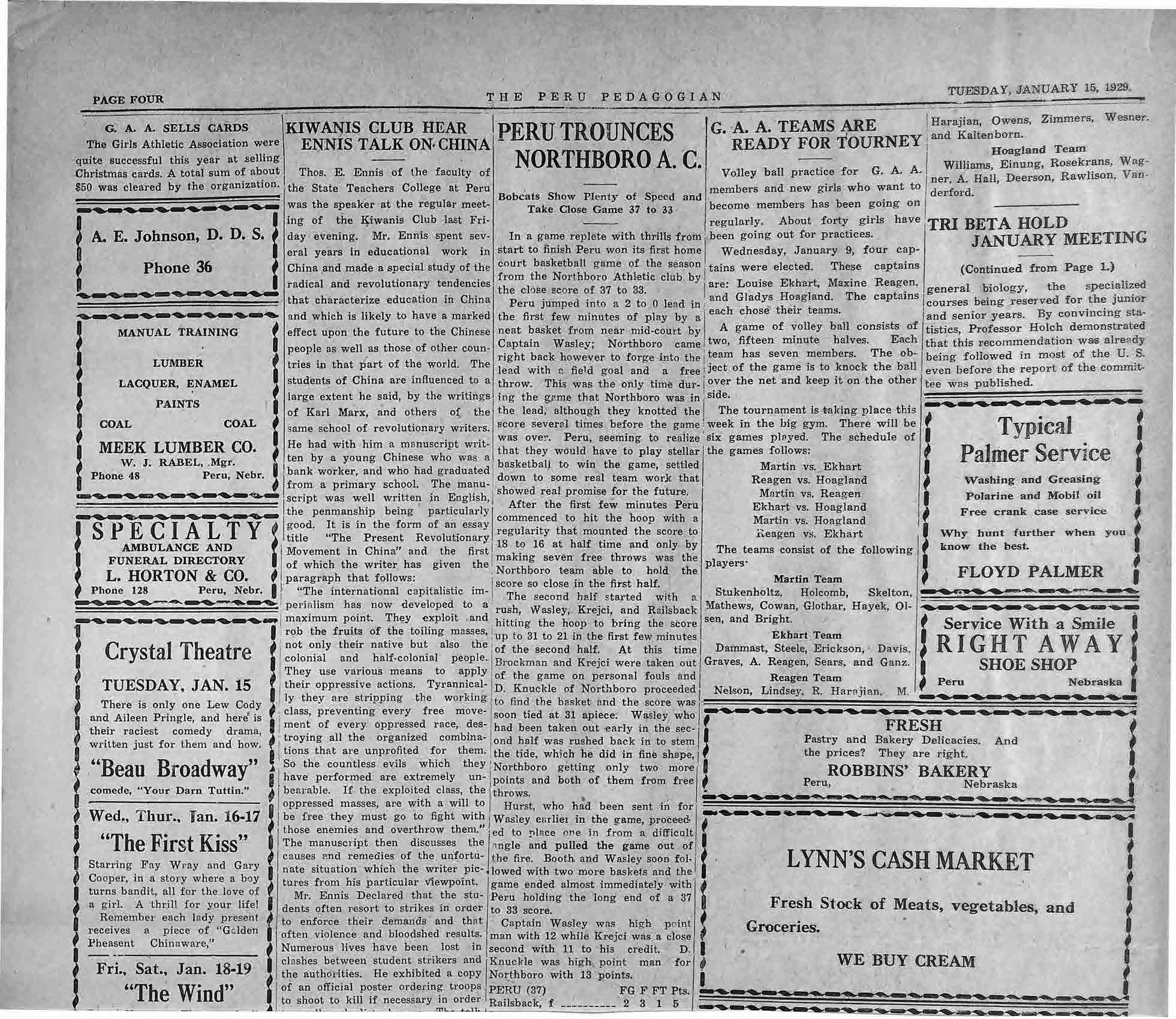 What does the aven1g e Co-ed come According to God's plans H d h' r I d · 1 J e was particularly inter es te on t is were se a e m a arge envelove and ' NING ' to co lle!!e for? Yo u say tha t "a To g rac·e the home her task shall be '- f I d" h' f · t h 'th d MANUAL TRAI trip in t e grav e o an n ian c 1e , g iven o w1 or ers not to open I w man w-0u'ld starge to death in the To win. the bre ad the man's. in the buffs below tow n. He was brot t hem un ti l she got to Ste amboat I home t.hese days and have fewer ' to Peru by T. J. Long, of the Nebras- Sprin gs, Colorado- then to on ly LUMBER ' cloth.es" so i.t is assumed that. t he wolf So greetin gs to you sister ka Ci ty Ph arma "'y. Conc erning this. one a day. Marguerite Gr aves, El sie's ' ""' LACQUER, ENAMEL is at t he door. Clothes - Yo u need May yo u gain fame and r enow n, work of Mr. Blackman, The Nebraska ro om-mate dese rves a ll the credit for not have mentioned clot hes. An edu - And you may tramp Ulp oin our necks qty News-Press of We dnesday says : this farewell party. ' PAINTS I cation for clothes to y0tur j But _YO U can't keep a g ood man down. "E. E. B.lackman. curator of the I COAL COAL ' o wn sta tements! 'ifhere1n hes the e x- . - By Heck. Nebr asklll State Historical Society Geor ge Abe '27, is av is- ; plan atio1;1 of the word diverse. What museum, who for the past 30 years itor on the Peru campus. MacElro y I PERU LUMBER CO. does the man come to colle ge for? To "BLOWSERS" AND "WOWSERS" has been connected with th€ org a niza- coac hed at Brid geport, N eb., last year w. J. RABEL, Mgr. J better ,himself' an d .the immediate SO'- Headw ay · is at l ast bein g made by tiori in exiploring former stampin g and will return to Br id g eport t hi s Phone 48 Peru, Nebr. ciety in which he lives. You have the gallant pion eers str u ggling to im- gro unds od' vario us Indi an t rib es, will fall to continue coachin g. Abe was J done many an inju s tive be- Iprove the idiotic dre ss that men p ut do some in v es'tigati.oill work along the a star on the Bobcat