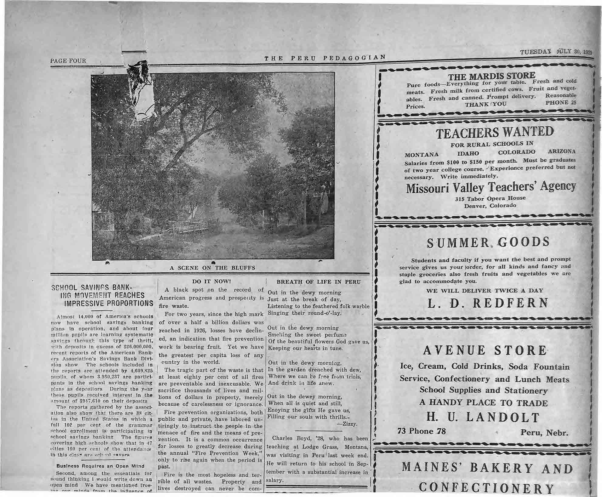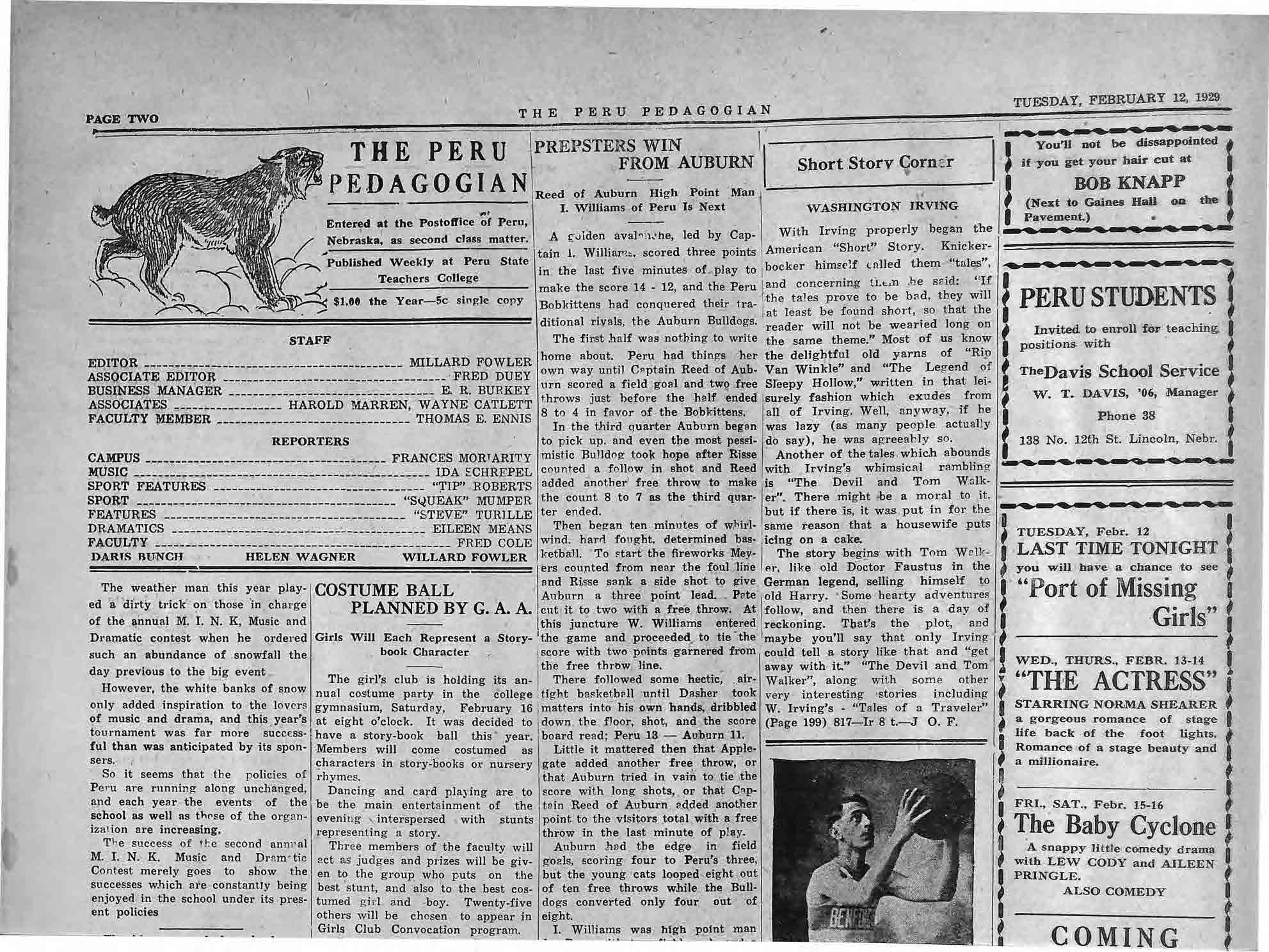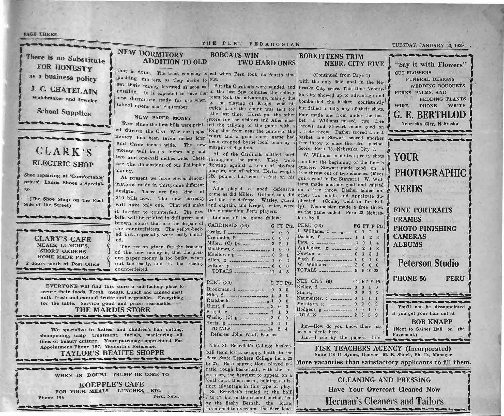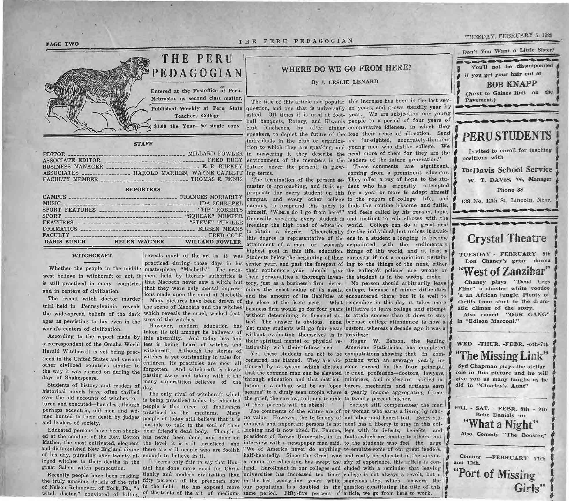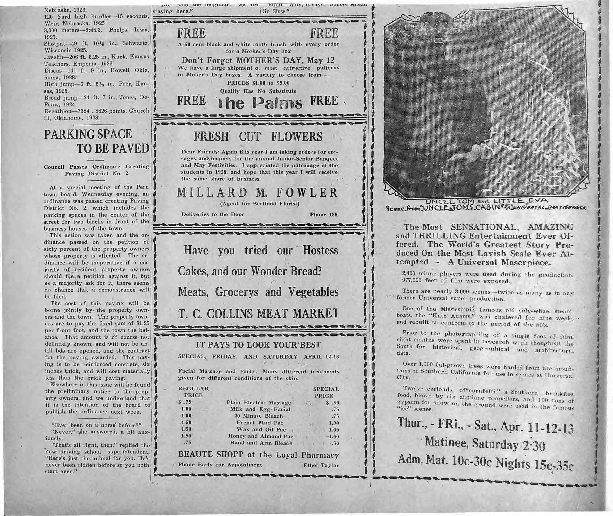 What does the aven1g e Co-ed come According to God's plans H d h' r I d · 1 J e was particularly inter es te on t is were se a e m a arge envelove and ' NING ' to co lle!!e for? Yo u say tha t "a To g rac·e the home her task shall be '- f I d" h' f · t h 'th d MANUAL TRAI trip in t e grav e o an n ian c 1e , g iven o w1 or ers not to open I w man w-0u'ld starge to death in the To win. the bre ad the man's. in the buffs below tow n. He was brot t hem un ti l she got to Ste amboat I home t.hese days and have fewer ' to Peru by T. J. Long, of the Nebras- Sprin gs, Colorado- then to on ly LUMBER ' cloth.es" so i.t is assumed that. t he wolf So greetin gs to you sister ka Ci ty Ph arma "'y. Conc erning this. one a day. Marguerite Gr aves, El sie's ' ""' LACQUER, ENAMEL is at t he door. Clothes - Yo u need May yo u gain fame and r enow n, work of Mr. Blackman, The Nebraska ro om-mate dese rves a ll the credit for not have mentioned clot hes. An edu - And you may tramp Ulp oin our necks qty News-Press of We dnesday says : this farewell party. ' PAINTS I cation for clothes to y0tur j But _YO U can't keep a g ood man down. "E. E. B.lackman. curator of the I COAL COAL ' o wn sta tements! 'ifhere1n hes the e x- . - By Heck. Nebr asklll State Historical Society Geor ge Abe '27, is av is- ; plan atio1;1 of the word diverse. What museum, who for the past 30 years itor on the Peru campus. MacElro y I PERU LUMBER CO. does the man come to colle ge for? To "BLOWSERS" AND "WOWSERS" has been connected with th€ org a niza- coac hed at Brid geport, N eb., last year w. J. RABEL, Mgr. J better ,himself' an d .the immediate SO'- Headw ay · is at l ast bein g made by tiori in exiploring former stampin g and will return to Br id g eport t hi s Phone 48 Peru, Nebr. ciety in which he lives. You have the gallant pion eers str u ggling to im- gro unds od' vario us Indi an t rib es, will fall to continue coachin g. Abe was J done many an inju s tive be- Iprove the idiotic dre ss that men p ut do some in v es'tigati.oill work along the a star on the Bobcat