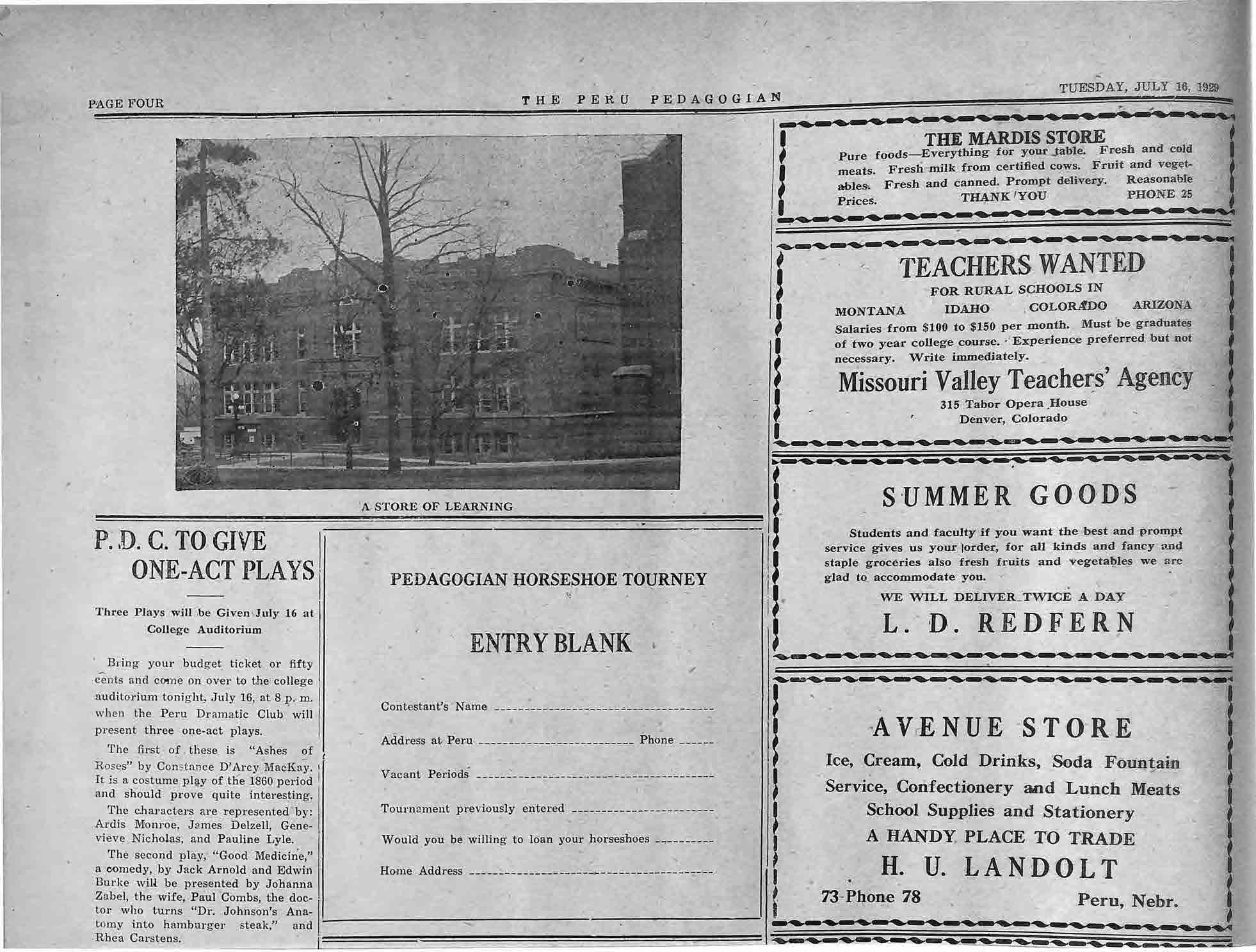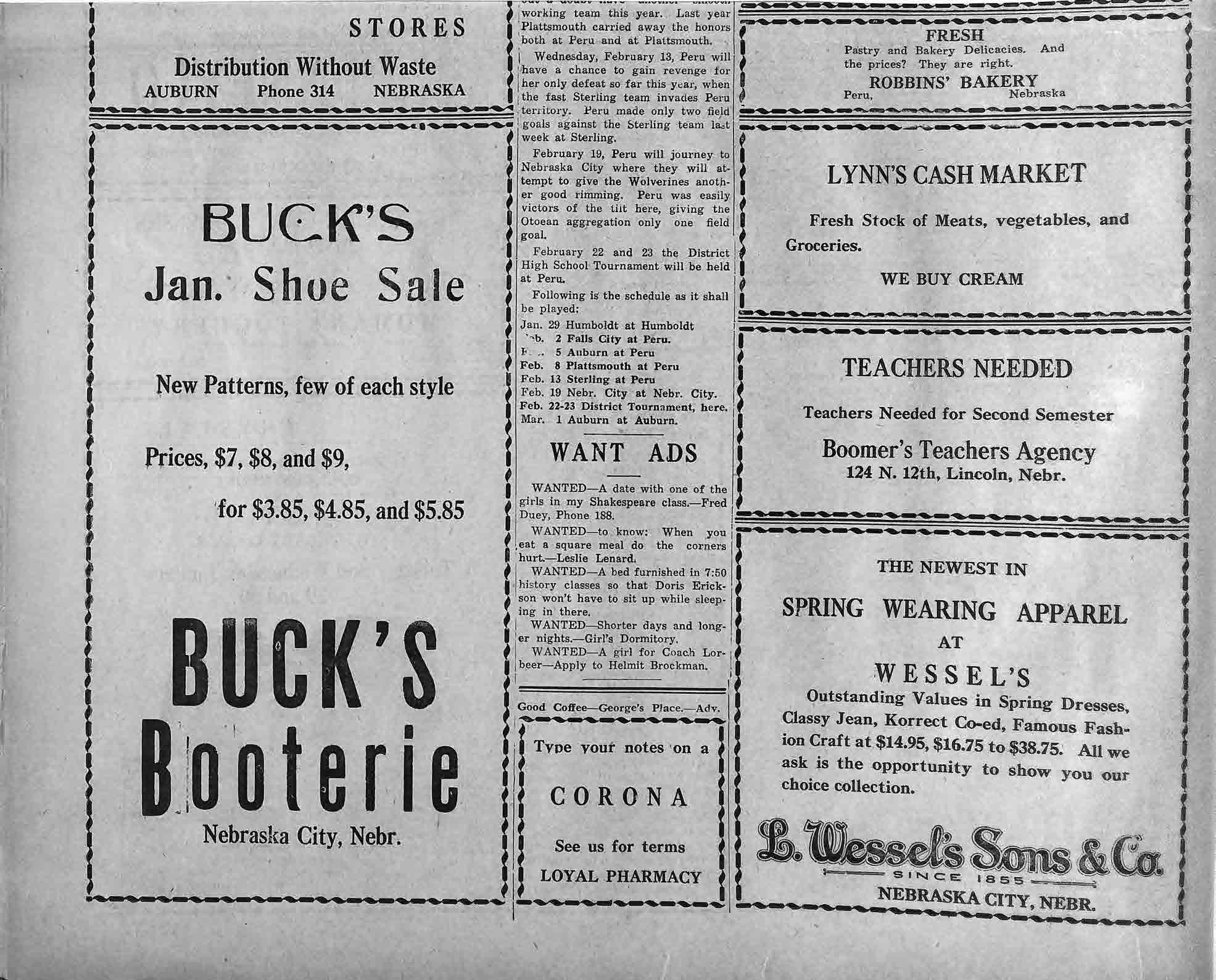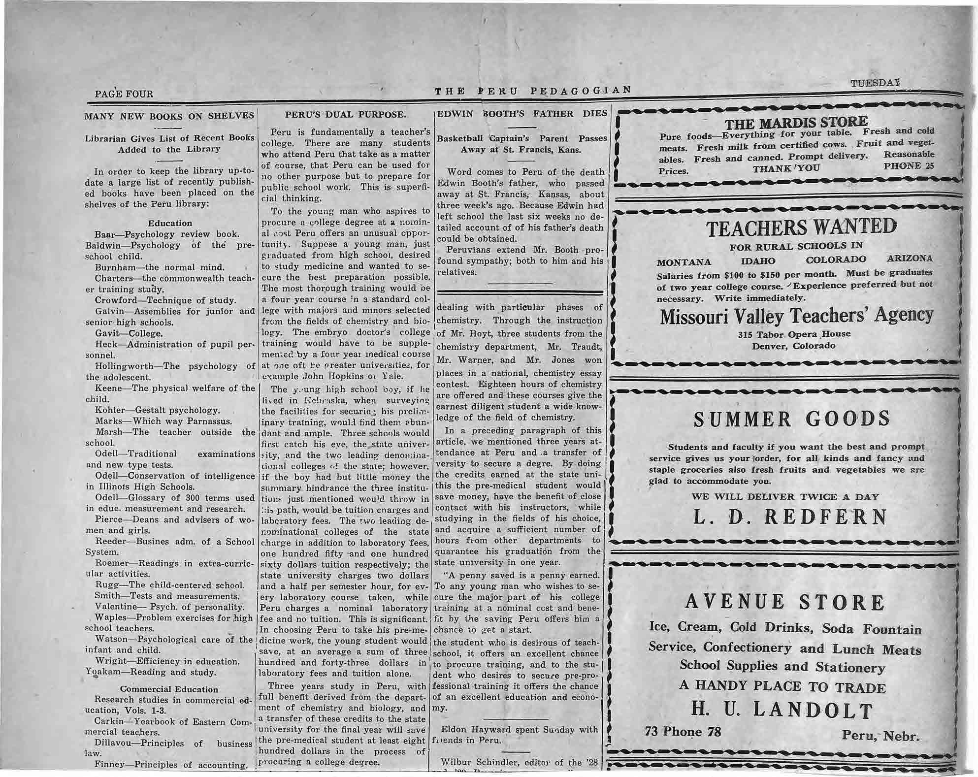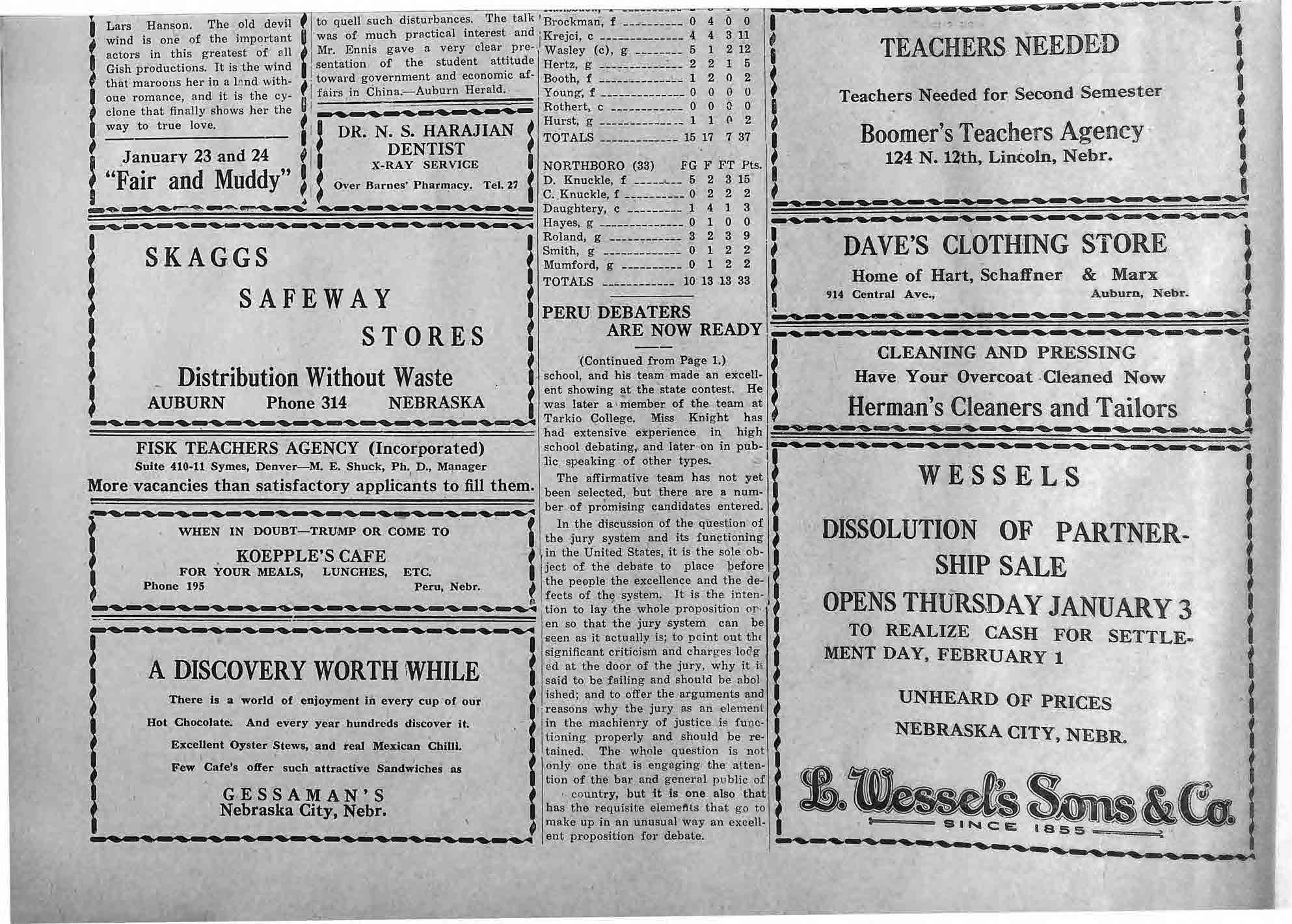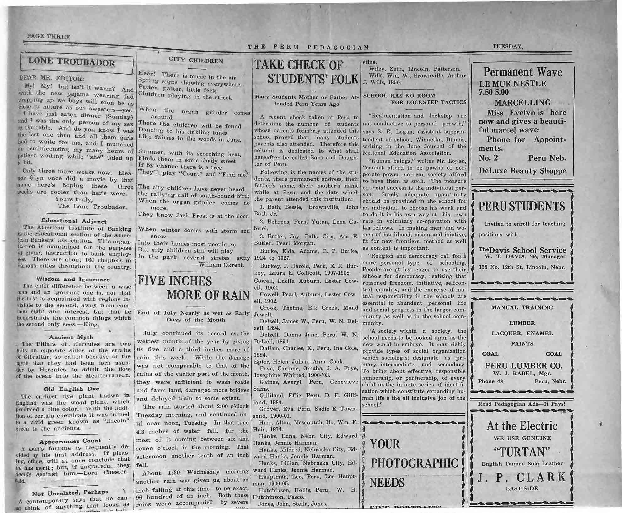 What does the aven1g e Co-ed come According to God's plans H d h' r I d · 1 J e was particularly inter es te on t is were se a e m a arge envelove and ' NING ' to co lle!!e for? Yo u say tha t "a To g rac·e the home her task shall be '- f I d" h' f · t h 'th d MANUAL TRAI trip in t e grav e o an n ian c 1e , g iven o w1 or ers not to open I w man w-0u'ld starge to death in the To win. the bre ad the man's. in the buffs below tow n. He was brot t hem un ti l she got to Ste amboat I home t.hese days and have fewer ' to Peru by T. J. Long, of the Nebras- Sprin gs, Colorado- then to on ly LUMBER ' cloth.es" so i.t is assumed that. t he wolf So greetin gs to you sister ka Ci ty Ph arma "'y. Conc erning this. one a day. Marguerite Gr aves, El sie's ' ""' LACQUER, ENAMEL is at t he door. Clothes - Yo u need May yo u gain fame and r enow n, work of Mr. Blackman, The Nebraska ro om-mate dese rves a ll the credit for not have mentioned clot hes. An edu - And you may tramp Ulp oin our necks qty News-Press of We dnesday says : this farewell party. ' PAINTS I cation for clothes to y0tur j But _YO U can't keep a g ood man down. "E. E. B.lackman. curator of the I COAL COAL ' o wn sta tements! 'ifhere1n hes the e x- . - By Heck. Nebr asklll State Historical Society Geor ge Abe '27, is av is- ; plan atio1;1 of the word diverse. What museum, who for the past 30 years itor on the Peru campus. MacElro y I PERU LUMBER CO. does the man come to colle ge for? To "BLOWSERS" AND "WOWSERS" has been connected with th€ org a niza- coac hed at Brid geport, N eb., last year w. J. RABEL, Mgr. J better ,himself' an d .the immediate SO'- Headw ay · is at l ast bein g made by tiori in exiploring former stampin g and will return to Br id g eport t hi s Phone 48 Peru, Nebr. ciety in which he lives. You have the gallant pion eers str u ggling to im- gro unds od' vario us Indi an t rib es, will fall to continue coachin g. Abe was J done many an inju s tive be- Iprove the idiotic dre ss that men p ut do some in v es'tigati.oill work along the a star on the Bobcat