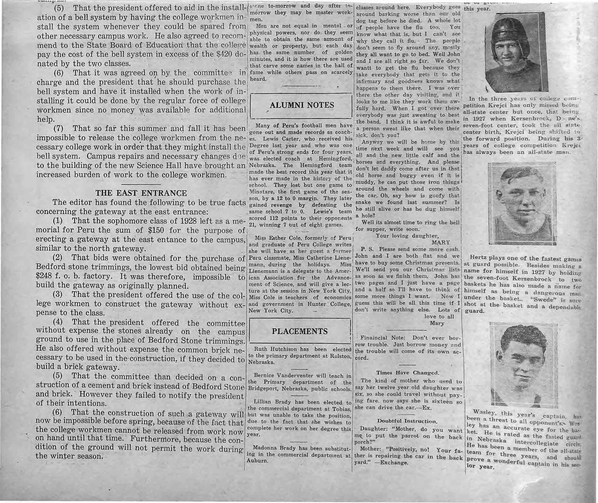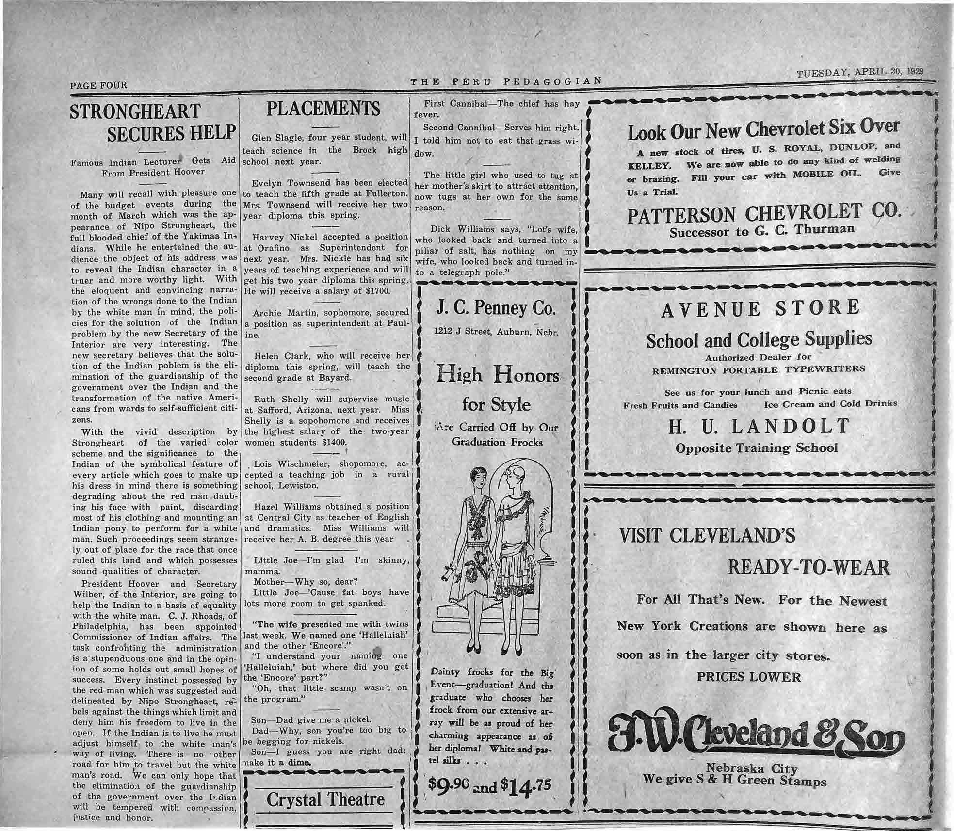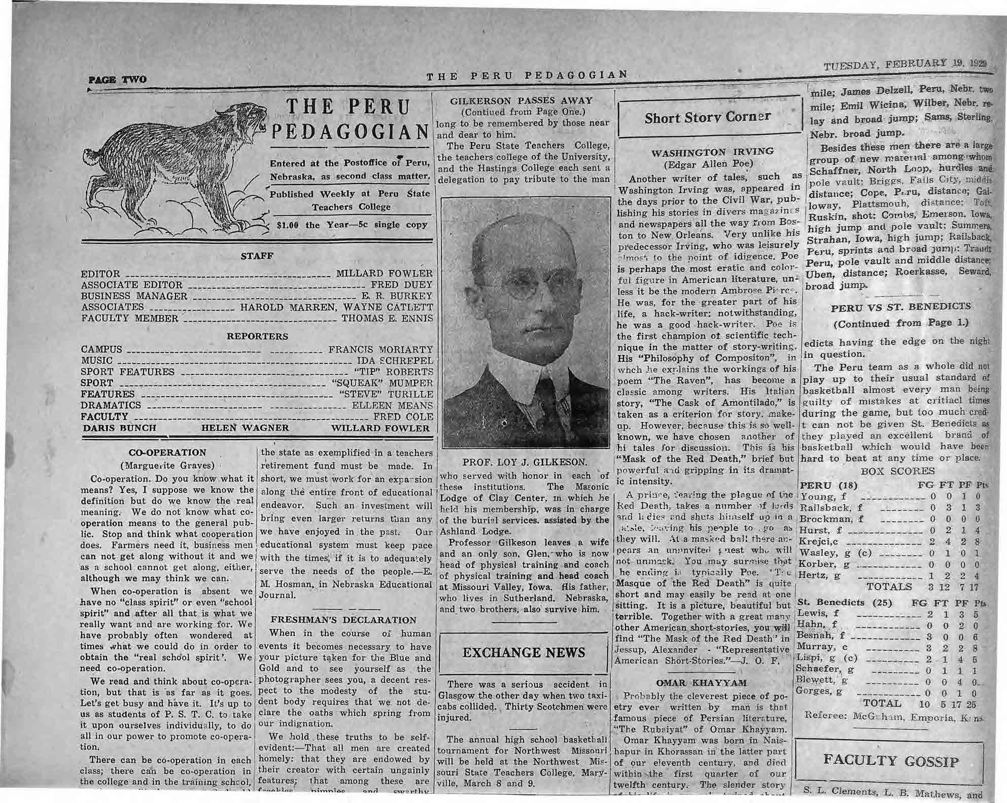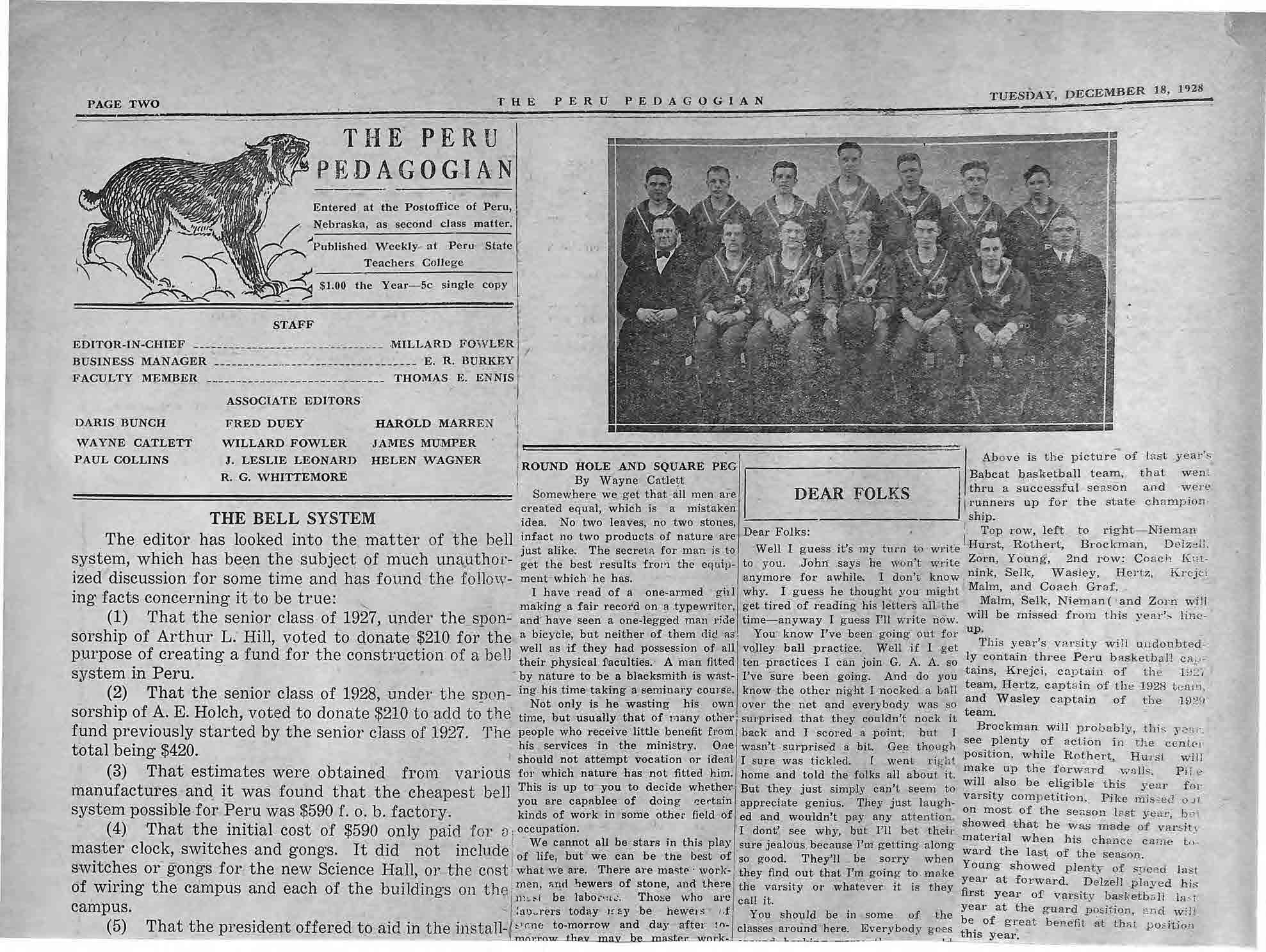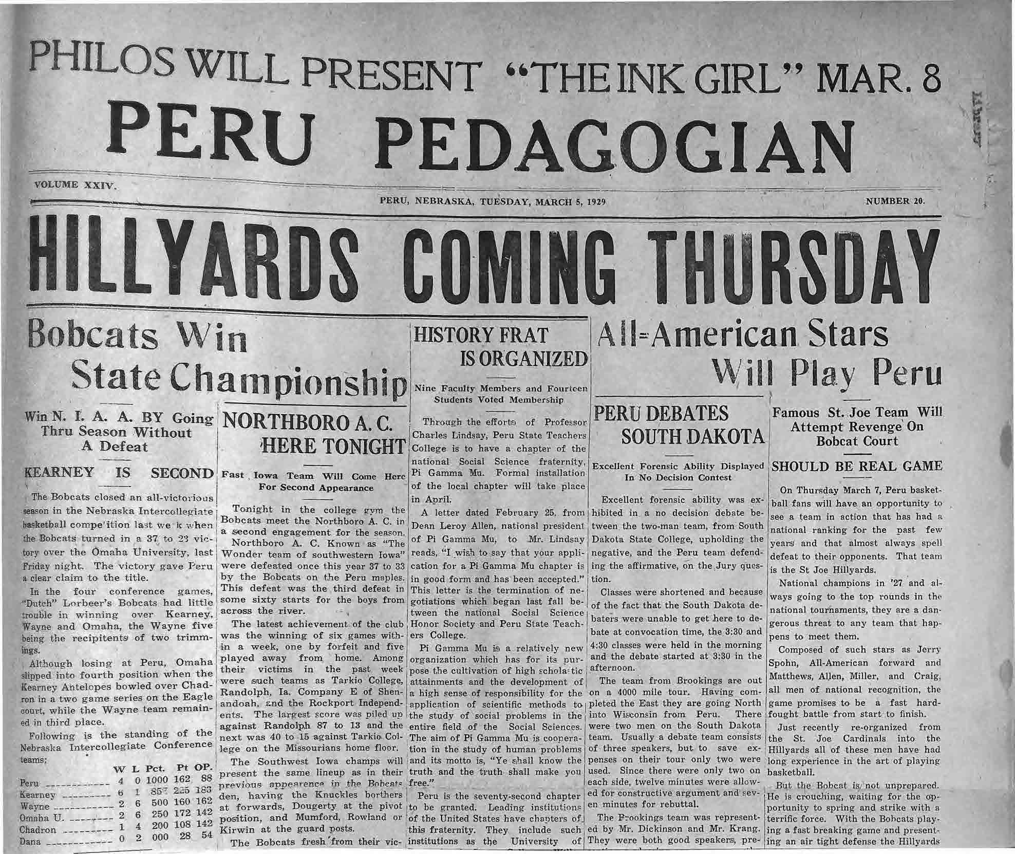What does the aven1g e Co-ed come According to God's plans H d h' r I d · 1 J e was particularly inter es te on t is were se a e m a arge envelove and ' NING ' to co lle!!e for? Yo u say tha t "a To g rac·e the home her task shall be '- f I d" h' f · t h 'th d MANUAL TRAI trip in t e grav e o an n ian c 1e , g iven o w1 or ers not to open I w man w-0u'ld starge to death in the To win. the bre ad the man's. in the buffs below tow n. He was brot t hem un ti l she got to Ste amboat I home t.hese days and have fewer ' to Peru by T. J. Long, of the Nebras- Sprin gs, Colorado- then to on ly LUMBER ' cloth.es" so i.t is assumed that. t he wolf So greetin gs to you sister ka Ci ty Ph arma "'y. Conc erning this. one a day. Marguerite Gr aves, El sie's ' ""' LACQUER, ENAMEL is at t he door. Clothes - Yo u need May yo u gain fame and r enow n, work of Mr. Blackman, The Nebraska ro om-mate dese rves a ll the credit for not have mentioned clot hes. An edu - And you may tramp Ulp oin our necks qty News-Press of We dnesday says : this farewell party. ' PAINTS I cation for clothes to y0tur j But _YO U can't keep a g ood man down. "E. E. B.lackman. curator of the I COAL COAL ' o wn sta tements! 'ifhere1n hes the e x- . - By Heck. Nebr asklll State Historical Society Geor ge Abe '27, is av is- ; plan atio1;1 of the word diverse. What museum, who for the past 30 years itor on the Peru campus. MacElro y I PERU LUMBER CO. does the man come to colle ge for? To "BLOWSERS" AND "WOWSERS" has been connected with th€ org a niza- coac hed at Brid geport, N eb., last year w. J. RABEL, Mgr. J better ,himself' an d .the immediate SO'- Headw ay · is at l ast bein g made by tiori in exiploring former stampin g and will return to Br id g eport t hi s Phone 48 Peru, Nebr. ciety in which he lives. You have the gallant pion eers str u ggling to im- gro unds od' vario us Indi an t rib es, will fall to continue coachin g. Abe was J done many an inju s tive be- Iprove the idiotic dre ss that men p ut do some in v es'tigati.oill work along the a star on the Bobcat