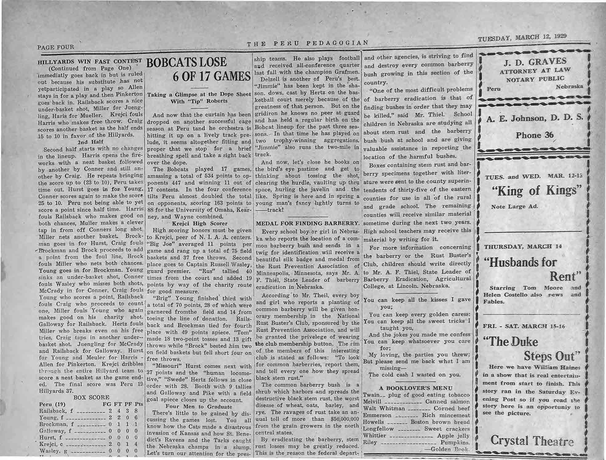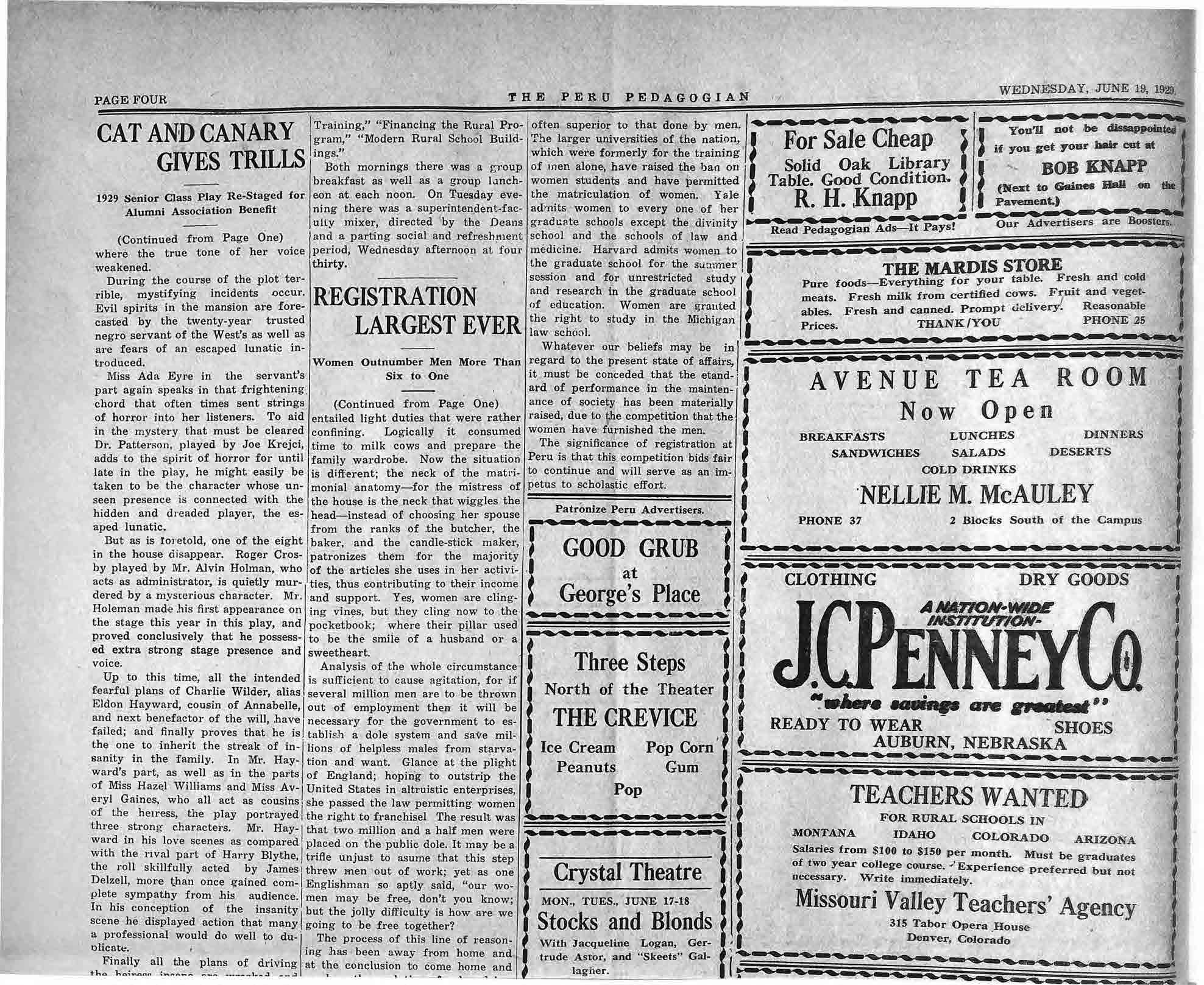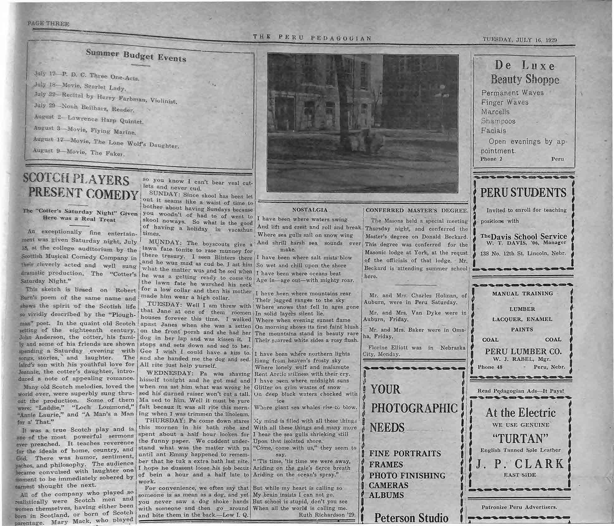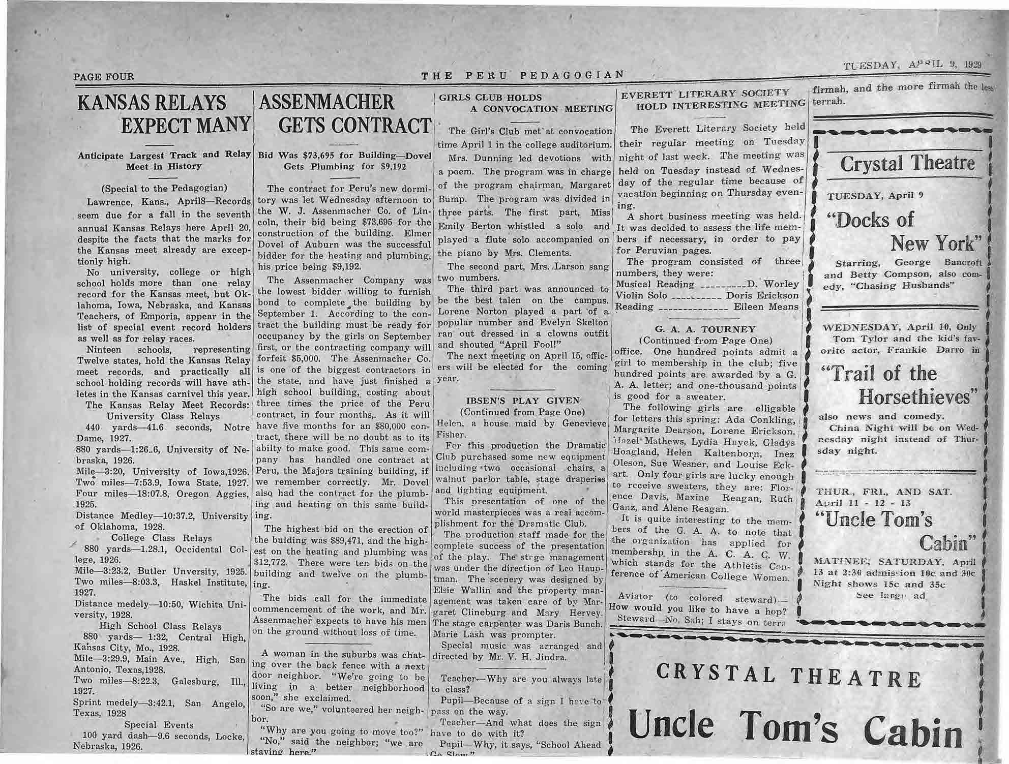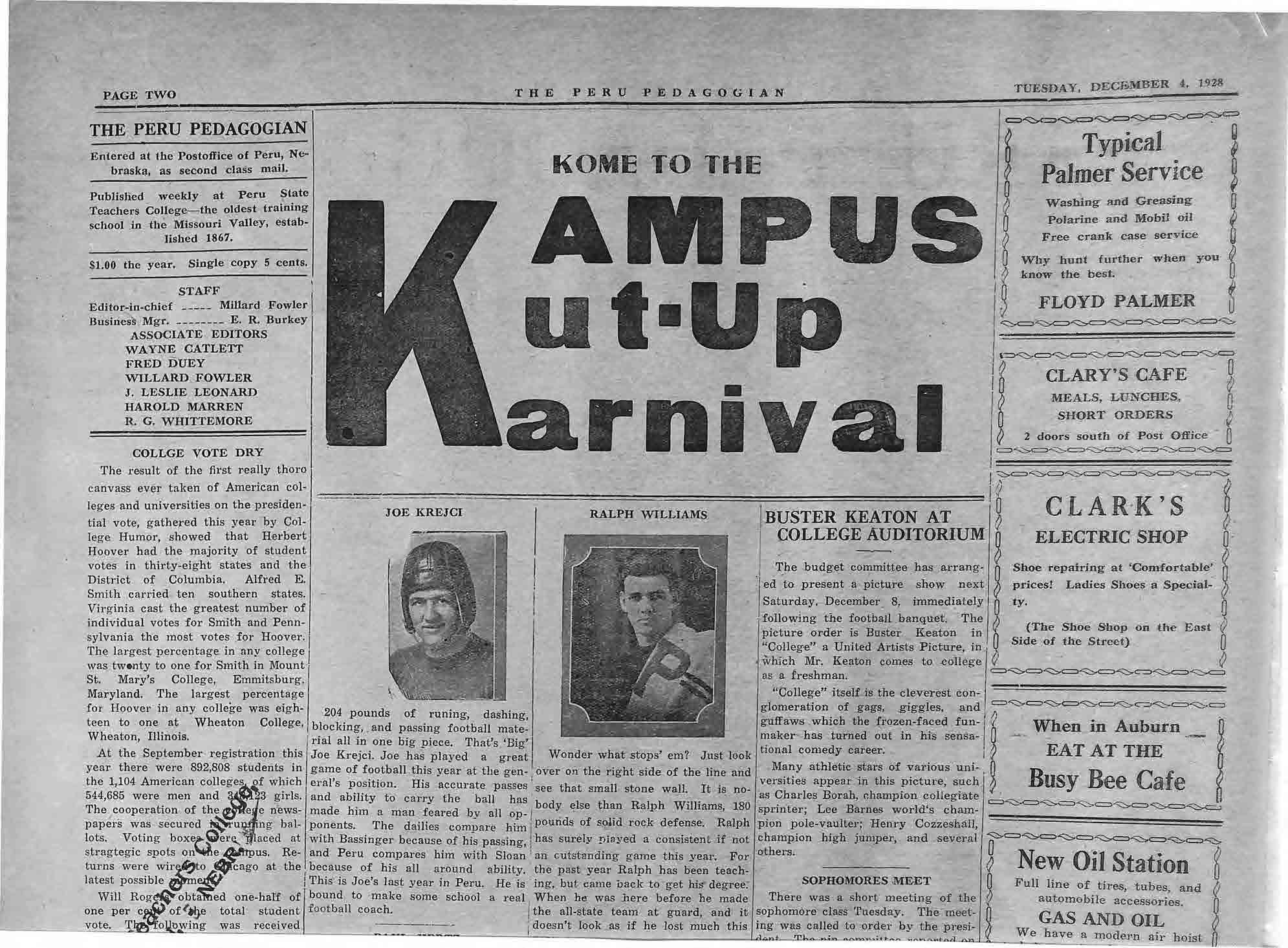 What does the aven1g e Co-ed come According to God's plans H d h' r I d · 1 J e was particularly inter es te on t is were se a e m a arge envelove and ' NING ' to co lle!!e for? Yo u say tha t "a To g rac·e the home her task shall be '- f I d" h' f · t h 'th d MANUAL TRAI trip in t e grav e o an n ian c 1e , g iven o w1 or ers not to open I w man w-0u'ld starge to death in the To win. the bre ad the man's. in the buffs below tow n. He was brot t hem un ti l she got to Ste amboat I home t.hese days and have fewer ' to Peru by T. J. Long, of the Nebras- Sprin gs, Colorado- then to on ly LUMBER ' cloth.es" so i.t is assumed that. t he wolf So greetin gs to you sister ka Ci ty Ph arma "'y. Conc erning this. one a day. Marguerite Gr aves, El sie's ' ""' LACQUER, ENAMEL is at t he door. Clothes - Yo u need May yo u gain fame and r enow n, work of Mr. Blackman, The Nebraska ro om-mate dese rves a ll the credit for not have mentioned clot hes. An edu - And you may tramp Ulp oin our necks qty News-Press of We dnesday says : this farewell party. ' PAINTS I cation for clothes to y0tur j But _YO U can't keep a g ood man down. "E. E. B.lackman. curator of the I COAL COAL ' o wn sta tements! 'ifhere1n hes the e x- . - By Heck. Nebr asklll State Historical Society Geor ge Abe '27, is av is- ; plan atio1;1 of the word diverse. What museum, who for the past 30 years itor on the Peru campus. MacElro y I PERU LUMBER CO. does the man come to colle ge for? To "BLOWSERS" AND "WOWSERS" has been connected with th€ org a niza- coac hed at Brid geport, N eb., last year w. J. RABEL, Mgr. J better ,himself' an d .the immediate SO'- Headw ay · is at l ast bein g made by tiori in exiploring former stampin g and will return to Br id g eport t hi s Phone 48 Peru, Nebr. ciety in which he lives. You have the gallant pion eers str u ggling to im- gro unds od' vario us Indi an t rib es, will fall to continue coachin g. Abe was J done many an inju s tive be- Iprove the idiotic dre ss that men p ut do some in v es'tigati.oill work along the a star on the Bobcat