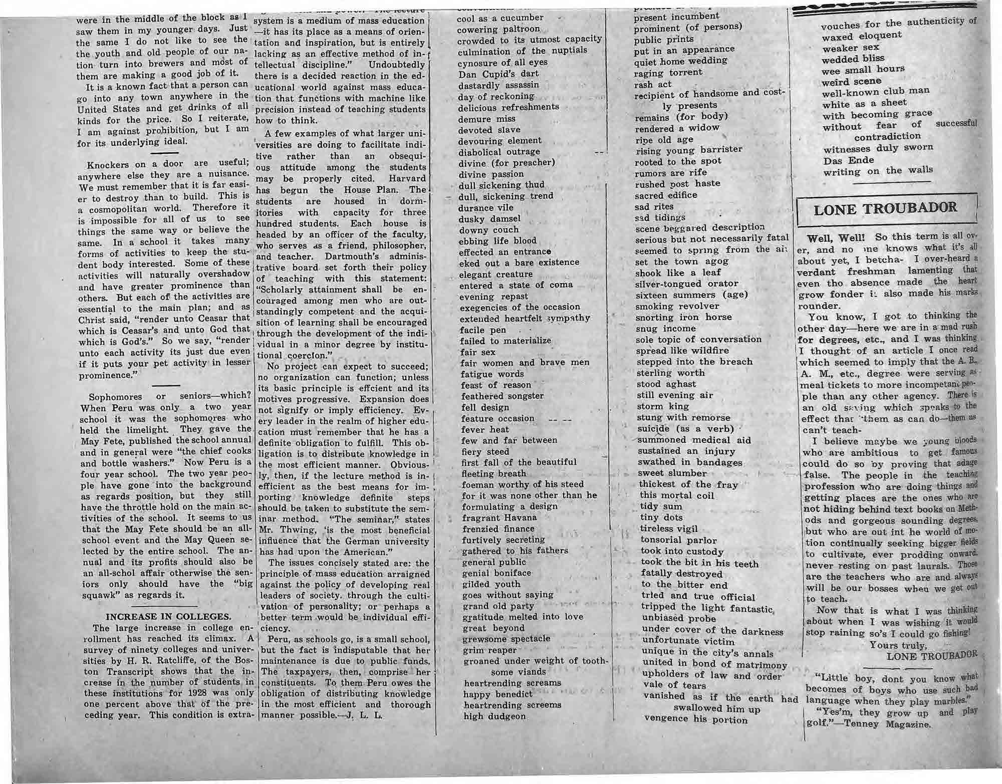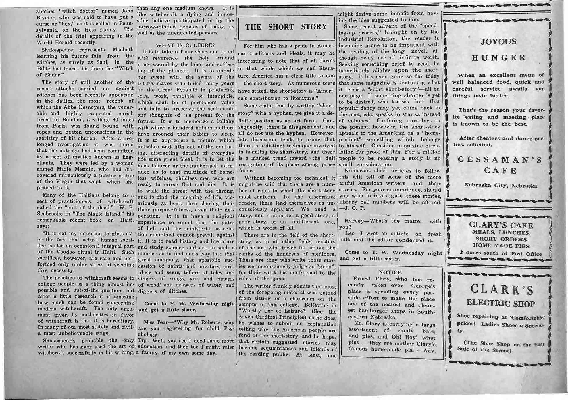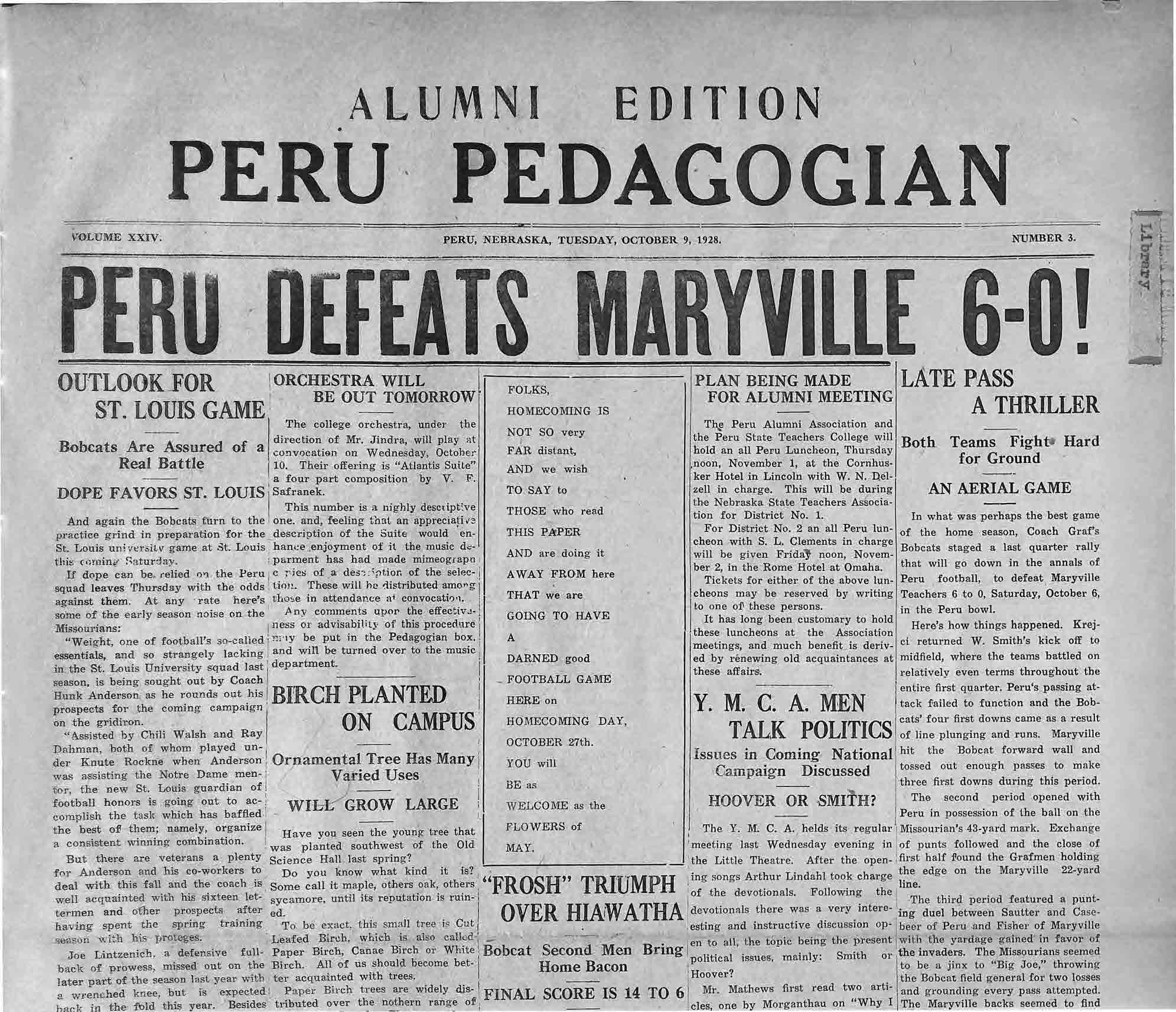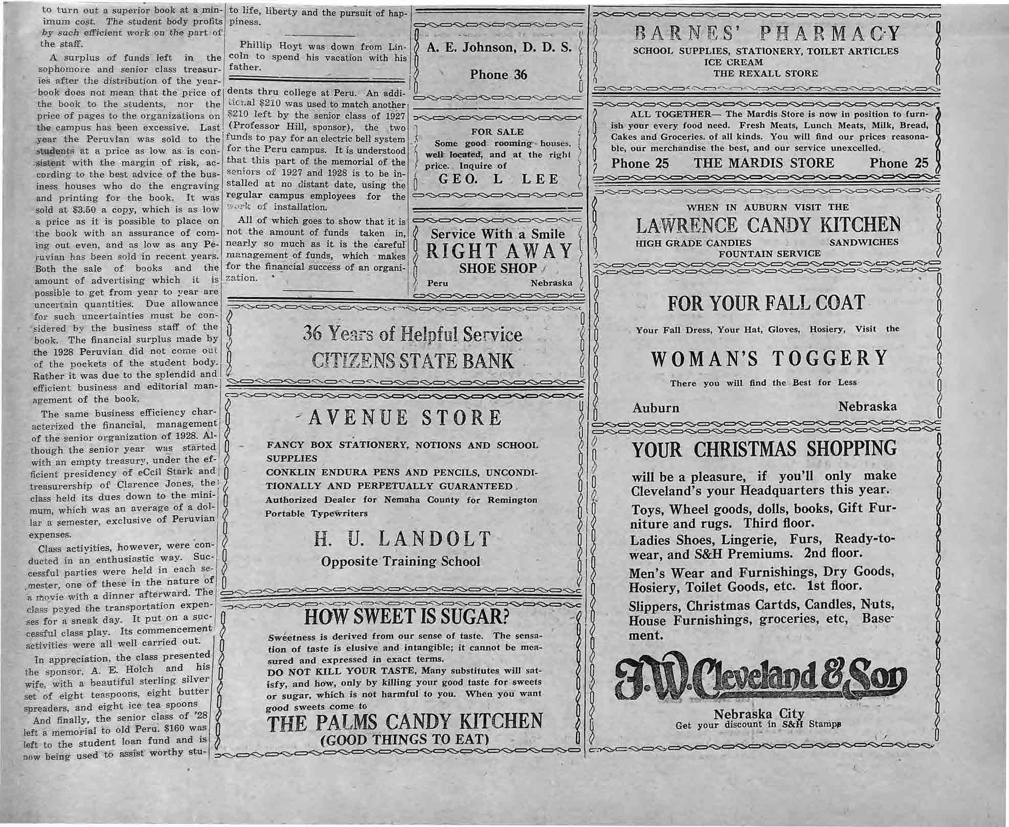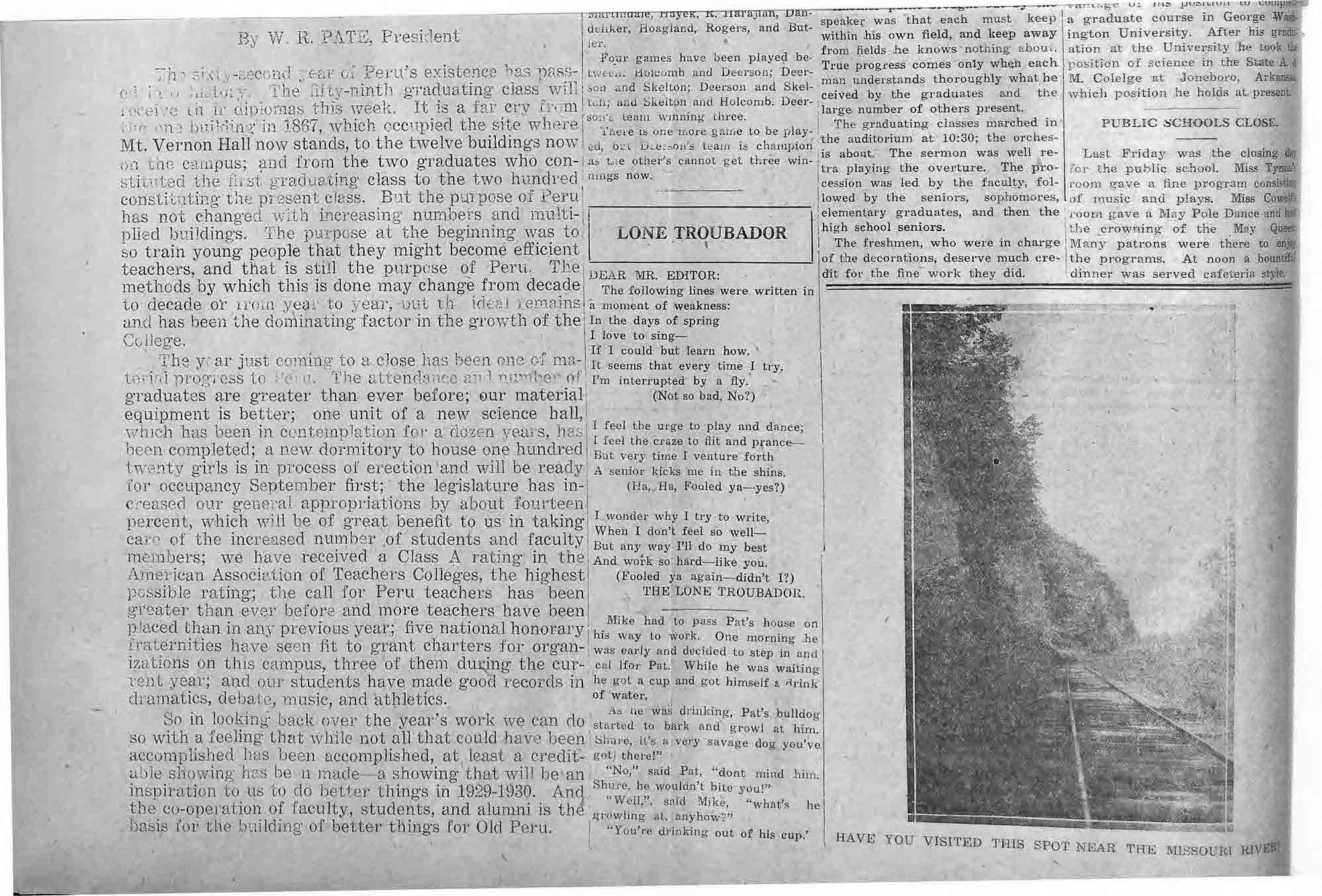 What does the aven1g e Co-ed come According to God's plans H d h' r I d · 1 J e was particularly inter es te on t is were se a e m a arge envelove and ' NING ' to co lle!!e for? Yo u say tha t "a To g rac·e the home her task shall be '- f I d" h' f · t h 'th d MANUAL TRAI trip in t e grav e o an n ian c 1e , g iven o w1 or ers not to open I w man w-0u'ld starge to death in the To win. the bre ad the man's. in the buffs below tow n. He was brot t hem un ti l she got to Ste amboat I home t.hese days and have fewer ' to Peru by T. J. Long, of the Nebras- Sprin gs, Colorado- then to on ly LUMBER ' cloth.es" so i.t is assumed that. t he wolf So greetin gs to you sister ka Ci ty Ph arma "'y. Conc erning this. one a day. Marguerite Gr aves, El sie's ' ""' LACQUER, ENAMEL is at t he door. Clothes - Yo u need May yo u gain fame and r enow n, work of Mr. Blackman, The Nebraska ro om-mate dese rves a ll the credit for not have mentioned clot hes. An edu - And you may tramp Ulp oin our necks qty News-Press of We dnesday says : this farewell party. ' PAINTS I cation for clothes to y0tur j But _YO U can't keep a g ood man down. "E. E. B.lackman. curator of the I COAL COAL ' o wn sta tements! 'ifhere1n hes the e x- . - By Heck. Nebr asklll State Historical Society Geor ge Abe '27, is av is- ; plan atio1;1 of the word diverse. What museum, who for the past 30 years itor on the Peru campus. MacElro y I PERU LUMBER CO. does the man come to colle ge for? To "BLOWSERS" AND "WOWSERS" has been connected with th€ org a niza- coac hed at Brid geport, N eb., last year w. J. RABEL, Mgr. J better ,himself' an d .the immediate SO'- Headw ay · is at l ast bein g made by tiori in exiploring former stampin g and will return to Br id g eport t hi s Phone 48 Peru, Nebr. ciety in which he lives. You have the gallant pion eers str u ggling to im- gro unds od' vario us Indi an t rib es, will fall to continue coachin g. Abe was J done many an inju s tive be- Iprove the idiotic dre ss that men p ut do some in v es'tigati.oill work along the a star on the Bobcat