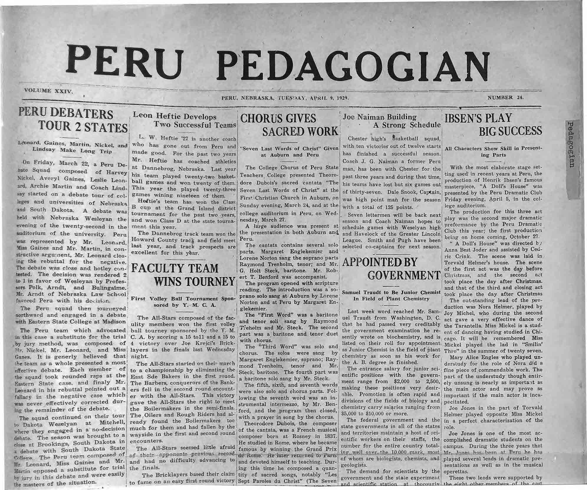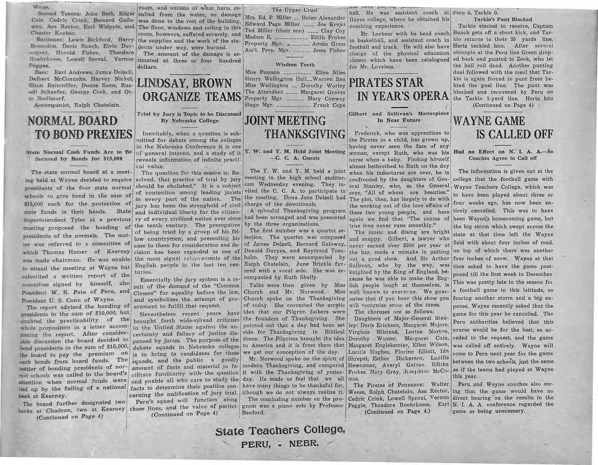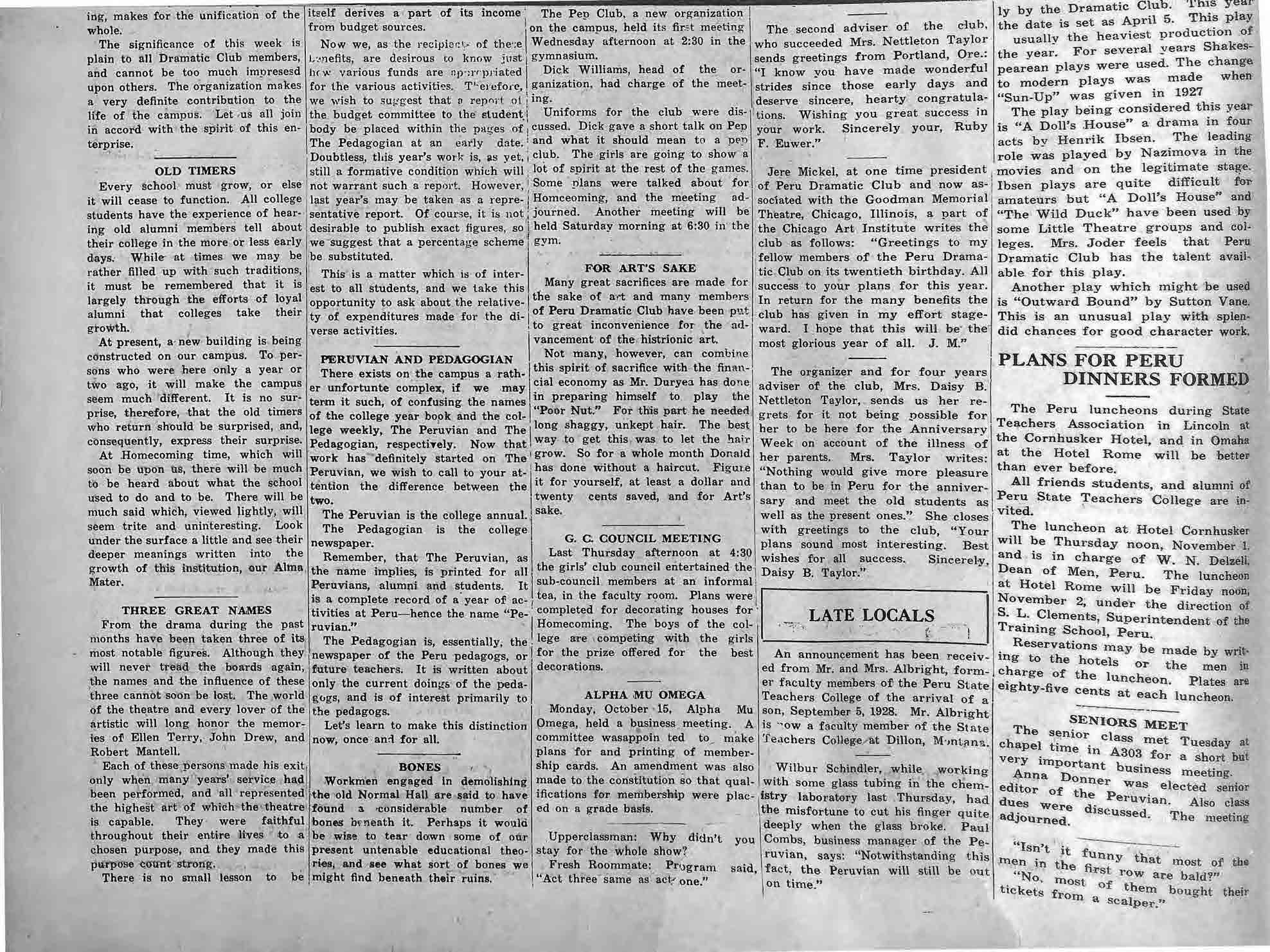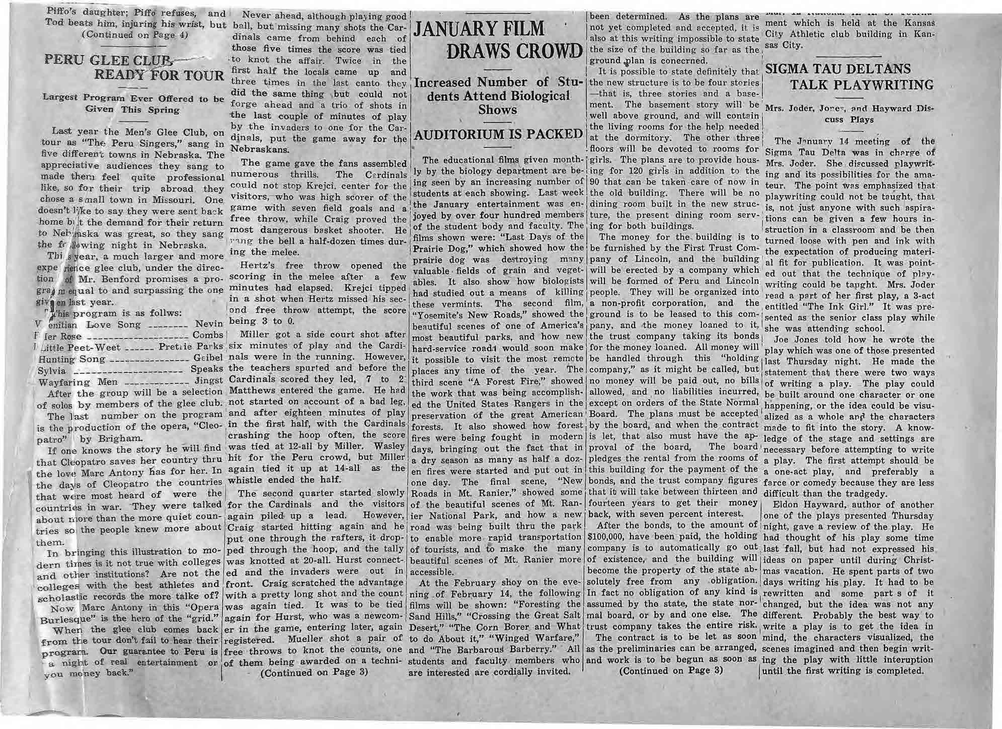A!-te r. the t.a lk t h.ere was a soc j al been receiving the attention of Mrs. music al phraseology. Repeated bits Peru, Nebr. !Hei t.z f or t he pr esent, period m w hich the old and new Joder club sponsor. Tryouts are in of the French anthem, the Ma rseilles., Deb a te Edi t or ____ Ern est Hassel blad j to divi.de his time b etween win g a nd bec am e a cquaint ed. pr0<gress at present, and the cast will are to bp heard in the refr ain. Mr. Per u, Nebr. fullb ack O ffi cers for t he present s chool be a nnounced in a few d ays. This Do•yl•e was accompanied by Mr. R. T. . Each mem ber o:fl t he st aff h as bee n I Fr es hmen Stronger Than Usu al year fo llow: is a play of college athlet ic life, and Benford. • g1v-en work for t he coming yea r. and I This yea r's fresh men st ock has James . Delzell President w ill b e, in dr am atic t one, a rather Again last Friday the Music de- j everyt hin g is wOi·ki ng smoothly. ! taken a j ump considera ble abo'Ve par. Wilbur Schindler __ Vice Pr eside nt light comedy. had charge of the pro g ram, Mnr. h of sp ort materi a l_ nnd j T he squad s eems to be e nElton 'Reinmiller - -Tre asur er t his time presenting Mr Jindra and news_ t_h e colleg e will be I d ow:d plen ty of fight a nd h ave Leo Ha uptman Secretary'