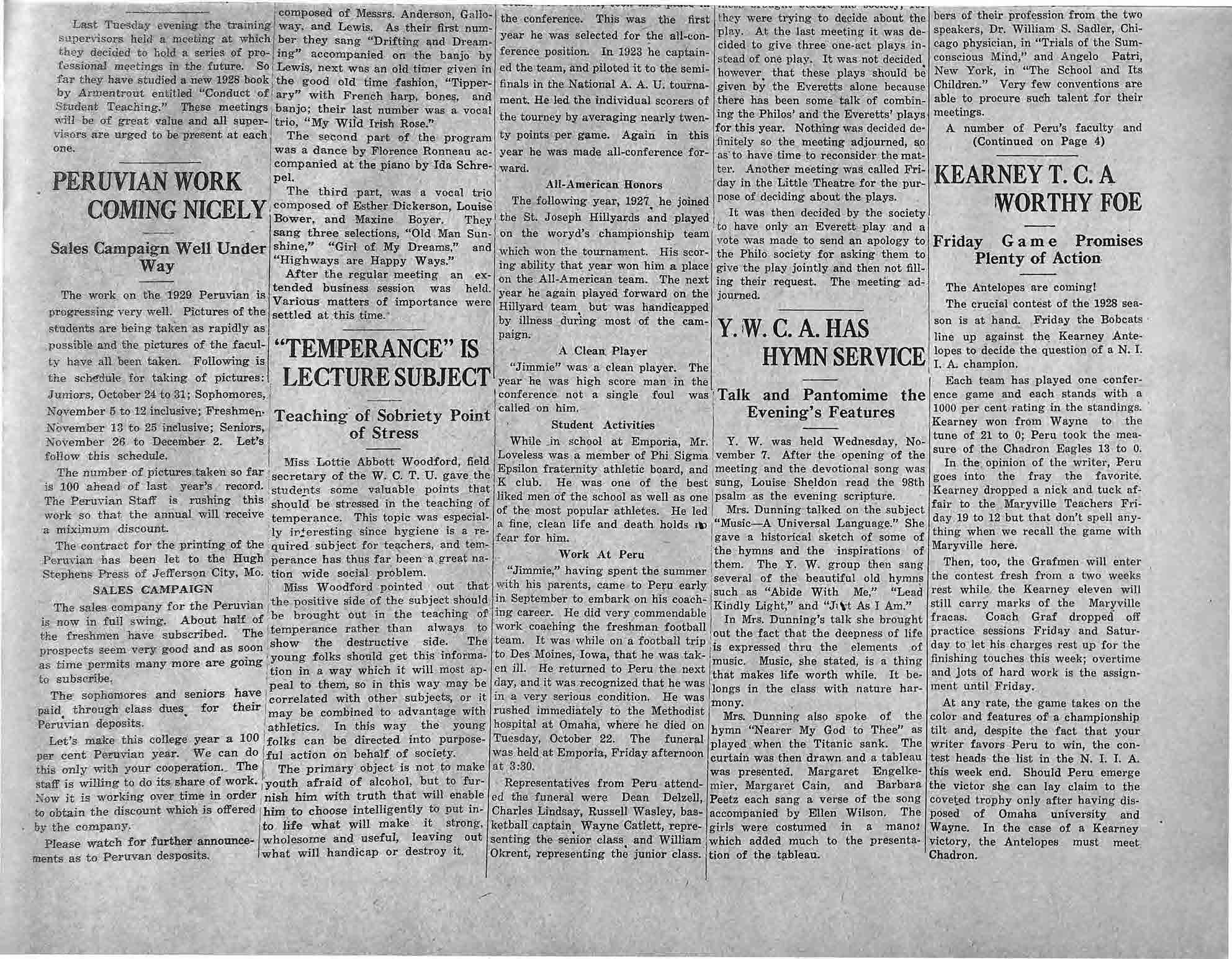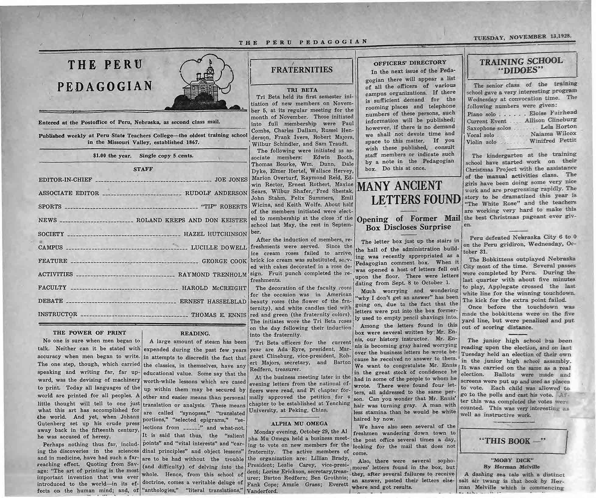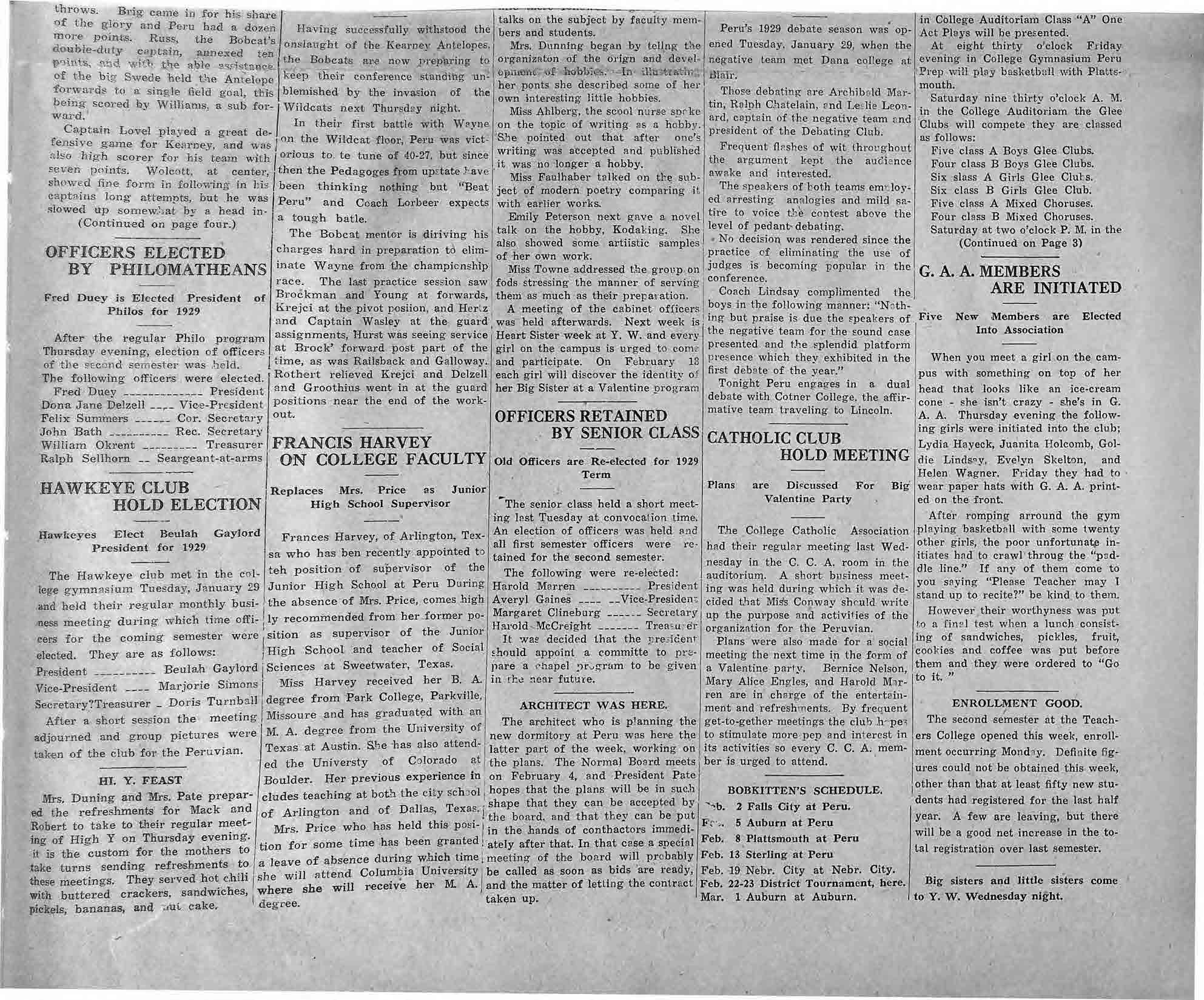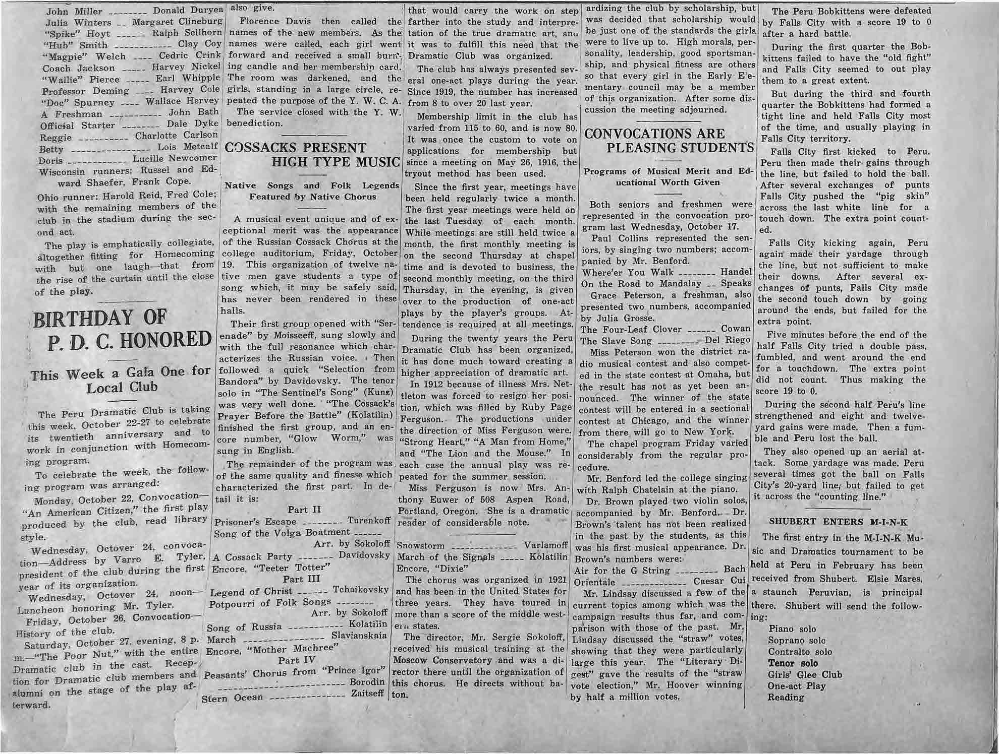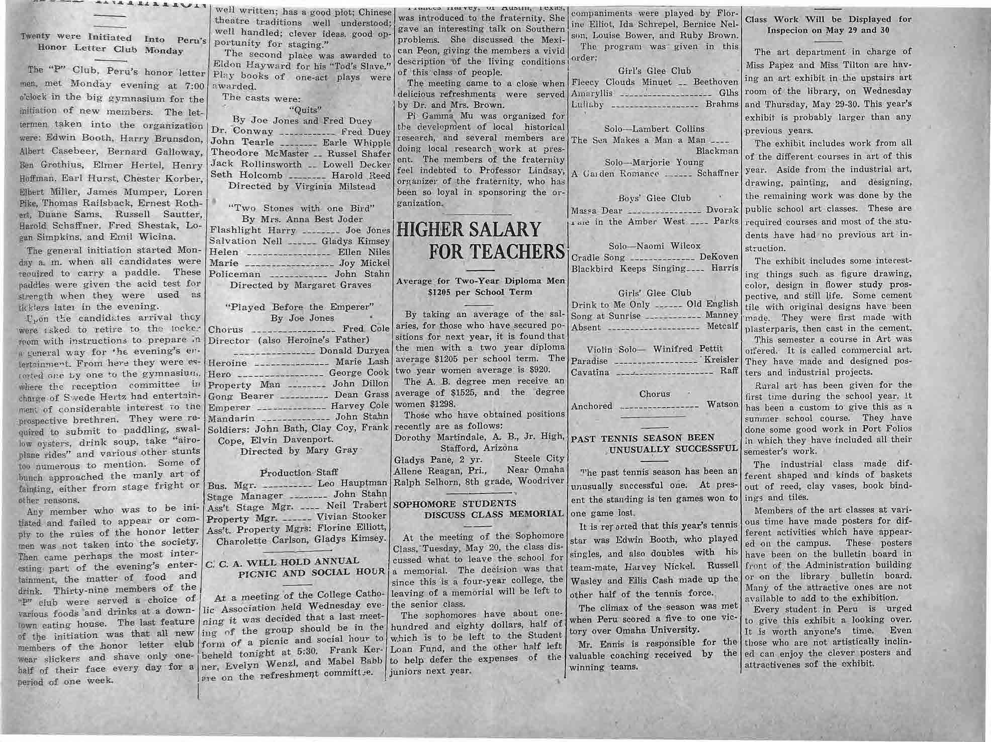 A!-te r. the t.a lk t h.ere was a soc j al been receiving the attention of Mrs. music al phraseology. Repeated bits Peru, Nebr. !Hei t.z f or t he pr esent, period m w hich the old and new Joder club sponsor. Tryouts are in of the French anthem, the Ma rseilles., Deb a te Edi t or ____ Ern est Hassel blad j to divi.de his time b etween win g a nd bec am e a cquaint ed. pr0<gress at present, and the cast will are to bp heard in the refr ain. Mr. Per u, Nebr. fullb ack O ffi cers for t he present s chool be a nnounced in a few d ays. This Do•yl•e was accompanied by Mr. R. T. . Each mem ber o:fl t he st aff h as bee n I Fr es hmen Stronger Than Usu al year fo llow: is a play of college athlet ic life, and Benford. • g1v-en work for t he coming yea r. and I This yea r's fresh men st ock has James . Delzell President w ill b e, in dr am atic t one, a rather Again last Friday the Music de- j everyt hin g is wOi·ki ng smoothly. ! taken a j ump considera ble abo'Ve par. Wilbur Schindler __ Vice Pr eside nt light comedy. had charge of the pro g ram, Mnr. h of sp ort materi a l_ nnd j T he squad s eems to be e nElton 'Reinmiller - -Tre asur er t his time presenting Mr Jindra and news_ t_h e colleg e will be I d ow:d plen ty of fight a nd h ave Leo Ha uptman Secretary'