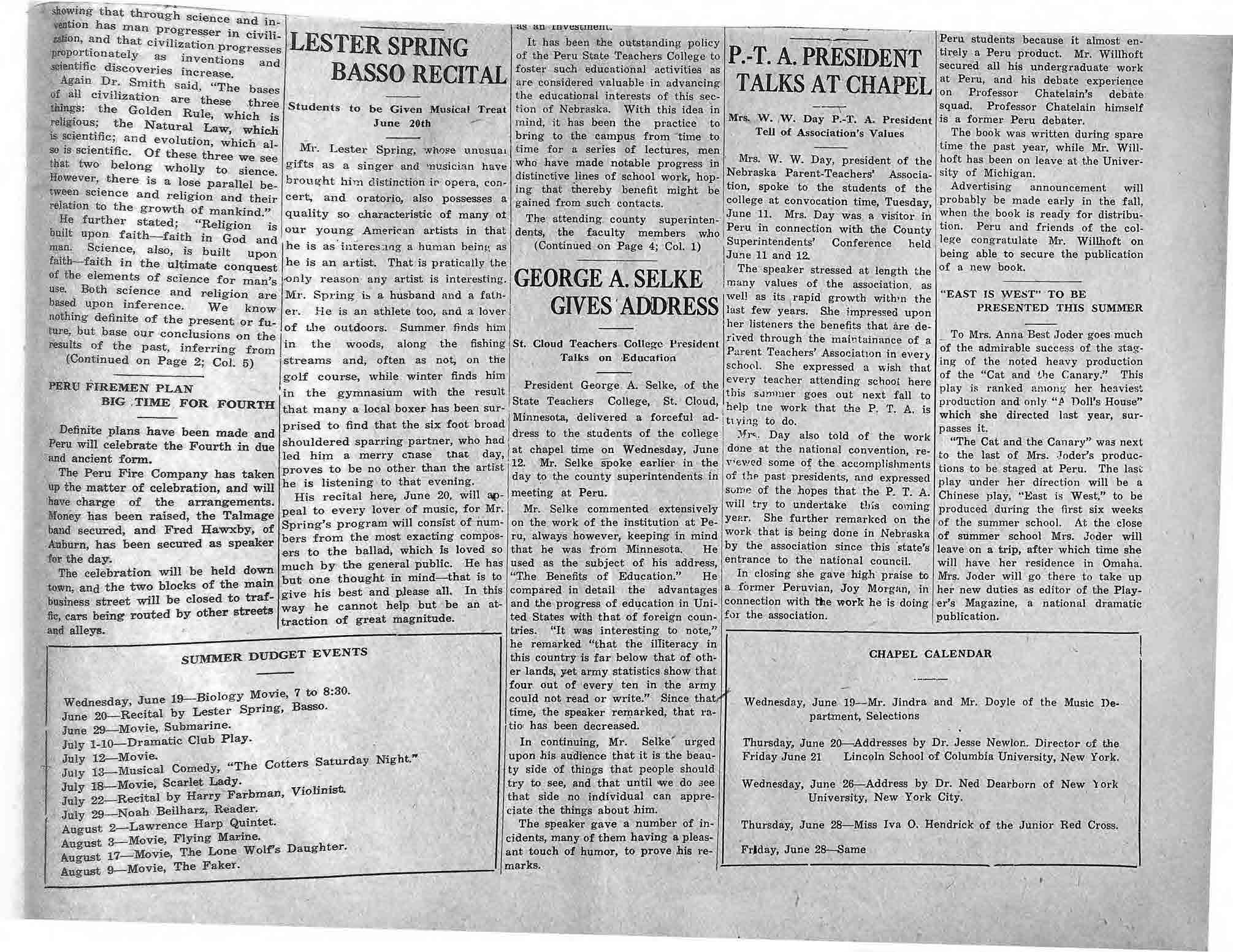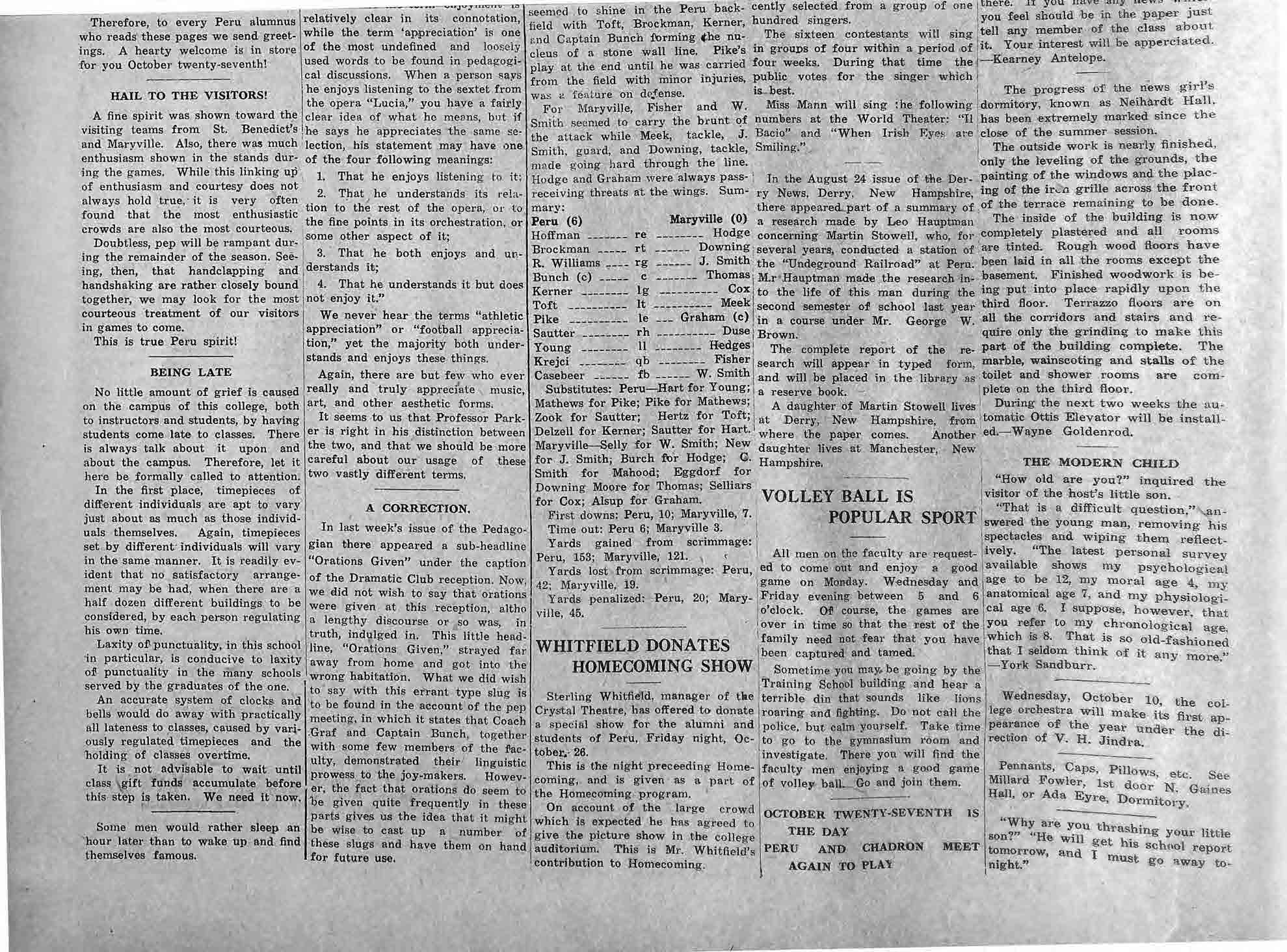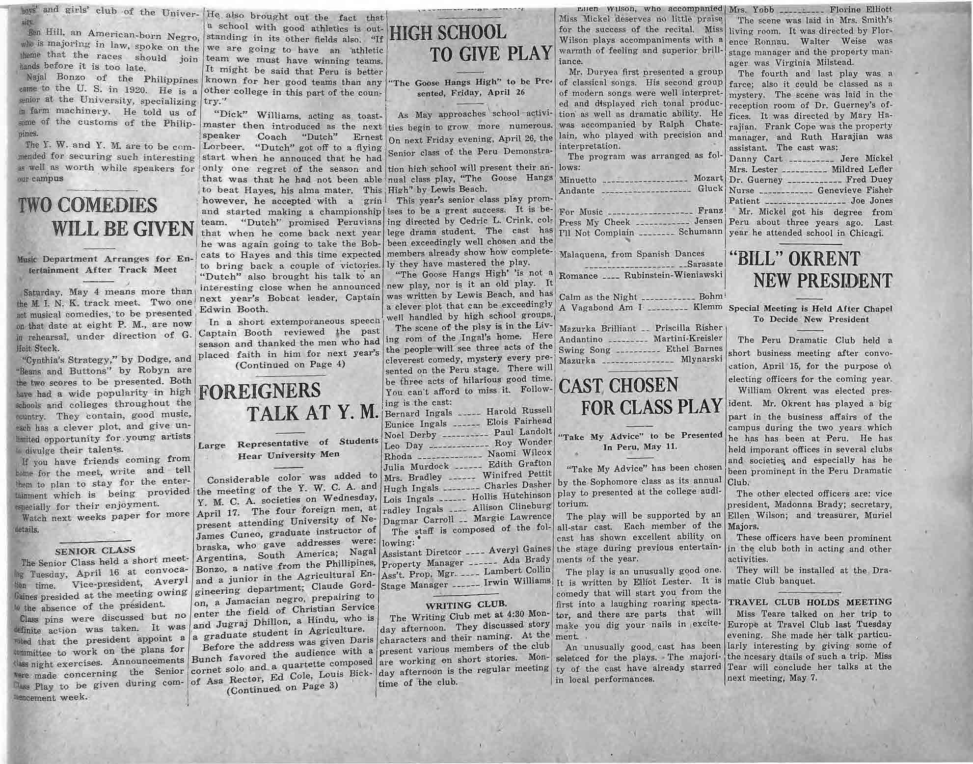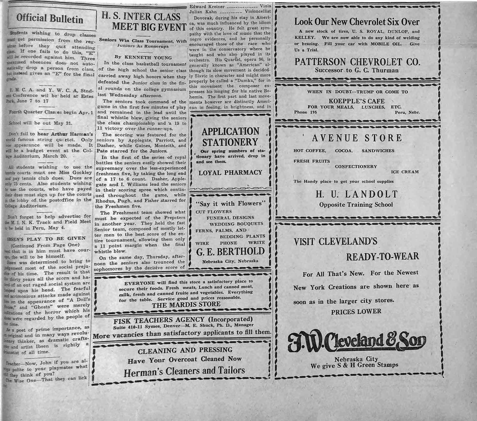 A!-te r. the t.a lk t h.ere was a soc j al been receiving the attention of Mrs. music al phraseology. Repeated bits Peru, Nebr. !Hei t.z f or t he pr esent, period m w hich the old and new Joder club sponsor. Tryouts are in of the French anthem, the Ma rseilles., Deb a te Edi t or ____ Ern est Hassel blad j to divi.de his time b etween win g a nd bec am e a cquaint ed. pr0<gress at present, and the cast will are to bp heard in the refr ain. Mr. Per u, Nebr. fullb ack O ffi cers for t he present s chool be a nnounced in a few d ays. This Do•yl•e was accompanied by Mr. R. T. . Each mem ber o:fl t he st aff h as bee n I Fr es hmen Stronger Than Usu al year fo llow: is a play of college athlet ic life, and Benford. • g1v-en work for t he coming yea r. and I This yea r's fresh men st ock has James . Delzell President w ill b e, in dr am atic t one, a rather Again last Friday the Music de- j everyt hin g is wOi·ki ng smoothly. ! taken a j ump considera ble abo'Ve par. Wilbur Schindler __ Vice Pr eside nt light comedy. had charge of the pro g ram, Mnr. h of sp ort materi a l_ nnd j T he squad s eems to be e nElton 'Reinmiller - -Tre asur er t his time presenting Mr Jindra and news_ t_h e colleg e will be I d ow:d plen ty of fight a nd h ave Leo Ha uptman Secretary'