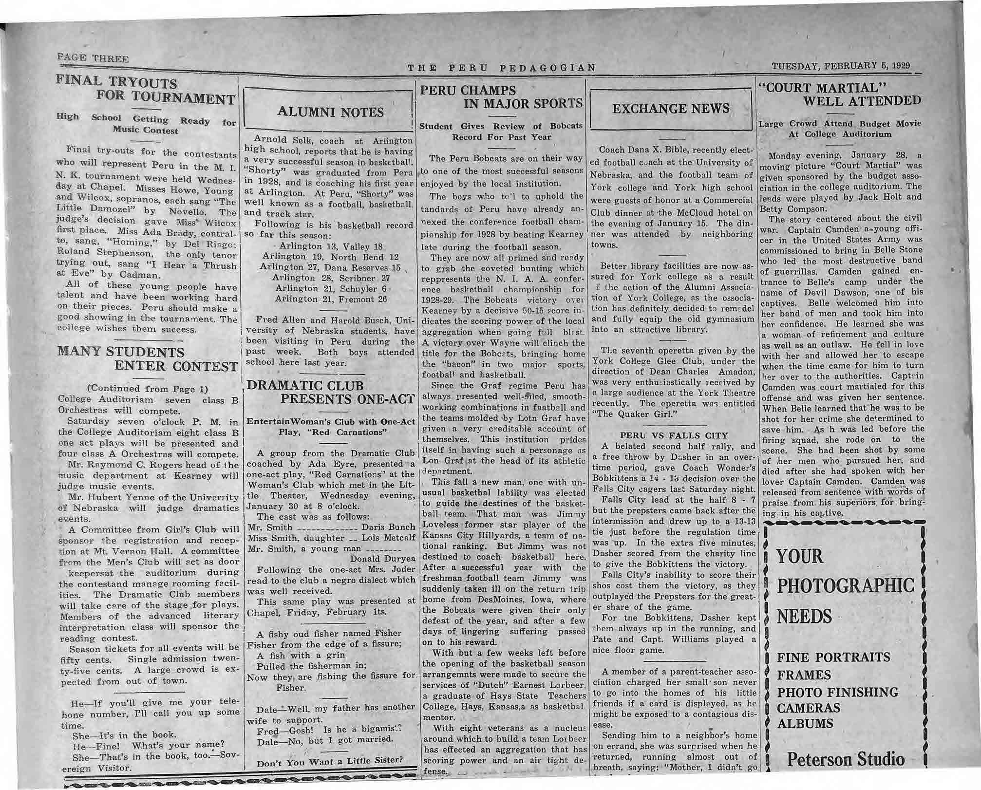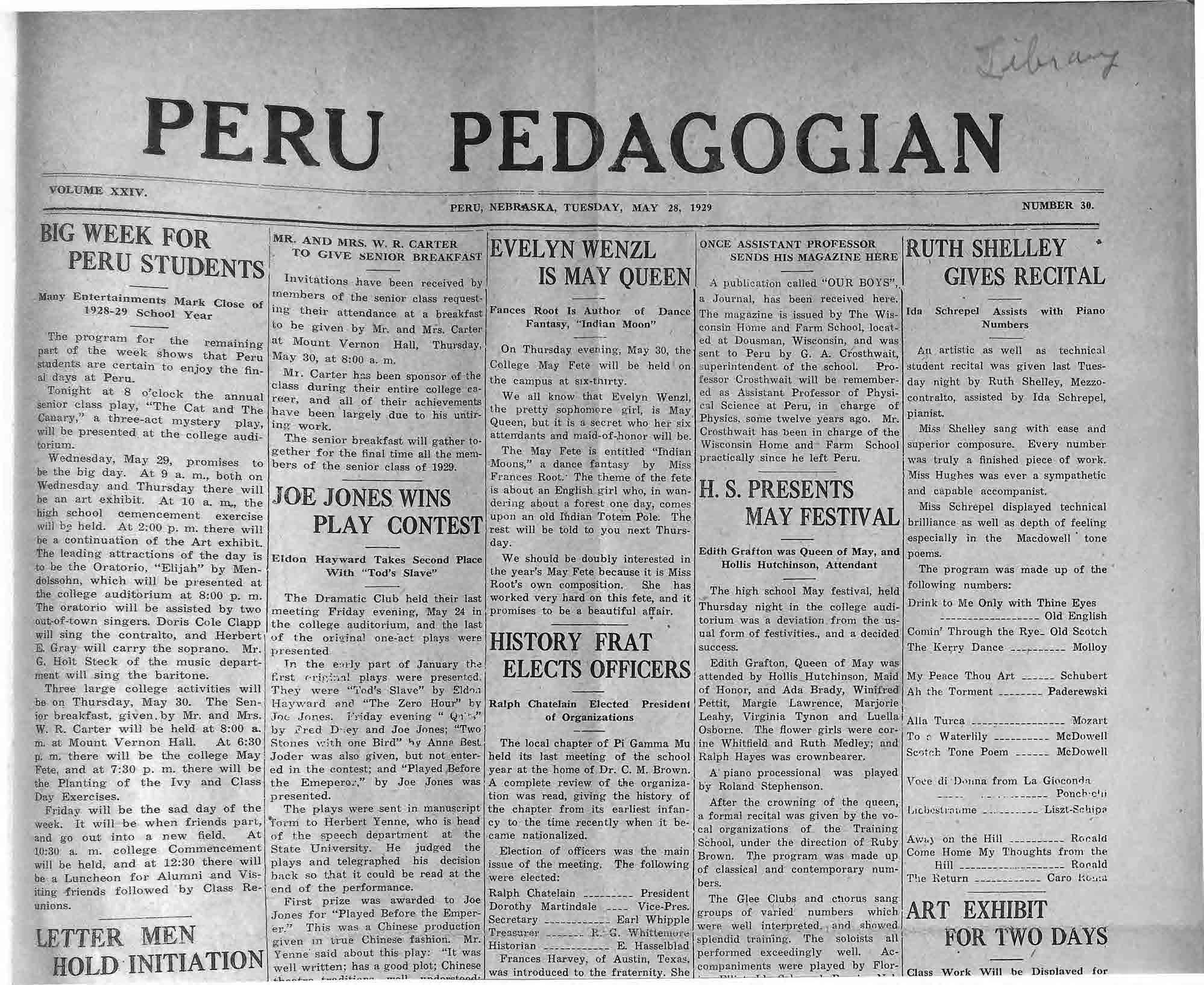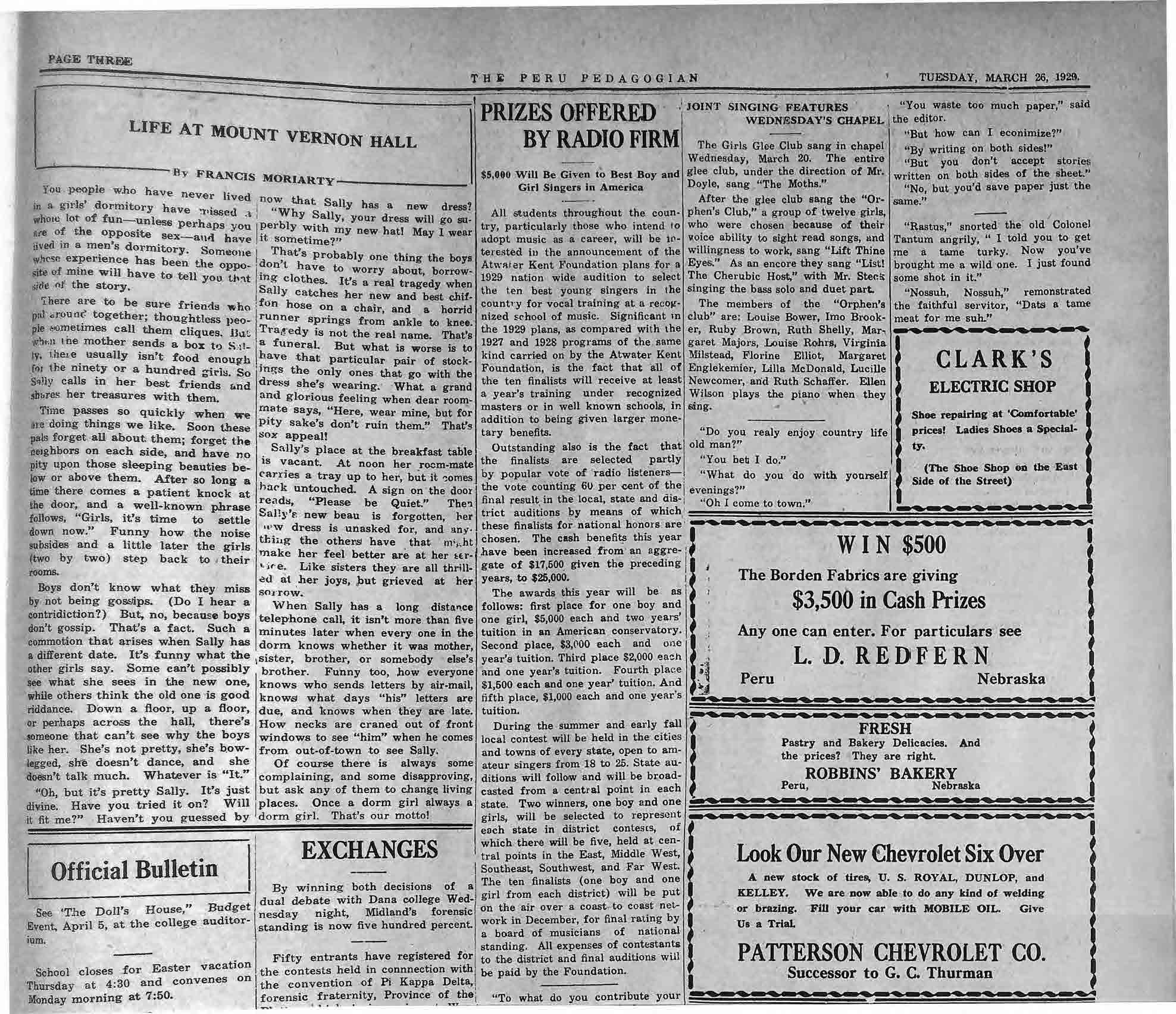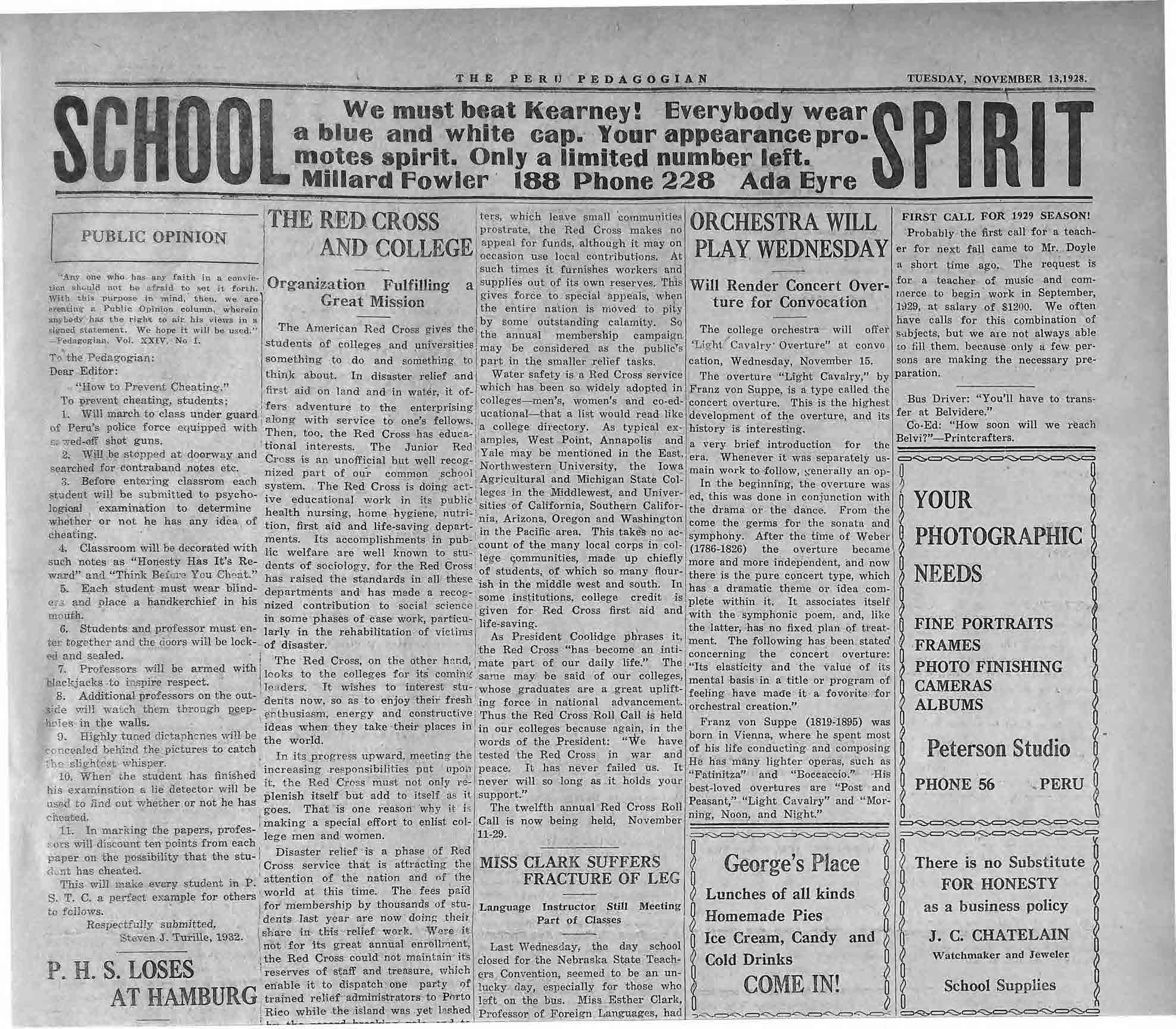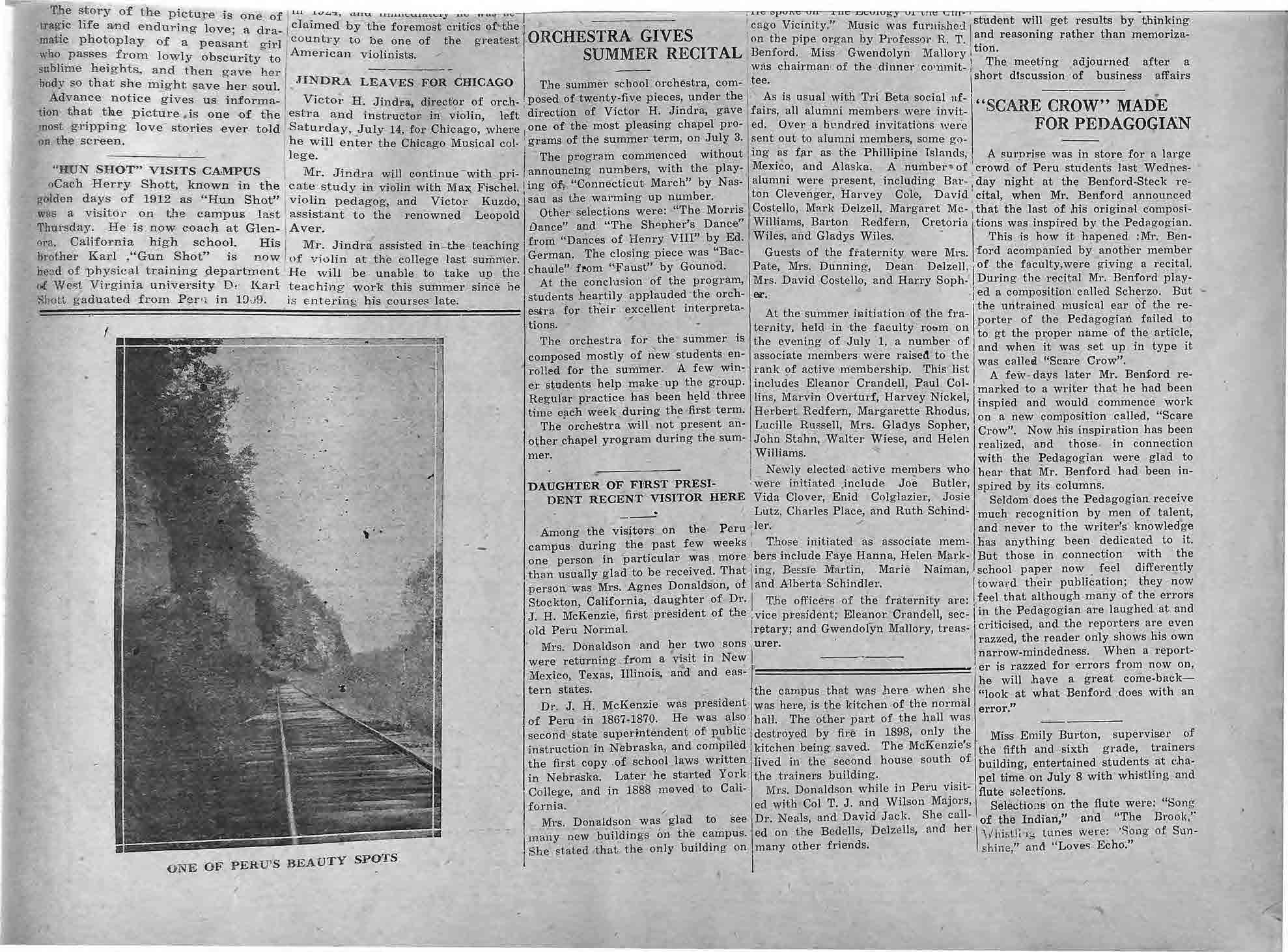 A!-te r. the t.a lk t h.ere was a soc j al been receiving the attention of Mrs. music al phraseology. Repeated bits Peru, Nebr. !Hei t.z f or t he pr esent, period m w hich the old and new Joder club sponsor. Tryouts are in of the French anthem, the Ma rseilles., Deb a te Edi t or ____ Ern est Hassel blad j to divi.de his time b etween win g a nd bec am e a cquaint ed. pr0<gress at present, and the cast will are to bp heard in the refr ain. Mr. Per u, Nebr. fullb ack O ffi cers for t he present s chool be a nnounced in a few d ays. This Do•yl•e was accompanied by Mr. R. T. . Each mem ber o:fl t he st aff h as bee n I Fr es hmen Stronger Than Usu al year fo llow: is a play of college athlet ic life, and Benford. • g1v-en work for t he coming yea r. and I This yea r's fresh men st ock has James . Delzell President w ill b e, in dr am atic t one, a rather Again last Friday the Music de- j everyt hin g is wOi·ki ng smoothly. ! taken a j ump considera ble abo'Ve par. Wilbur Schindler __ Vice Pr eside nt light comedy. had charge of the pro g ram, Mnr. h of sp ort materi a l_ nnd j T he squad s eems to be e nElton 'Reinmiller - -Tre asur er t his time presenting Mr Jindra and news_ t_h e colleg e will be I d ow:d plen ty of fight a nd h ave Leo Ha uptman Secretary'
