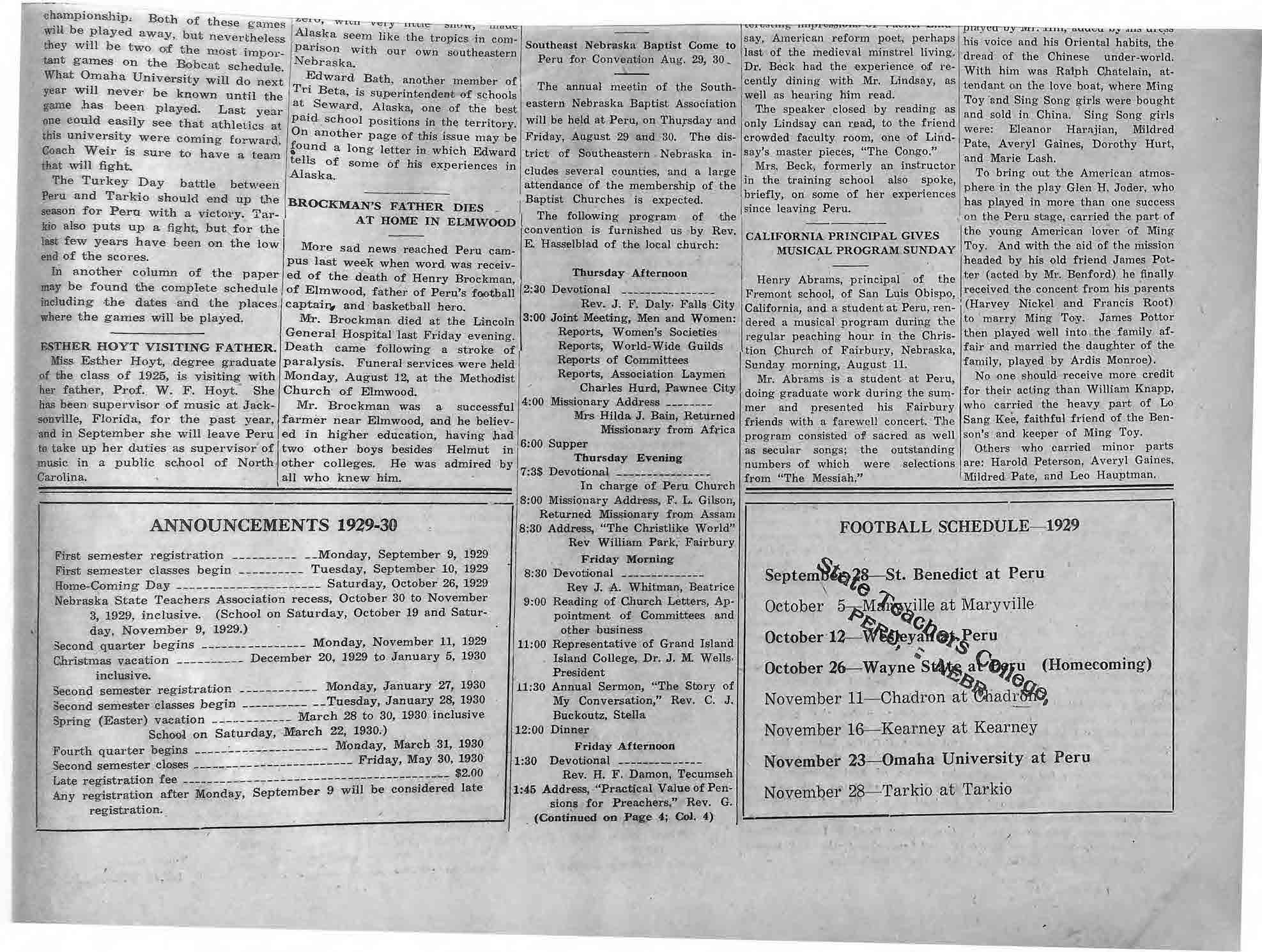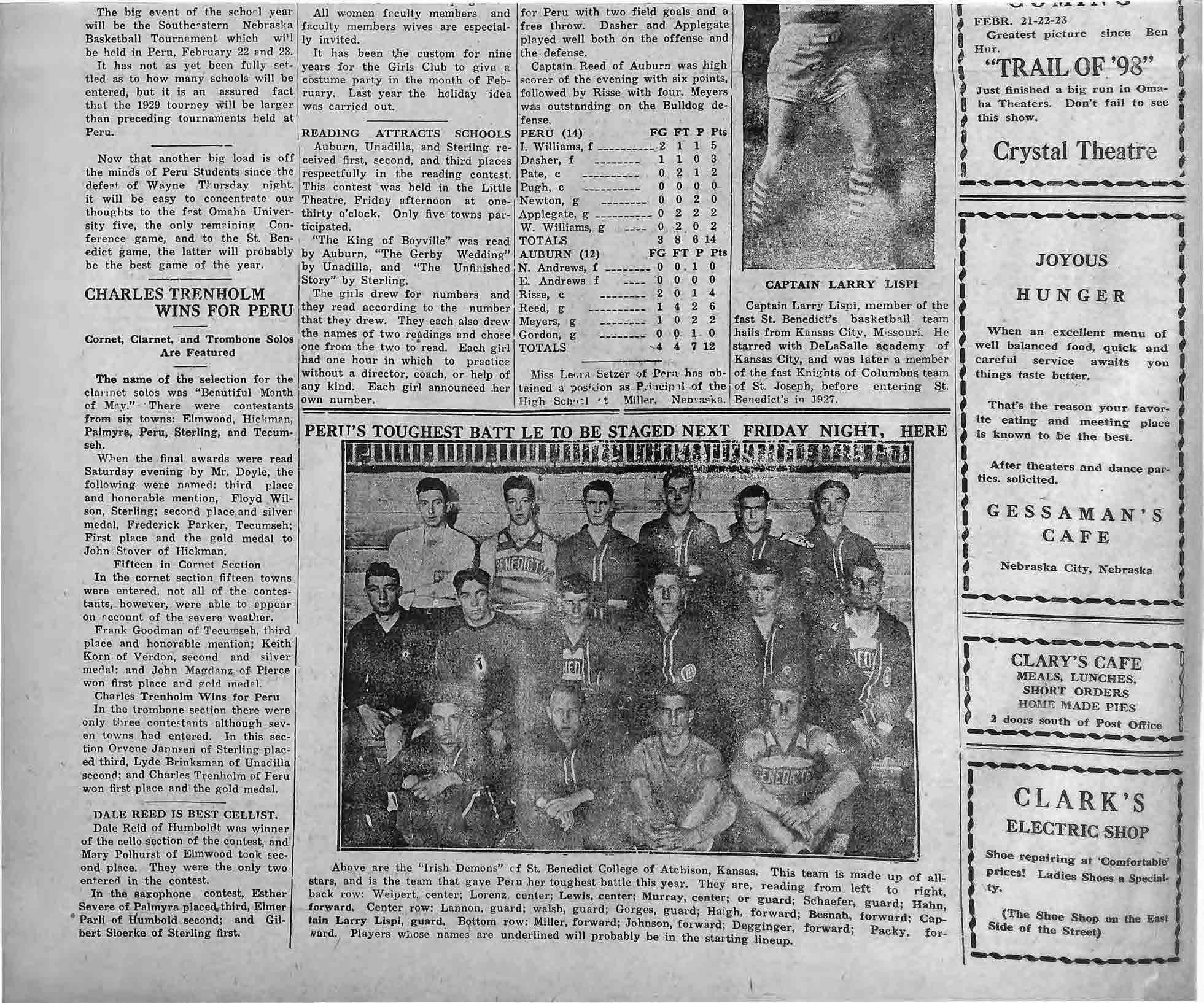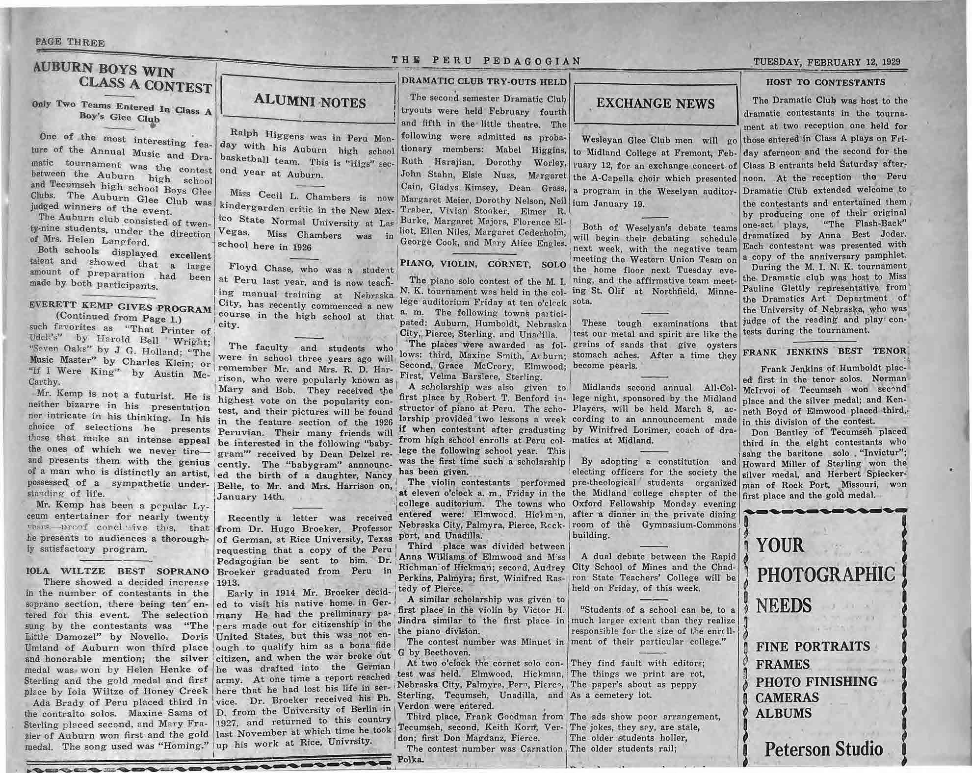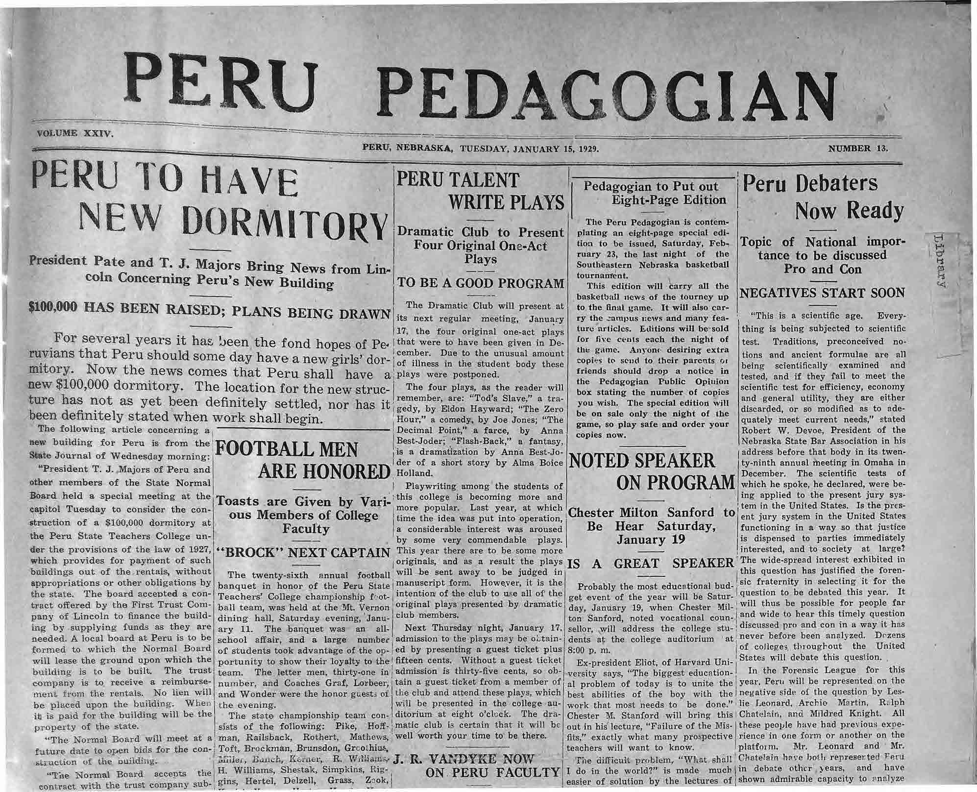 A!-te r. the t.a lk t h.ere was a soc j al been receiving the attention of Mrs. music al phraseology. Repeated bits Peru, Nebr. !Hei t.z f or t he pr esent, period m w hich the old and new Joder club sponsor. Tryouts are in of the French anthem, the Ma rseilles., Deb a te Edi t or ____ Ern est Hassel blad j to divi.de his time b etween win g a nd bec am e a cquaint ed. pr0<gress at present, and the cast will are to bp heard in the refr ain. Mr. Per u, Nebr. fullb ack O ffi cers for t he present s chool be a nnounced in a few d ays. This Do•yl•e was accompanied by Mr. R. T. . Each mem ber o:fl t he st aff h as bee n I Fr es hmen Stronger Than Usu al year fo llow: is a play of college athlet ic life, and Benford. • g1v-en work for t he coming yea r. and I This yea r's fresh men st ock has James . Delzell President w ill b e, in dr am atic t one, a rather Again last Friday the Music de- j everyt hin g is wOi·ki ng smoothly. ! taken a j ump considera ble abo'Ve par. Wilbur Schindler __ Vice Pr eside nt light comedy. had charge of the pro g ram, Mnr. h of sp ort materi a l_ nnd j T he squad s eems to be e nElton 'Reinmiller - -Tre asur er t his time presenting Mr Jindra and news_ t_h e colleg e will be I d ow:d plen ty of fight a nd h ave Leo Ha uptman Secretary'