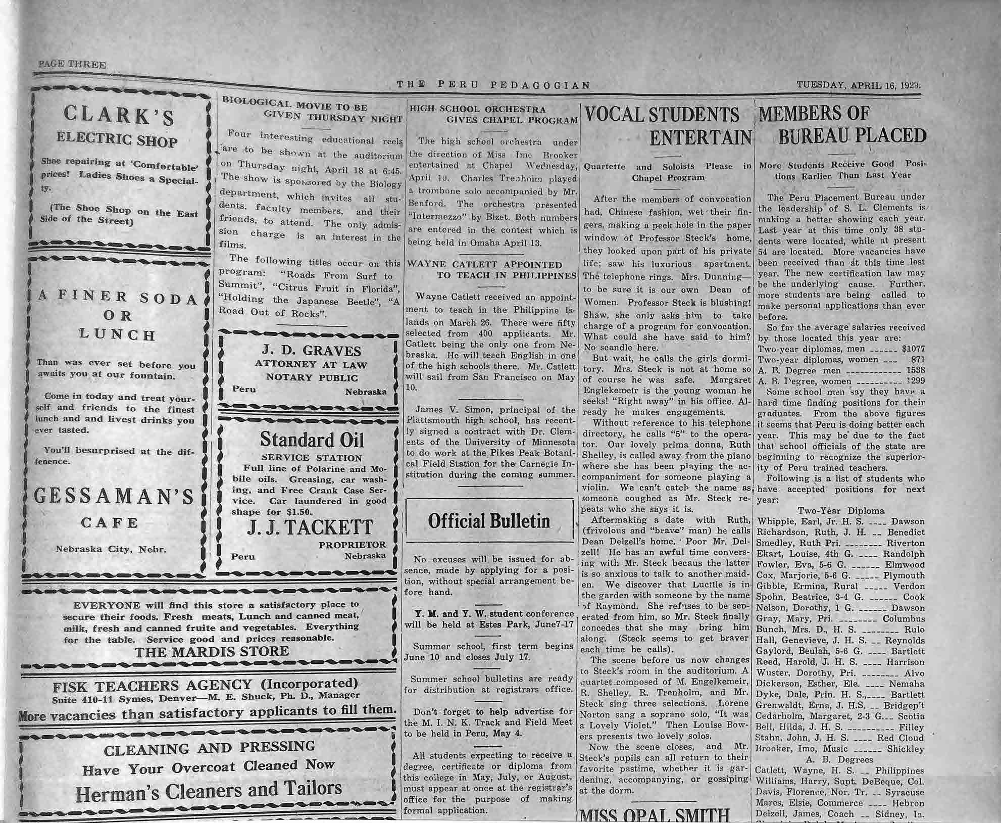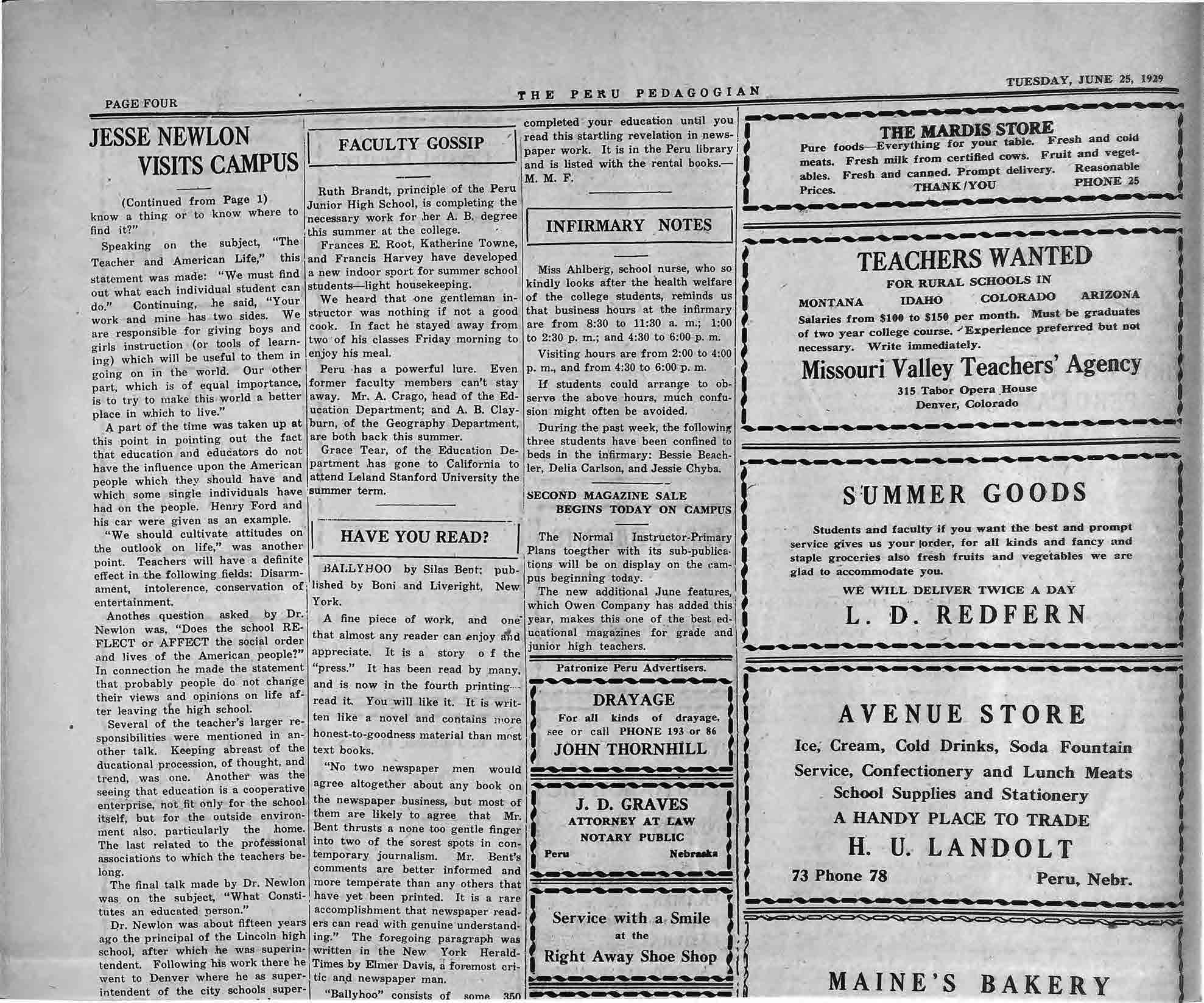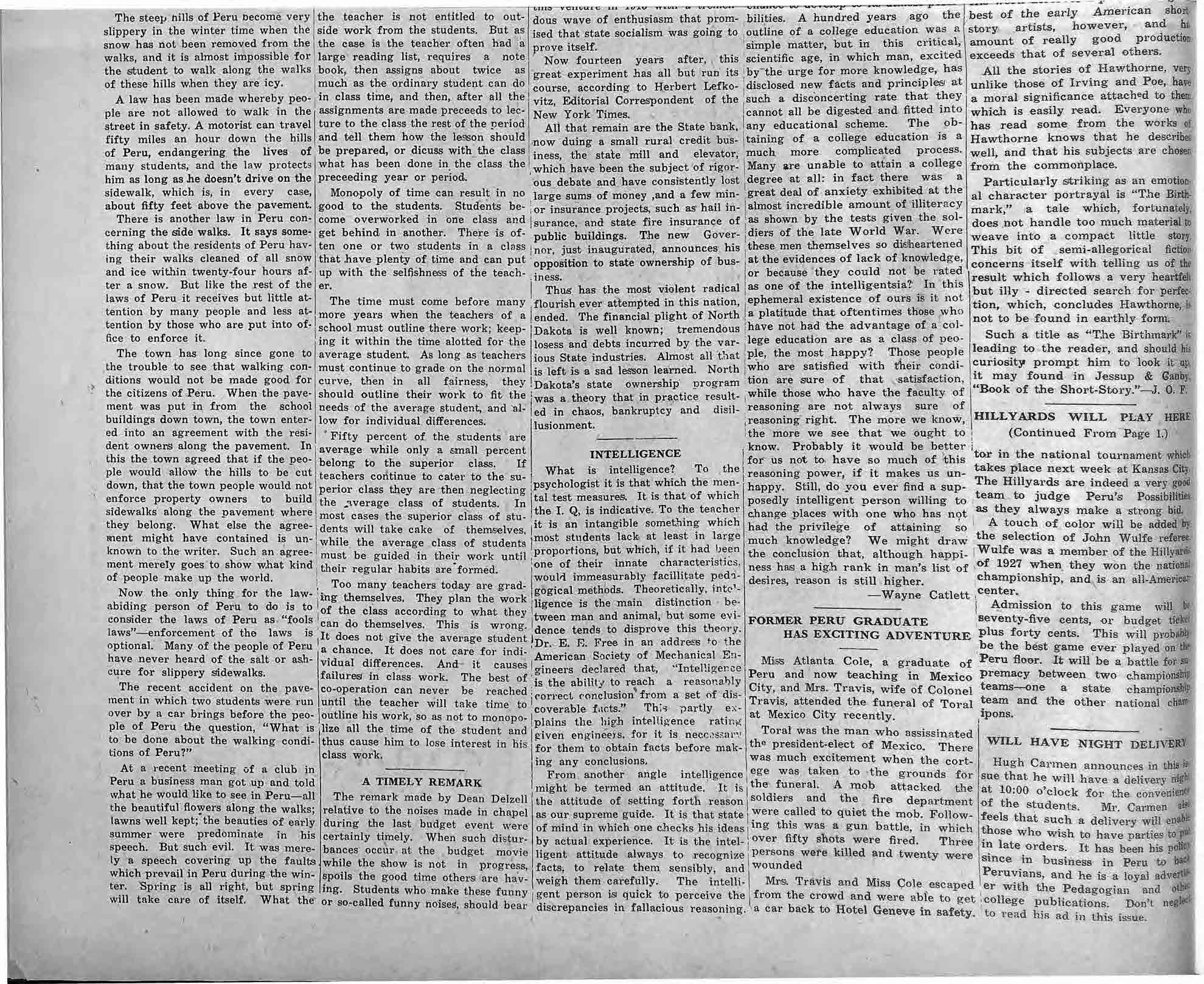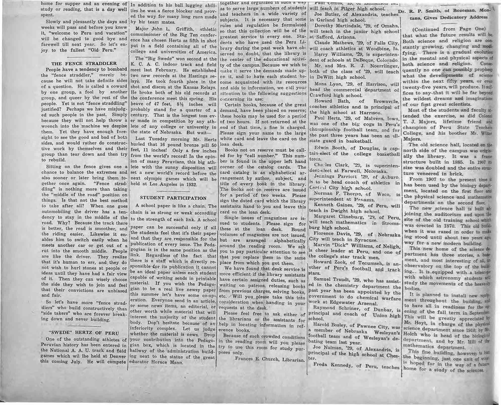 deli g htful rut in the world ; but how \ a bout out? I Some d ay when you're in the Ii- · -----------------.: I " I'm begin ning to realize how 1i tagain, when we speak of set- brary, take a look at the mag a zines Mr. and Mrs Linds ay ,. durin g the I . tie I re ally kn ow, but t han ks to my thng may be reminded in the miscellaneous corner of the summer, tr av·eled in W yomin g and Peruvian Tells o·f Former Campus tp;ractic·e t eachin g, I am g etting alon g alinost 1mmed1ately of the "grind." magazine rack. It seems as if all the Monta na collec ting material :flrom the I College Arrang·emen t v er y well, " writes Cecil St ark. super_'N ell, if it i.s,a continual grind, t here "queer ide as" in the country have IHistorical Soci-ety at Helen a,_ Wyo- int endent of the m unic ipal ward 1s something wron g. True enough, \somehow foun d their way to this min g, on the History of Nm:thern C ap you im agine black waln ut s ch oo l at Ch app el, Ne bras k a. Mr we may need to grind place. Also , it seems as if the g re a t- Wyoming, particularly in reg ard to Ib oard the co Hege campus? Sta rk his work, and h as been to sharpen the edge of intellect, but 1 er part of t his pile of propaganda the Big H orn Basin. Mr. an d Mrs. l?an you 1magme_ P eru with out an )made ch a irm an of the N. S. T. A. axe is continually on the /has been sadly neglected. P erhaps Lindsay went through all the n·ews- mch m town? Such was membership committee for Deuel g rmdstone will never do any wo•rk. students are doing a little thinkin a papers in northern Wyomin g and lth.e picture pamted· by C. L. Hopper, coun ty, He p lans to en roll D euel An incessant grind is no t hin g but a !for themselves, after all. .,,, sou thern Montana. They also inter- a student from to w.ho was coun ty t eachers one h un dred prerc en t. rut. · viewed old settJ.ers, among them, Mr. Ion the with his fa mily last ___ Look investigate . things CONC:ERNING BELIEFS Beck, w ho accompanied Cofone! w. \Wednesday. That brilliant ma n of affairs, A.rthBefore dec1dmg upon a Journey W. Cody into the Big Horn Bas in. When asked if Peru had changed ur Li nda hl, who r eceived his degreethrough this institution, search out We do not wish to open that old Ano t her ·eminent person whom they Iany since he was a student here, Mr. in 1927, is ag ai n among us as as sistyour dest inat ion, then select your much hashed-over controversar y-sci- in terv iewed was Mr. Hayden, who Hopper replied tliat t he girl's dor- ant to Dr. Brow n, re gist rar road. Most of them are well marked, -ence vs. religion-herein. W·e only surveyed the city of Cody, Wyom- mitory was the only :fiamiliar b uildin g s urfaced, but chucky _in_ spots. wish to urge students, particularly ing. Mr. Hayden is a .graduate of the and that Miss Clark, langu a ge in- \ Walter Alfs, d egTee '27, and Llo yd Select your work, hit it hard, do as new students, not to become unduly University of Nebraska. They inter- structor, was the sole survi vor of t he I Beemer, deg ree l ast su mmer are ·enmuc? else as you can. Don't be excited, and to look at the propmsi- viewed Mr. Hall, the man wha sent faculty of his day. He said th e Ijoying envi able posit ions 'teaching afraid to correct mistakes, or'. if ne- tion with their reason in control of the message from Fort Stanborough t:ees have made an enormous g rowth manu al t rain ing at Mankato, Minne:o start. -all agam Set- their intelligence. to Omaha, a nnouncin g Custer's de- smce 1901 The campus, with it's sota. Mr. Alfs is sup ervisor of mana trifle wanly; then keep In so fas as taking sides with be- Hall resides near Fort Wash- spaced buildings, and hust-jual arts tn the junior high s chool · liefs, many people seemingly find a ak1e. He has been in the state Sen- mg students, seems very small and lthere. You might go wron g, but volll at · W · d · cramp d h "d H J • d h b . • shii.rp corner to turn when they reach e smce yommg was a m1tted to e , e sa1 . e exn ame t at 1 pro ably won't. college. Adolescence is rather free 1the Union. on the plains Wal do Willhoft, who r ec-eiv.ed his OUR POLICY (almost caref1ree) minded ; and there Mr. Lindsay has the con tract to PerU, was used to degree in 1926, left Saturday fo r Ann is a sharp and sudden narrowing edit the papers of John w. Deane, miles and seemg no thi ng but Arbor, Michigan. He i ntends to -en-