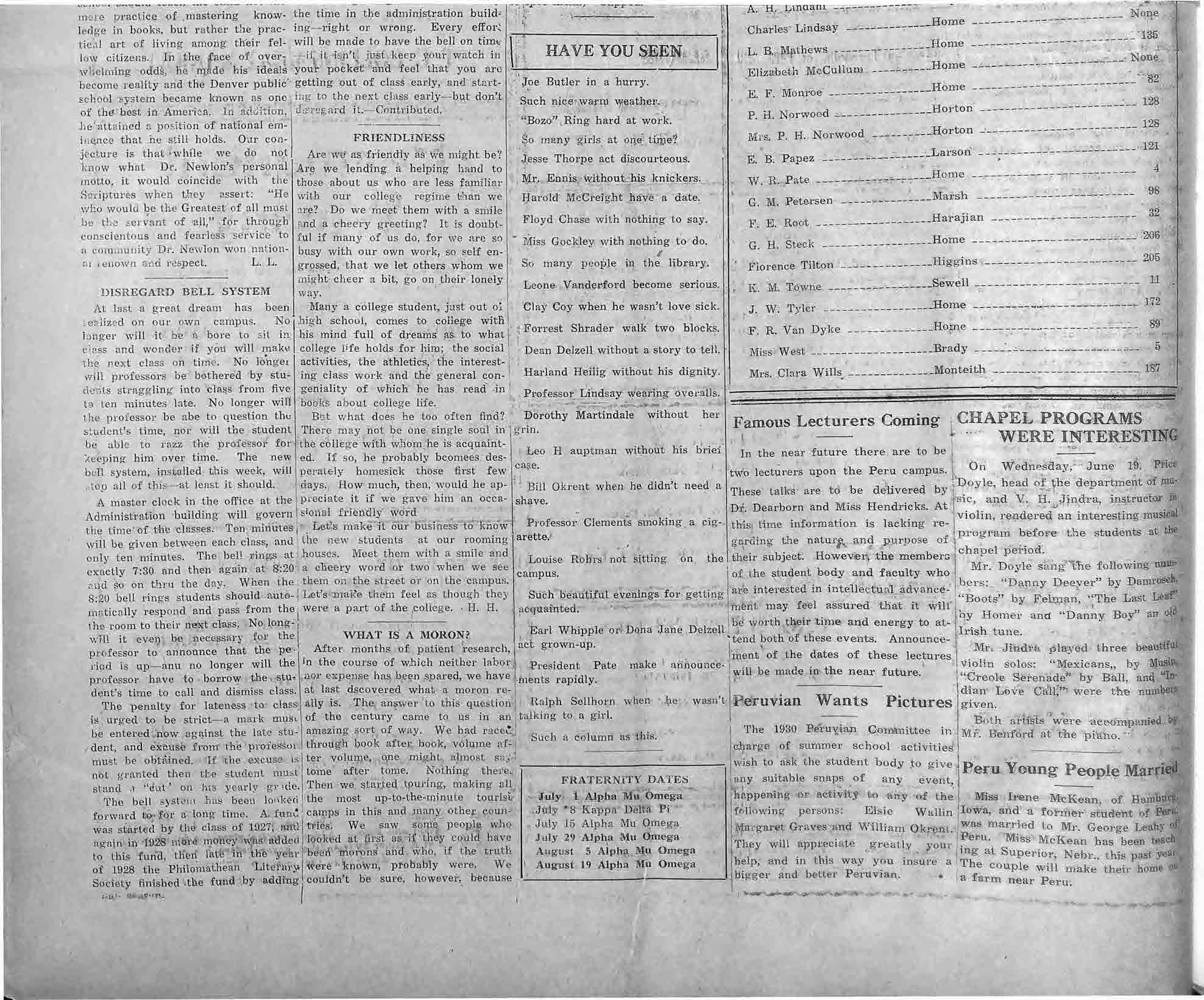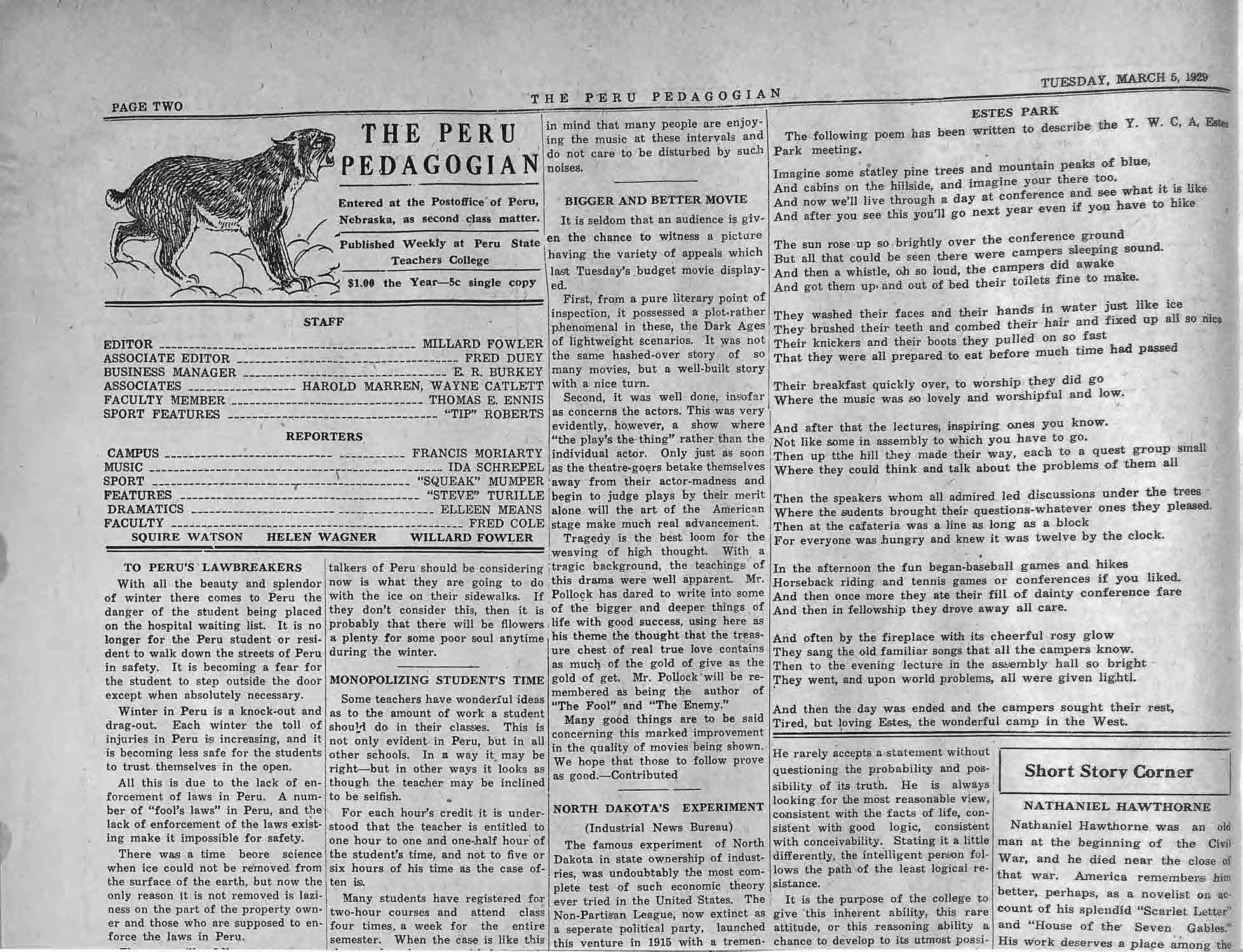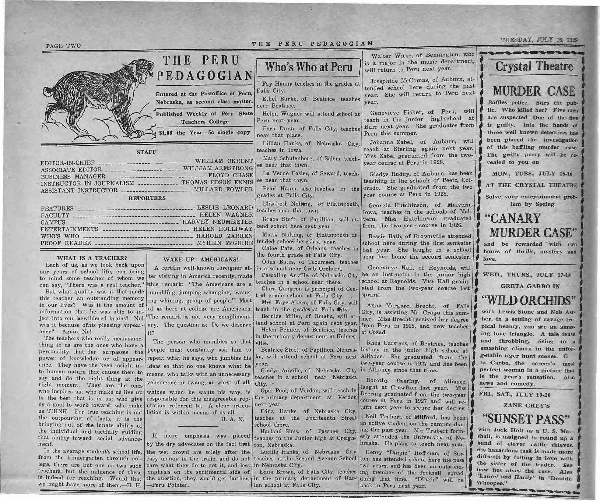 deli g htful rut in the world ; but how \ a bout out? I Some d ay when you're in the Ii- · -----------------.: I " I'm begin ning to realize how 1i tagain, when we speak of set- brary, take a look at the mag a zines Mr. and Mrs Linds ay ,. durin g the I . tie I re ally kn ow, but t han ks to my thng may be reminded in the miscellaneous corner of the summer, tr av·eled in W yomin g and Peruvian Tells o·f Former Campus tp;ractic·e t eachin g, I am g etting alon g alinost 1mmed1ately of the "grind." magazine rack. It seems as if all the Monta na collec ting material :flrom the I College Arrang·emen t v er y well, " writes Cecil St ark. super_'N ell, if it i.s,a continual grind, t here "queer ide as" in the country have IHistorical Soci-ety at Helen a,_ Wyo- int endent of the m unic ipal ward 1s something wron g. True enough, \somehow foun d their way to this min g, on the History of Nm:thern C ap you im agine black waln ut s ch oo l at Ch app el, Ne bras k a. Mr we may need to grind place. Also , it seems as if the g re a t- Wyoming, particularly in reg ard to Ib oard the co Hege campus? Sta rk his work, and h as been to sharpen the edge of intellect, but 1 er part of t his pile of propaganda the Big H orn Basin. Mr. an d Mrs. l?an you 1magme_ P eru with out an )made ch a irm an of the N. S. T. A. axe is continually on the /has been sadly neglected. P erhaps Lindsay went through all the n·ews- mch m town? Such was membership committee for Deuel g rmdstone will never do any wo•rk. students are doing a little thinkin a papers in northern Wyomin g and lth.e picture pamted· by C. L. Hopper, coun ty, He p lans to en roll D euel An incessant grind is no t hin g but a !for themselves, after all. .,,, sou thern Montana. They also inter- a student from to w.ho was coun ty t eachers one h un dred prerc en t. rut. · viewed old settJ.ers, among them, Mr. Ion the with his fa mily last ___ Look investigate . things CONC:ERNING BELIEFS Beck, w ho accompanied Cofone! w. \Wednesday. That brilliant ma n of affairs, A.rthBefore dec1dmg upon a Journey W. Cody into the Big Horn Bas in. When asked if Peru had changed ur Li nda hl, who r eceived his degreethrough this institution, search out We do not wish to open that old Ano t her ·eminent person whom they Iany since he was a student here, Mr. in 1927, is ag ai n among us as as sistyour dest inat ion, then select your much hashed-over controversar y-sci- in terv iewed was Mr. Hayden, who Hopper replied tliat t he girl's dor- ant to Dr. Brow n, re gist rar road. Most of them are well marked, -ence vs. religion-herein. W·e only surveyed the city of Cody, Wyom- mitory was the only :fiamiliar b uildin g s urfaced, but chucky _in_ spots. wish to urge students, particularly ing. Mr. Hayden is a .graduate of the and that Miss Clark, langu a ge in- \ Walter Alfs, d egTee '27, and Llo yd Select your work, hit it hard, do as new students, not to become unduly University of Nebraska. They inter- structor, was the sole survi vor of t he I Beemer, deg ree l ast su mmer are ·enmuc? else as you can. Don't be excited, and to look at the propmsi- viewed Mr. Hall, the man wha sent faculty of his day. He said th e Ijoying envi able posit ions 'teaching afraid to correct mistakes, or'. if ne- tion with their reason in control of the message from Fort Stanborough t:ees have made an enormous g rowth manu al t rain ing at Mankato, Minne:o start. -all agam Set- their intelligence. to Omaha, a nnouncin g Custer's de- smce 1901 The campus, with it's sota. Mr. Alfs is sup ervisor of mana trifle wanly; then keep In so fas as taking sides with be- Hall resides near Fort Wash- spaced buildings, and hust-jual arts tn the junior high s chool · liefs, many people seemingly find a ak1e. He has been in the state Sen- mg students, seems very small and lthere. You might go wron g, but volll at · W · d · cramp d h "d H J • d h b . • shii.rp corner to turn when they reach e smce yommg was a m1tted to e , e sa1 . e exn ame t at 1 pro ably won't. college. Adolescence is rather free 1the Union. on the plains Wal do Willhoft, who r ec-eiv.ed his OUR POLICY (almost caref1ree) minded ; and there Mr. Lindsay has the con tract to PerU, was used to degree in 1926, left Saturday fo r Ann is a sharp and sudden narrowing edit the papers of John w. Deane, miles and seemg no thi ng but Arbor, Michigan. He i ntends to -en-