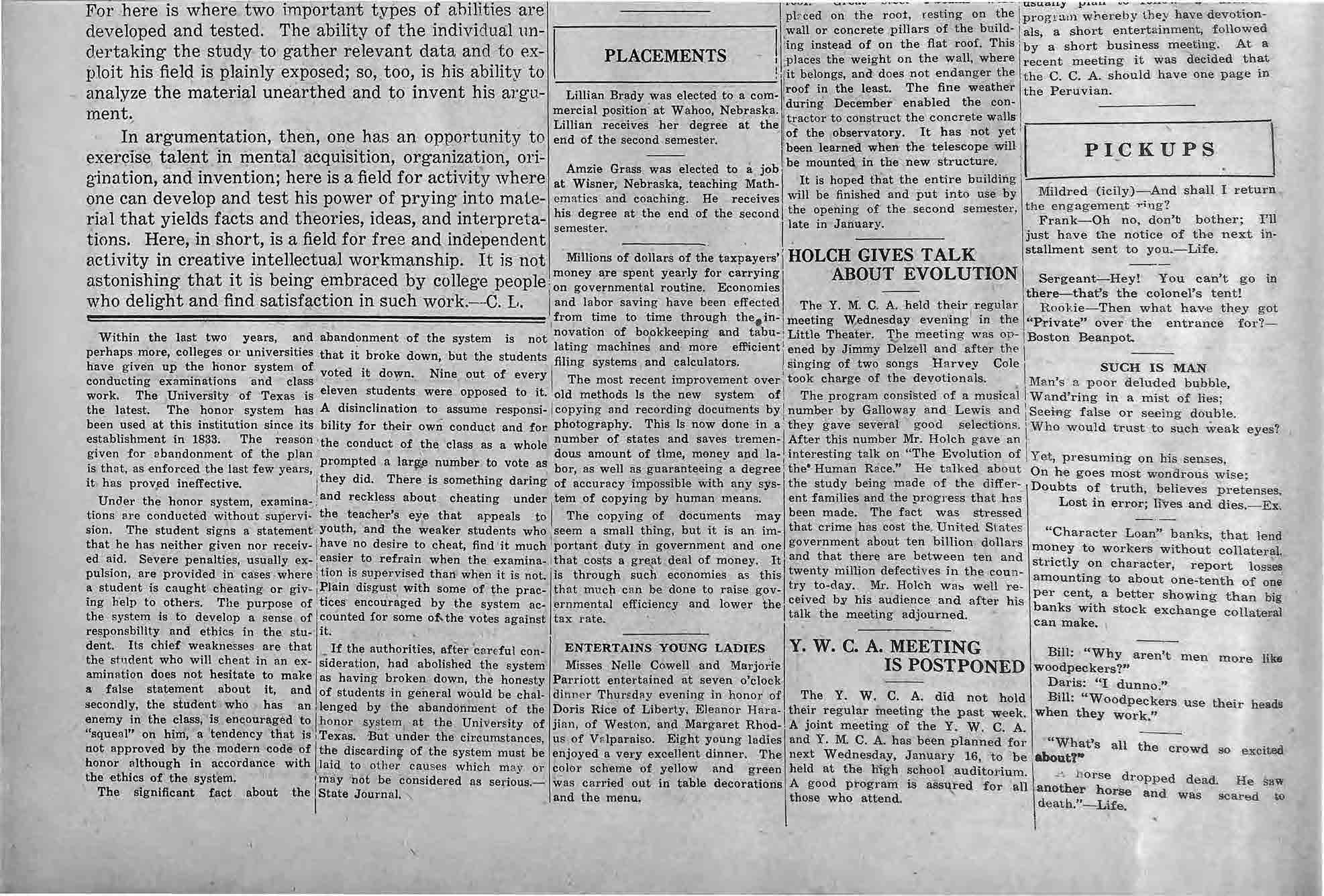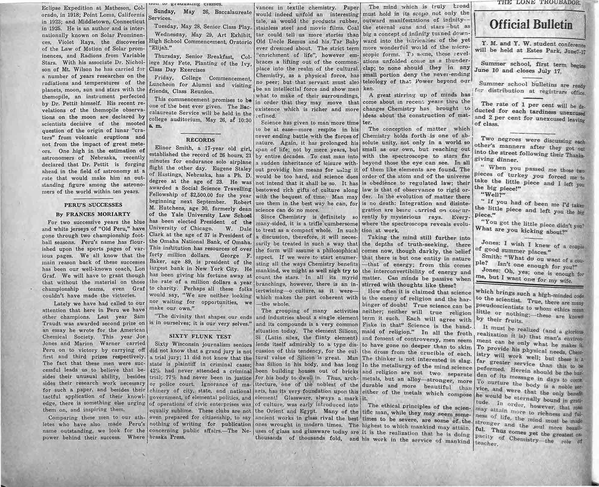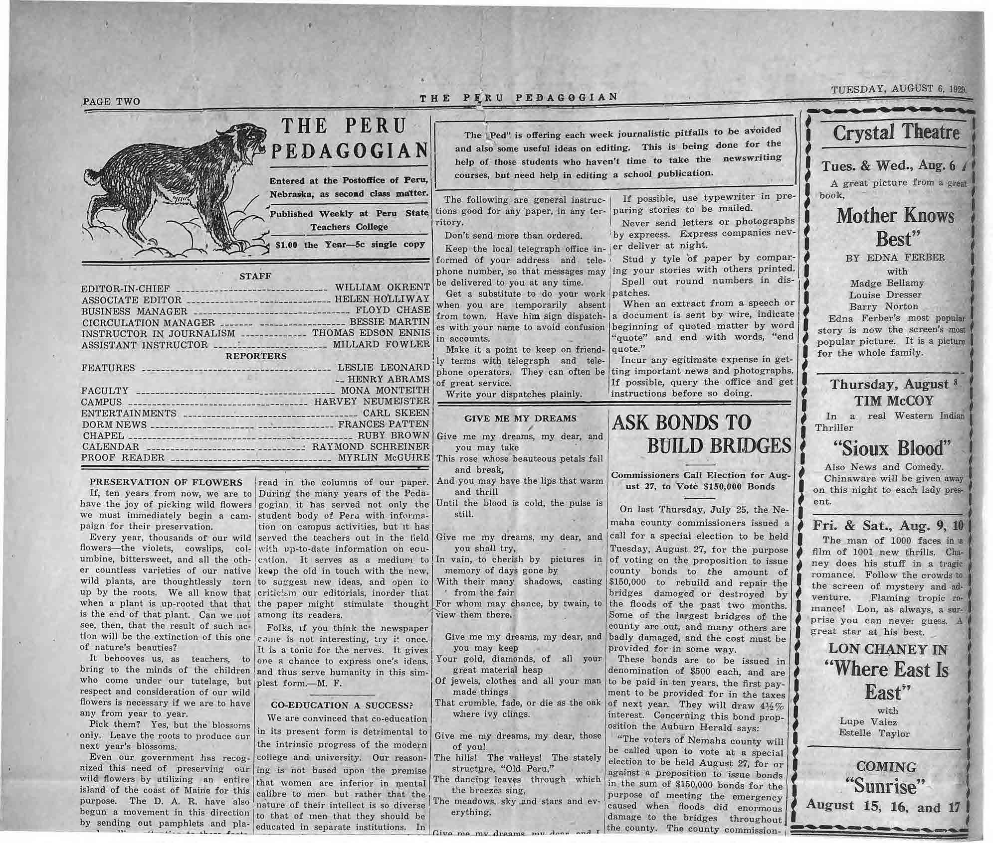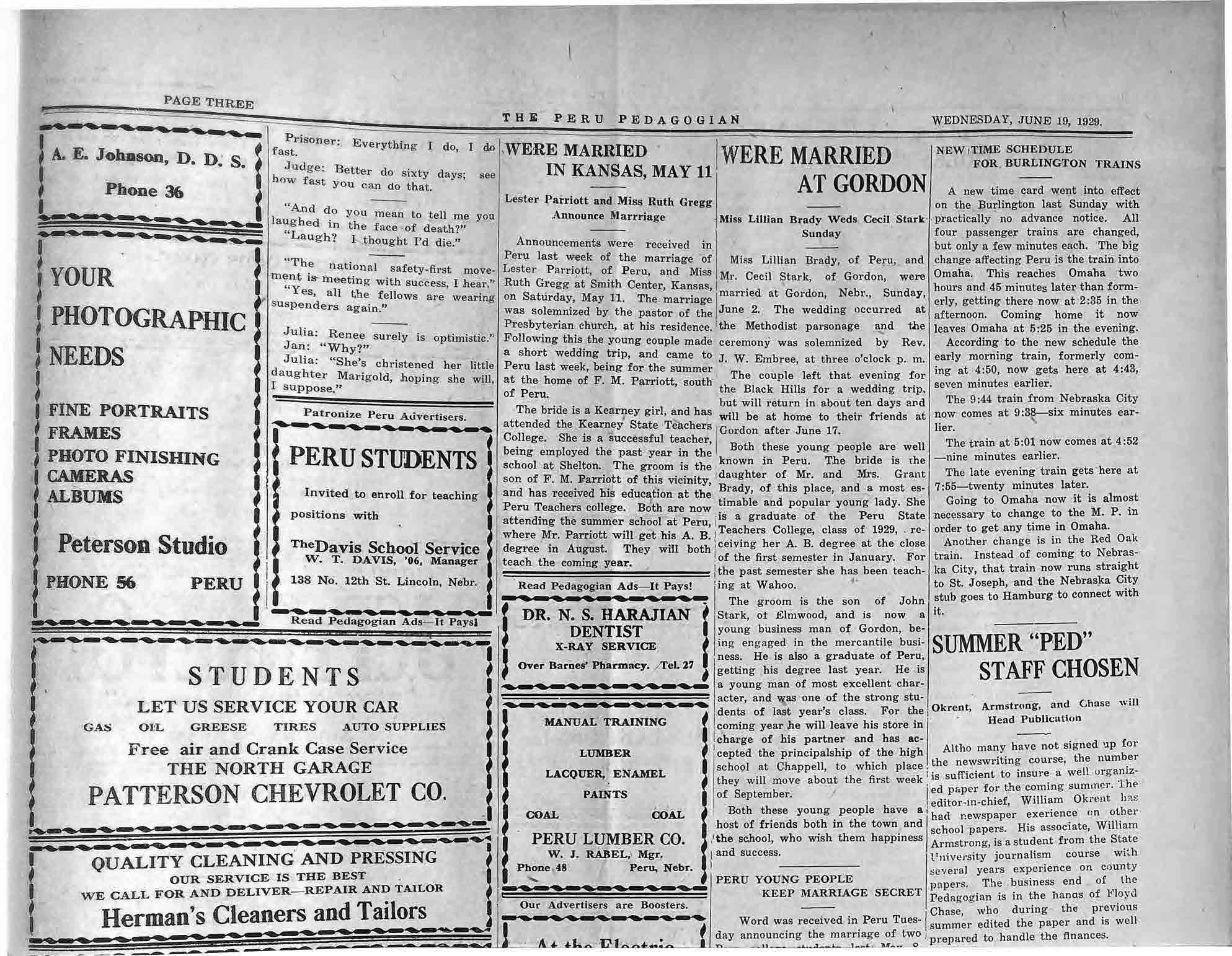 deli g htful rut in the world ; but how \ a bout out? I Some d ay when you're in the Ii- · -----------------.: I " I'm begin ning to realize how 1i tagain, when we speak of set- brary, take a look at the mag a zines Mr. and Mrs Linds ay ,. durin g the I . tie I re ally kn ow, but t han ks to my thng may be reminded in the miscellaneous corner of the summer, tr av·eled in W yomin g and Peruvian Tells o·f Former Campus tp;ractic·e t eachin g, I am g etting alon g alinost 1mmed1ately of the "grind." magazine rack. It seems as if all the Monta na collec ting material :flrom the I College Arrang·emen t v er y well, " writes Cecil St ark. super_'N ell, if it i.s,a continual grind, t here "queer ide as" in the country have IHistorical Soci-ety at Helen a,_ Wyo- int endent of the m unic ipal ward 1s something wron g. True enough, \somehow foun d their way to this min g, on the History of Nm:thern C ap you im agine black waln ut s ch oo l at Ch app el, Ne bras k a. Mr we may need to grind place. Also , it seems as if the g re a t- Wyoming, particularly in reg ard to Ib oard the co Hege campus? Sta rk his work, and h as been to sharpen the edge of intellect, but 1 er part of t his pile of propaganda the Big H orn Basin. Mr. an d Mrs. l?an you 1magme_ P eru with out an )made ch a irm an of the N. S. T. A. axe is continually on the /has been sadly neglected. P erhaps Lindsay went through all the n·ews- mch m town? Such was membership committee for Deuel g rmdstone will never do any wo•rk. students are doing a little thinkin a papers in northern Wyomin g and lth.e picture pamted· by C. L. Hopper, coun ty, He p lans to en roll D euel An incessant grind is no t hin g but a !for themselves, after all. .,,, sou thern Montana. They also inter- a student from to w.ho was coun ty t eachers one h un dred prerc en t. rut. · viewed old settJ.ers, among them, Mr. Ion the with his fa mily last ___ Look investigate . things CONC:ERNING BELIEFS Beck, w ho accompanied Cofone! w. \Wednesday. That brilliant ma n of affairs, A.rthBefore dec1dmg upon a Journey W. Cody into the Big Horn Bas in. When asked if Peru had changed ur Li nda hl, who r eceived his degreethrough this institution, search out We do not wish to open that old Ano t her ·eminent person whom they Iany since he was a student here, Mr. in 1927, is ag ai n among us as as sistyour dest inat ion, then select your much hashed-over controversar y-sci- in terv iewed was Mr. Hayden, who Hopper replied tliat t he girl's dor- ant to Dr. Brow n, re gist rar road. Most of them are well marked, -ence vs. religion-herein. W·e only surveyed the city of Cody, Wyom- mitory was the only :fiamiliar b uildin g s urfaced, but chucky _in_ spots. wish to urge students, particularly ing. Mr. Hayden is a .graduate of the and that Miss Clark, langu a ge in- \ Walter Alfs, d egTee '27, and Llo yd Select your work, hit it hard, do as new students, not to become unduly University of Nebraska. They inter- structor, was the sole survi vor of t he I Beemer, deg ree l ast su mmer are ·enmuc? else as you can. Don't be excited, and to look at the propmsi- viewed Mr. Hall, the man wha sent faculty of his day. He said th e Ijoying envi able posit ions 'teaching afraid to correct mistakes, or'. if ne- tion with their reason in control of the message from Fort Stanborough t:ees have made an enormous g rowth manu al t rain ing at Mankato, Minne:o start. -all agam Set- their intelligence. to Omaha, a nnouncin g Custer's de- smce 1901 The campus, with it's sota. Mr. Alfs is sup ervisor of mana trifle wanly; then keep In so fas as taking sides with be- Hall resides near Fort Wash- spaced buildings, and hust-jual arts tn the junior high s chool · liefs, many people seemingly find a ak1e. He has been in the state Sen- mg students, seems very small and lthere. You might go wron g, but volll at · W · d · cramp d h "d H J • d h b . • shii.rp corner to turn when they reach e smce yommg was a m1tted to e , e sa1 . e exn ame t at 1 pro ably won't. college. Adolescence is rather free 1the Union. on the plains Wal do Willhoft, who r ec-eiv.ed his OUR POLICY (almost caref1ree) minded ; and there Mr. Lindsay has the con tract to PerU, was used to degree in 1926, left Saturday fo r Ann is a sharp and sudden narrowing edit the papers of John w. Deane, miles and seemg no thi ng but Arbor, Michigan. He i ntends to -en-
