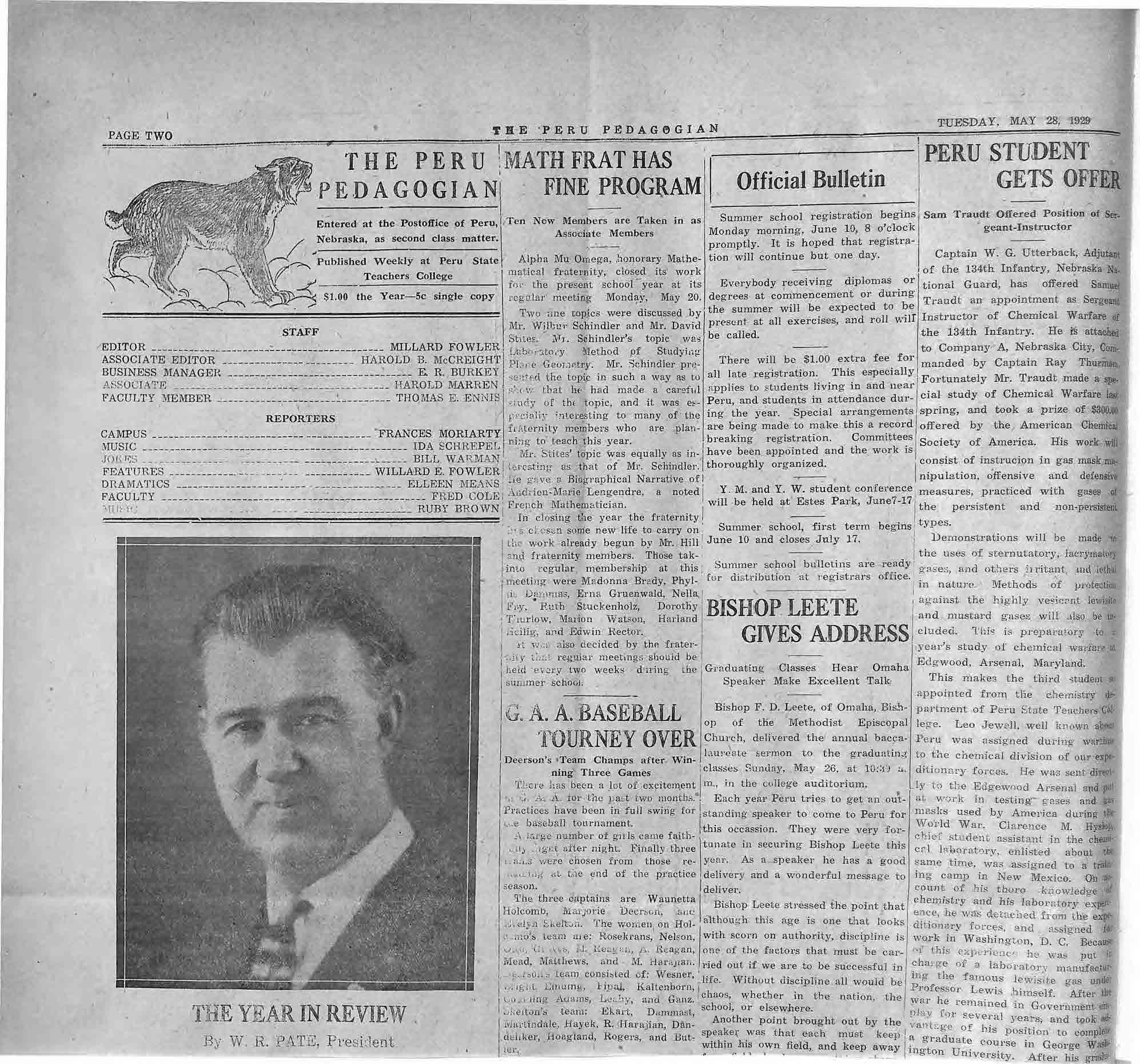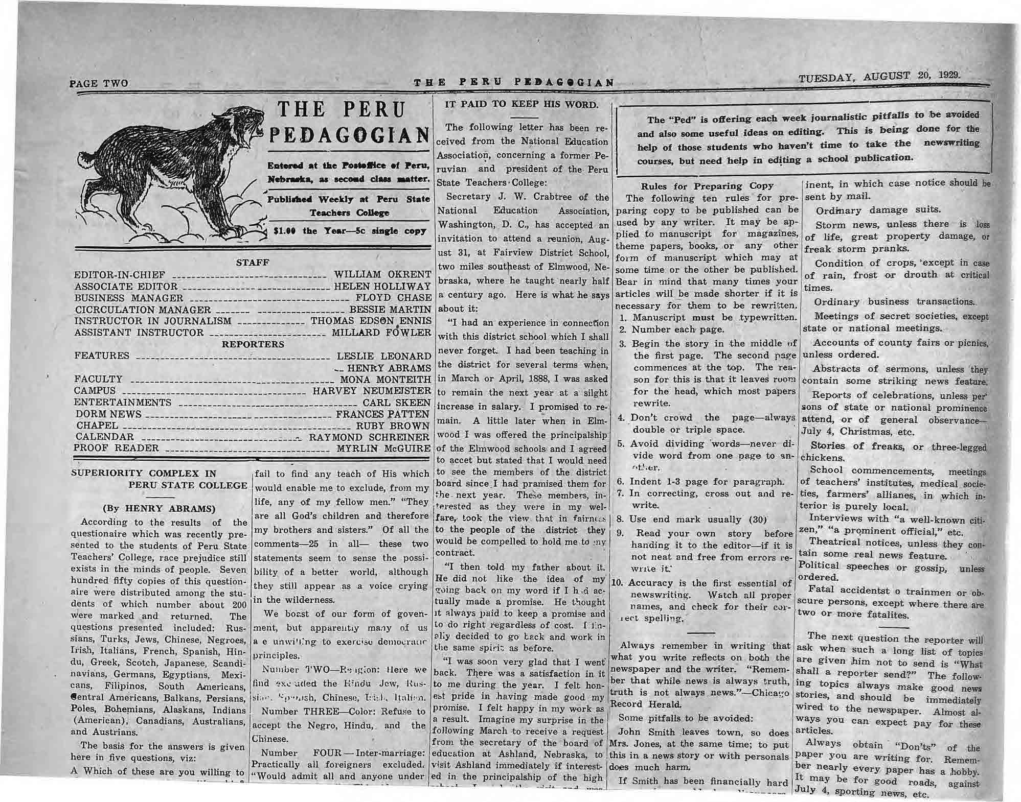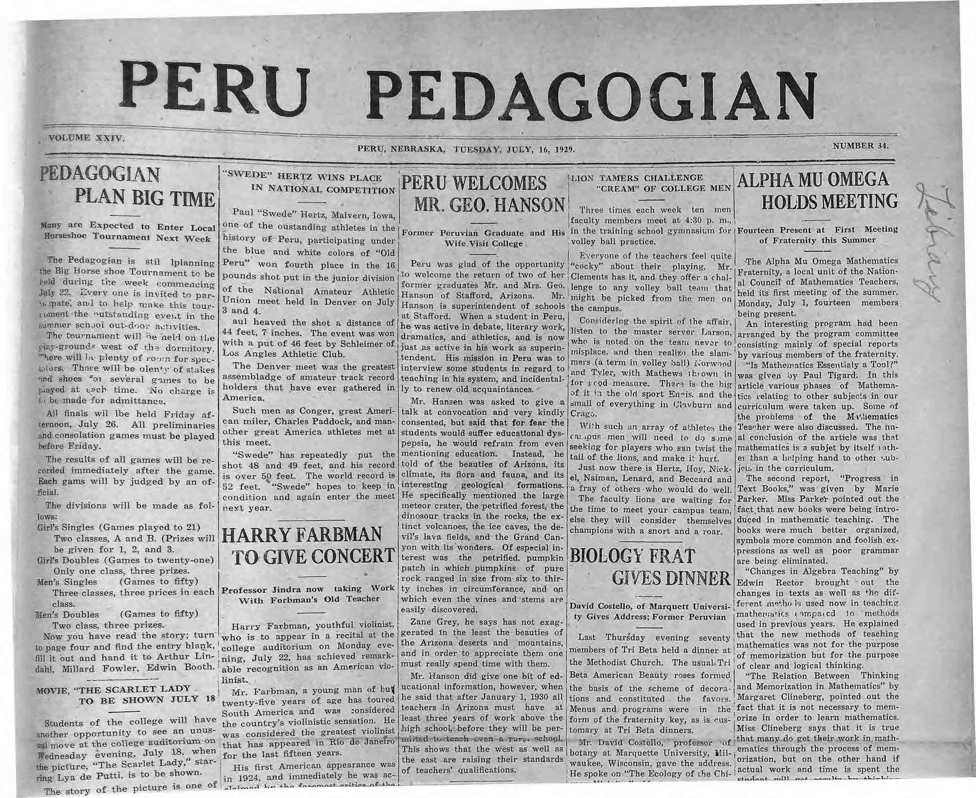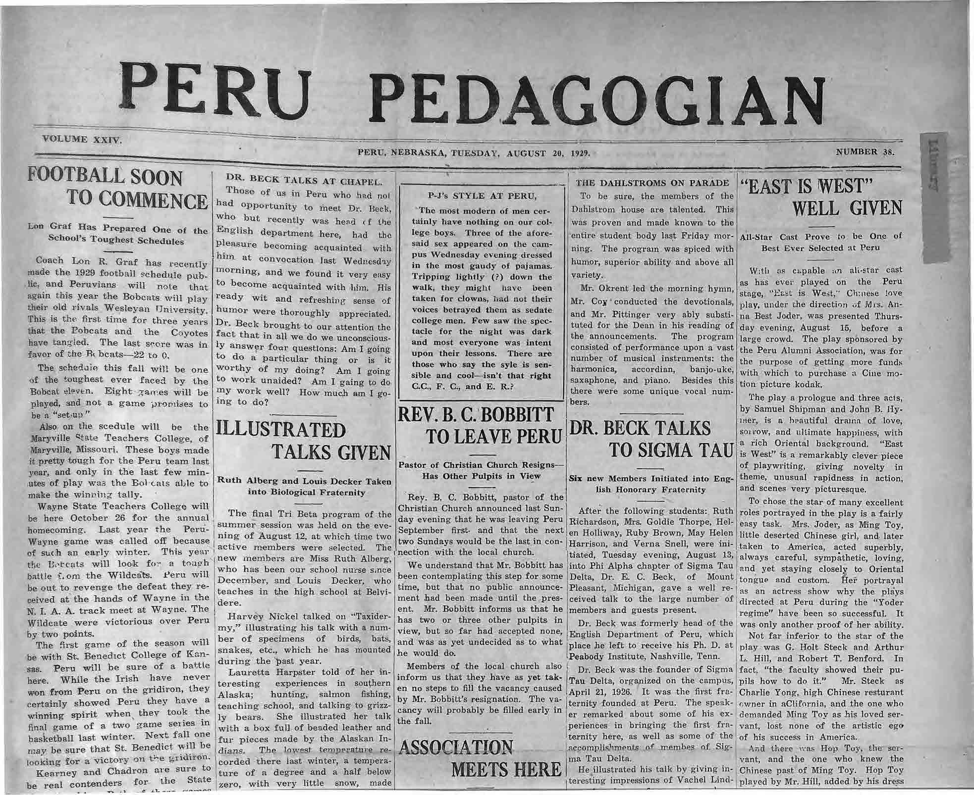 We believe i·n the newspaper as an Nabody h' ht t an d Chief Washak1e on a raiding ex- \which was high rn 1901, and which as a ng o make a de- dT · h · 1 a d h" t d influence for good. By mak1"ng the cision wh" h d" 1· . !Pe I ion mto t e Big Ho rn Basin. IC use im o sen several studen ts m 1savows re 1g1on or re- Th" · t P · "d · Pedagogi an a g ood newspaper, we pudiates 1 1s was t he raid called Bates's B at- 0 eru, is evi ent m today's graducan also make it a poten tial influence yea ' t' m ess two tie orf July 4, 1847. ates of P.eru, he declared. He has for the upbuilding o:f1 the school. rs 1; colleg·e. And, m two Mr. Lindsay wi'l l use this material ..s'een several members of Peru's a lumTh f th h" ty.earstho s Y with careful medita- he has collect:ed for his doc tor's di s- \ni w ho have suc ceeded in their ere oire, e t mgs which in our 1011, ere is very mu ch less dang t t' H · · "Th ' fi · q own minds, are good wi'll b e' placed of a a· 1 · er ser a 10n. e 1s assistant professor I e cert1 cate issued to me is still ny ra 1ca revo lut·o t k' I · h" · rd · wi.th in _its pages We expect that 1 n a mg P ace. m istory an d other social sciences Iva I · It nearly expired rec en t ly, but some of you will not 1 Reh gwn IS too vital a t hi ng-too and instructor in English at Peru I was called on to fill an unexpec t ed a ways agr ee ancient · I 1 H · · with wh at we say- in fact e d t a Je a ous Y preserved preced- e 1s a graduate of the University of vacanc y, an d that preserved it" he ' ' w 0 no ent set bv N b k · ·a Mr H h ' want everybody to agree with what , · : ou r be cast ·e ras a with the A. B. and M. A. sa1 · opper as his home we say, fpr an unop,posed statem nt hastil y Science 1s too positive, de g rees, and a gr adu ate student at o_n a ra nch at Hay Spnn gs, Ne braska , is ooten one of li.tt\e moment. H:w- convmcmg a thing to be blindly the Univ ersi ty of Minnesota. retiring from the teaching proever, if you do disagree w'th ig nored. And here is the marro•w of fess1on. come around a nd tell us the whole Neither h as any busi- Mr. E. C. Beck, former Profess or Anyone who h as any :flaith in a con- ness meddling' m the other's business. a nd Head of the English Department E.AiRLY ' ELEMENTARY ELECTION viction should not be afrai d to set it D? not t hink yon are "straddlin g of Peru S tate T eachers College was forth. With this purpose in mind the issue" when you try to view both a welcomed visitor on the campus rewe are creating a Public of them fair-mindedly. Yo u are .not, cen tl y. Mr. Beck receiv ed his Ph. D. 10n co1lumn, wherein anybody has the for they are separate spheres ofl from Peabody College at Nashv ille right to air his views in a signed t hought- "as far as the east is from Tenn essee. .He will be the head of stateme nt. We hope it will be u se d. t he west." the En.g lish Department of Mount . it will the policy of the . Shall we g iv·e up our reli g ion? PJ.eas ant Normal School, Moun t Pleased1torial staff to mclude. as much as Ce1·tain ly not Sh II h . . ant, Michi ga n. Mr. Beck was g radu'bl · a we, t en ig nore t d · h h poss1 e, creative matenal of merit what science teaches? N ' ·1 a e wit t e Class of 1912, of which by Peru students. M:ake your mi"nd heh. lfven Y· W. N. Delzell was adviser