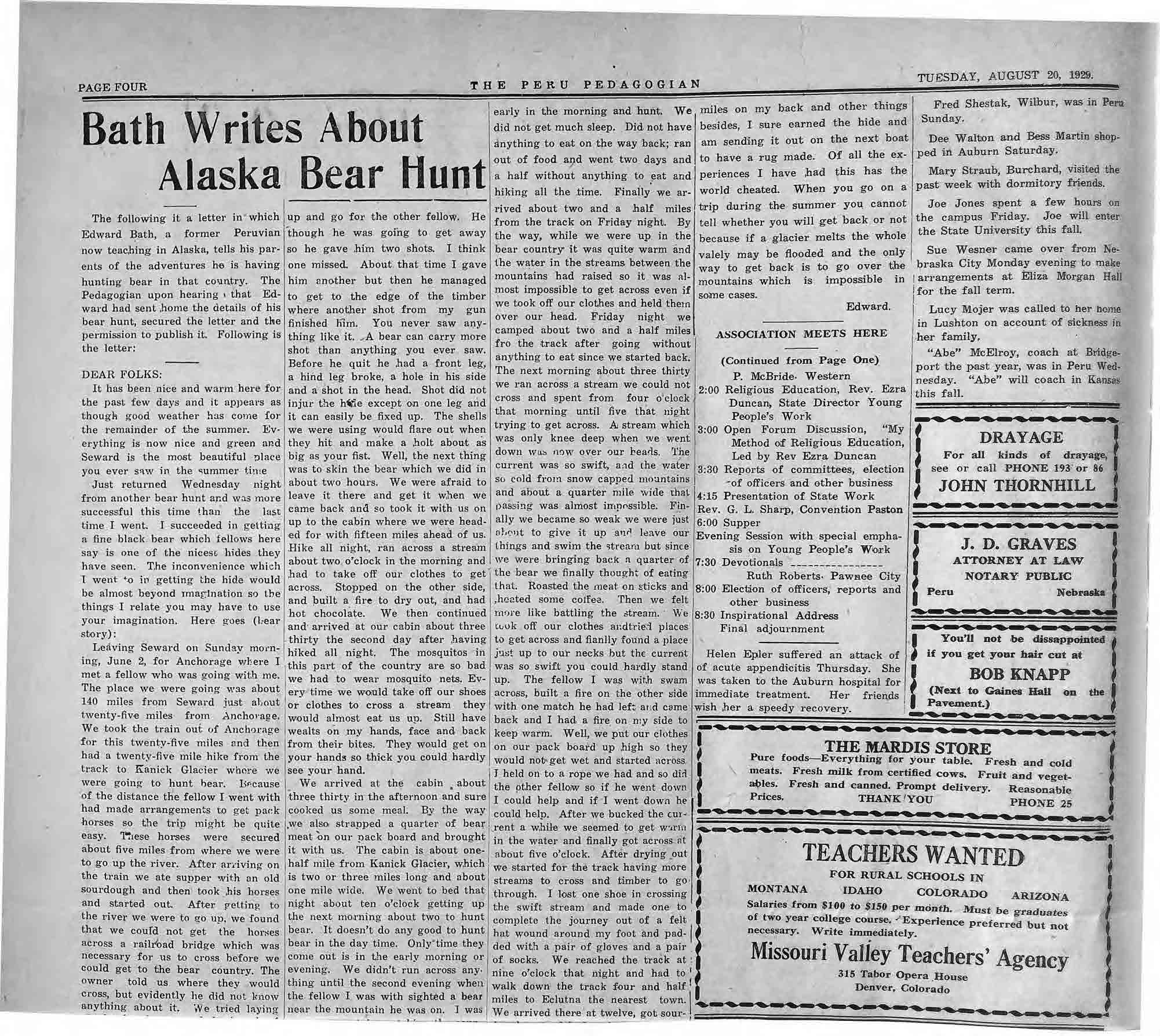 say is one of the nicest hides th ey b f y T h ave seen. T,he inconvenience which about two o'clock in the mornin g and we were bringing ack n quarter o 7:30 Devotionals ' ATTORNE A LAW 1 went •.o in gettin g t he hide would h R d th d ,had to take off our clothes to get ' the bear we finally thought of eating Ruth Roberts. Paw.flee City NOTARY PUBLIC ' across. Stopped on the other side, t at oaste e meat on an 8: 00 Elect:i-On of officers, reports and Peru Nebraska be a lm ost beyond so the h d f ·rh f J - and )mil t a fire to dry out, and had , Cl!.te some cot ee. en we et other business thin.gs I rel ate you may have to use h ot chocolate. We then continued rnr,re like battling t he <>tr.earn.· We 8:30 Inspirational Address your im agina ti-0n. Here go es (!rear and· arrived at our cabin about three tv uk off our clothes a1:dt.rie;i places Final adjou r nment