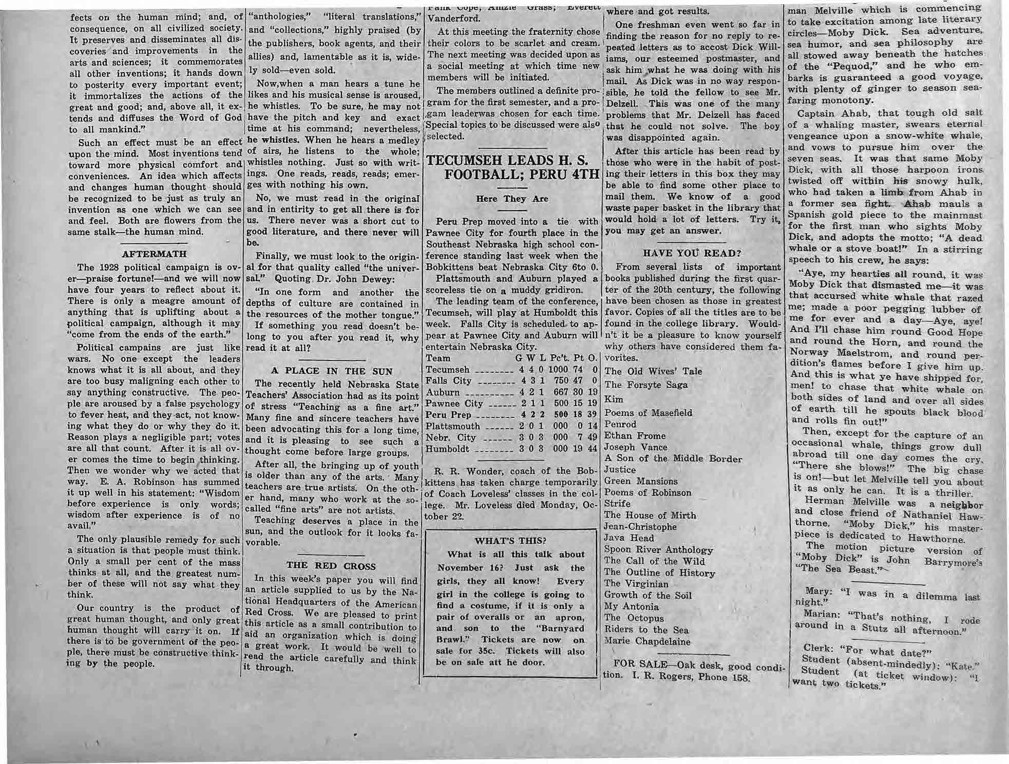 ri d a nese lanterns, t hey headed the m arch Oct. 12 Tecumseh, there. 1m achine ta ke the field aga in st the to .the cam pus where .t hey formed Annual Fall Play for 1928 Will Be : Oct. 19 Falls City, there. IJones, Ke ist e t, Cha telain , and Boot ? Kansa n s. an aisle for the upper classme n to "The Poor Nut" Nov. 2 Nebraska City, her e. I Will Head Publication Cap tain ·Daris Bunch, 208 p ound er, march thr ou gh. Br ick ice cr eam a nd 1 No v. 16 Shubert, there. · 'seem s likely to ge t the ca ll at ce n ter, cooki es made t he freshmen 's wa it CAS TI NG IN :PROGRESS Nov. 23 there. I"TIP" TO WRITE SPORTS w hil e a locker room full of b acks and wor th whil e. 1 No v. 29 Auburn, here. ' asp itra n ts fo r pos it ion s on the fo r-