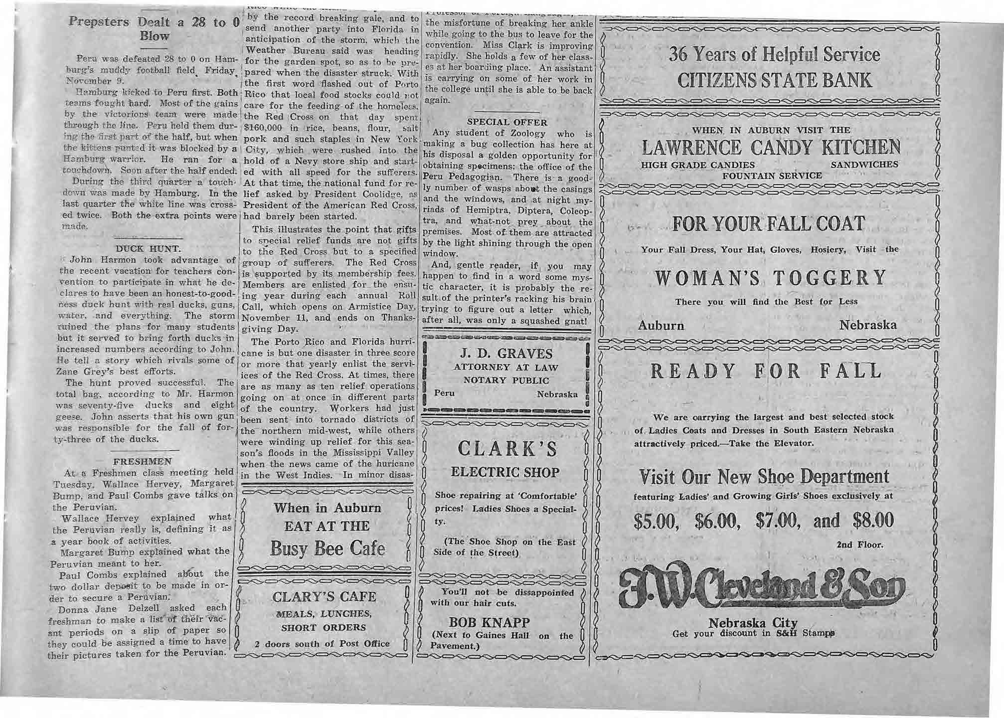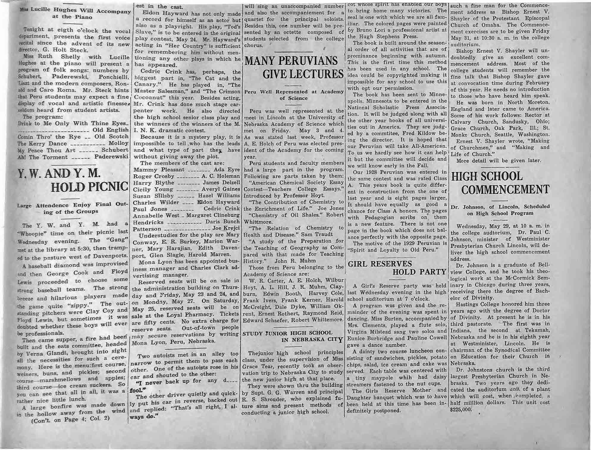 The Y. M. C. A. held its firs t m eet- Harvey Cole Leland Lamb GIVE CLASSIC NUMBERS Ass't. Bus. ere r.Ed · B hi D elzell, R. H. Wiling of t he year September 12 in the Frank Cope Lois Metcalf p i·k _h___ Dou gl;s, wm oot F;wGler, Hurdle, Shestak, SimpLittle Theatre. Clay Coy Lucille Newcomer eru i es to ear Mr. Doyle sin g. ;Sports EditO'I· "T' " R b . . ms an rass g uards, a nd Miller Of particular merit were t wo num- 1 B bi p 0 erts and Brnnsdon to substitute for CapIn a s hort open iing 'address James IElvin Da v enport HarV'ey Nickel b . rownv1 e, e r. : · B . Delzell, pr esident of the a ssociation, Donna Jane Delzell William Okrent ers offered by this popul ar instruc- IAss't Sports Edi t or ___ Rol a nd Kreps Itam unch at the pivo t pp st. welcomed the new c omers. and urg ed Anna Donner Edith Prokes tor last Wednes:day at convocation. ! Da wson, Nebr. , . Most likely candidat es fo r posi tions th at every one co-oP'e rate to make t his 1 Don a ld Duryea Edward Shaefer sung was the ari a !Society Ed itor ____ Hazel Hutc hin so n I the bac_kfield include Zook, K rebtgg·est an d best ye ar for the I Fairhea.d Russell Shaefer from ElLJah , Now Take Away My I · Albion Ne braska , JCI,. a nd Li v ermore at qu arter wi th college Y. M. C. A. Corrnn·e Frye Ralph Sellh prn written ?Y Mendolssohn. Be- 1' Campus Editor -.' __ L_ Lucil e Dowe ll : "Big Joe" rulin g favori t e; Ca seb eer, !_,eo Hau ptman and Ralph Chate- i Ruth Ganz Earl Whipple .of. a very high type, this number Farragut, Iowa ISautt er'. Hart, Hurst, Sams, lam represent ed Peru at- the Estes· Marguerite Graves Walter Wiese cli.fficult to render. Mr. Doyle did !Faculty Editor __ Ha rold McCreight . and W1cma m the halfback holes Park Y. M. C. A. conference this Velma Hansell EU.en Wilson it well. Fairbury, Nebr. :-a nd Hertz and H art answerin g at su mmer. Mr. Hauptman brought Mary Hervey · The second song, "The Two Gren- jFeature EditoT ______ George Cook; fullb ack. Casebeer, Sa utter and b.ack a very interest ing The a nnual fall "The :Pooi;- adiers" (Schumann), is part icularly i Nebr a ska City, Nebr. I Zook been given t he ma n-sizti ve report of t he coovent10n. Nut", by J. C. and Ellen Nug ent, has interesting after an of its IAc t ivi ties Edit or _R aymond Ti enholm. eel assig nment doin g· t he kickin g.