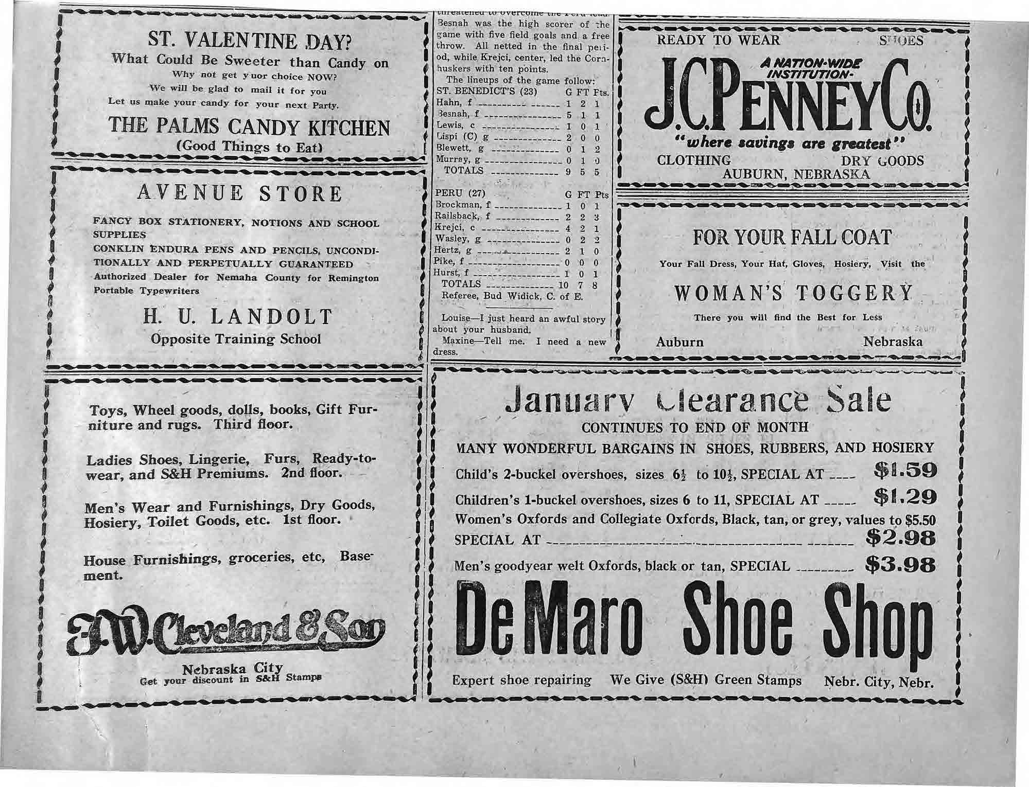 On last Wed nesday ni g ht the Y. M. W ill Be D . ' dition of Beethoven's "Contra ...I at that pos1t10n on th-e fi rs t-ye a1· _ Performed in Peru urmg C. A. and Y. W. C. A. he ld a joint . Dance." - squad, w hile Co a ch Loveless h as unHolidays meeting in the hi gh school audit or- Following these Mr. Jindra "played Dr. G. B. Do1son To He ad Depart- 1 covered a shifty pair of en ds in i:im·. Mary took of t he "And Thou Bethlehem" is the title ; his second number first," whi ch w as ment at Nebraska Wesleyan Claussen of Hart in gton an d Cowell s ingmg fo lJ owmg which Ave ryl . "S · h D ,, b - R b H' of P eru. Rect or of Weeping Water . ' . of a Chnstmas cantata recently com- pams ance · Yi_ o y n. 1s sec- Games lead the dev otional. Jam es , 1 t d by M R T B f d f th ; ond offering "6th Air Va rie,, by de Wo rd w as ooffici ally publis hed at quarte r, Sch a ffn er of No rth Loup D 1 II d ' p e e r. . . en or o e , ' Th d h D G t h If d R a nd the r emamder o fl the meeting tte b Mr A J D 1 f 0 di"""layed in this number was self- he ad o:li Peru's En g lish d ep:artmen.t, 1 1 the othe r, and Walkin gsh aw of e[.Ze ma e sev·era l a nnounceme:its 1 mus ic dep a rtment The libretto was Beriot. The fine art istry Mr. Jindr a urs ay t at r. B. Dolson, new ' a one a an a ilsba ck of P er u at w1 1 n y . . . u n ap o ma- 1 h BJ h was gi ven over to an informal t im e. ha. The score provides fur four Jevid-en t. ad resig ned his p osit ion. He will a nc a rd, fowa, at fu llback mak e up I t ake up ne ".'." w ork at Nebras ka Wes- a ni ce combin ation of. b all luggers. pa rts, choru s, a nd seve ral solos. Pro.grams by a ny mem bers of the FRESHMEN M EET The premier performance of this .: music facul ty a re alw a ys g re a tly ap- ley an . University. Ackerso n of Ad ams a nd Figher of The men met with Mr. work will take polace in Peru near the !preciated. Dr. Dols on has be en in Pvru but Weep in g Water ha ve been playing Delzell on Septemb er 17 at con vo ca- Christmas holidays. Work has al- I a few w eeks ; neverthe less, h h as t he tackles with Stewart of Au burn tion time. I ready been be gun. All persons of , BOBCAT SCHEDULE many fr ie nds ·amon g the st,,den t J a nd !follenback of El mwood outThe hour was sp e nt in t eaching th e m usical incli nation who h ave . secret