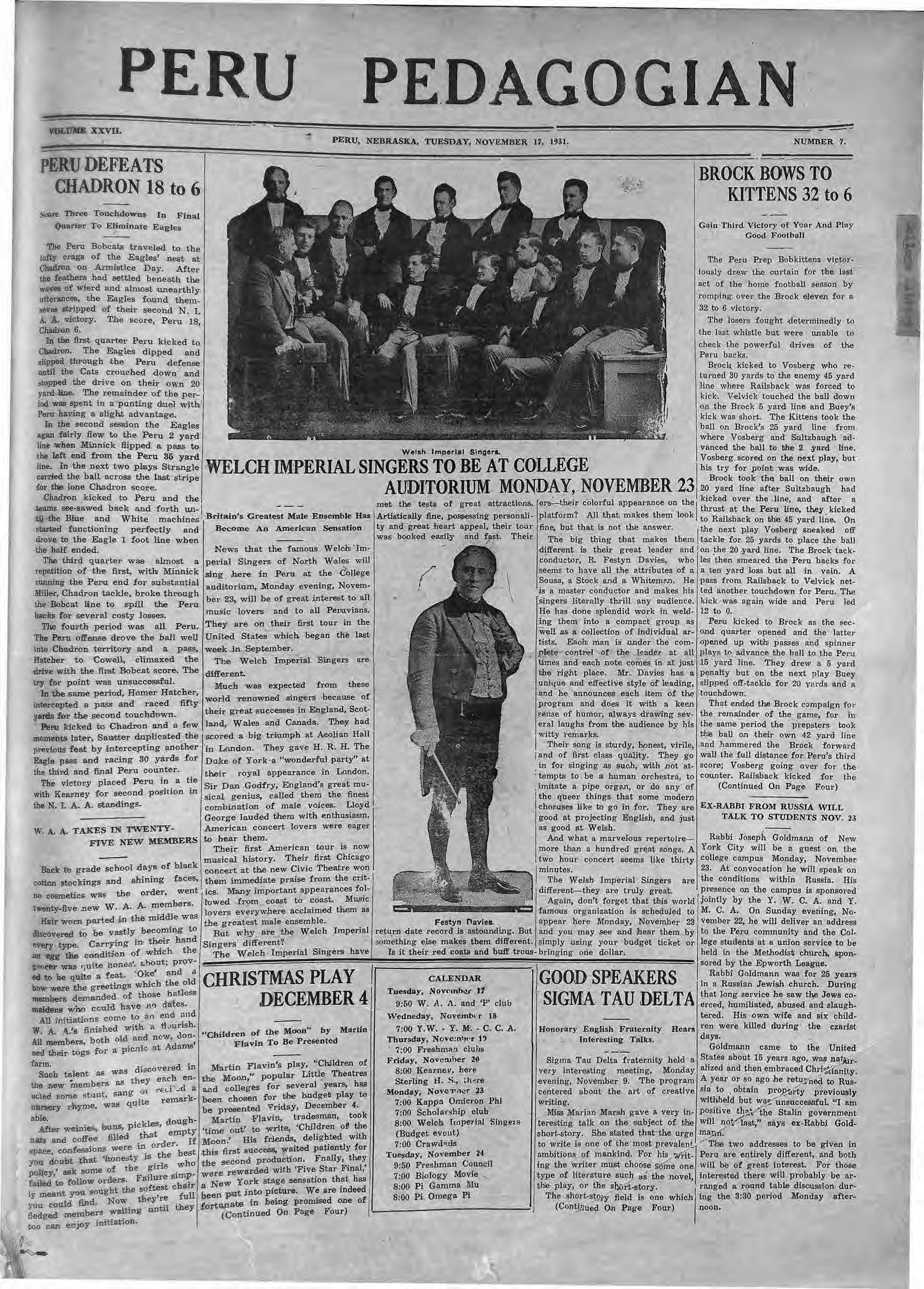 Upper classmen-sophomores, iun- , FRESHMEN ORGANIZE r_,, · 1 TL • .l!J. .you want to see a cheery. homeiors, seniors-w.e're glad to see yo.u I '"e "class of '35 held a short meet- l k ' b k A · · 1 e room just step into the kinderac - nd freshmen too, we're glad Ing in the college auditorium;, Thurs- when y.ou are passing a nd it to see you her.e for the first time.- I day, September 25 1931., and l ted will surely repay you for the time g- J.ad to know that you have chosen th f II • • e ec spent. t h.is . sc.hool as y-0ur college. We re I e . O' • .owmg 'florward to a big year in all ! P1.("s1dent John Ma3ors The student teachers, as well as phases of our sc.hooJ life. I Vice-president, Hank Filley I been painting curtains With the wo.nderful increase in en- : Secretary, Ca lvin Reed :01 the wmdows. Anyohe. who thinks rollment we should be able to make I Treasurer EI it_ e_asy to paint big bl'Own cat tails t his year stand out in the history of Fo . , s1e Lu_d.l ey the amoant of shadi ng and Old Peru. Let's make it another I llowmg the electi on, sophomores I lights sh?u:ld ask some of th.e .year of Champio ns.hipi;, world 's rec- ,w.ho had bee.n active in the various I .ould. be artists" w.hat they think