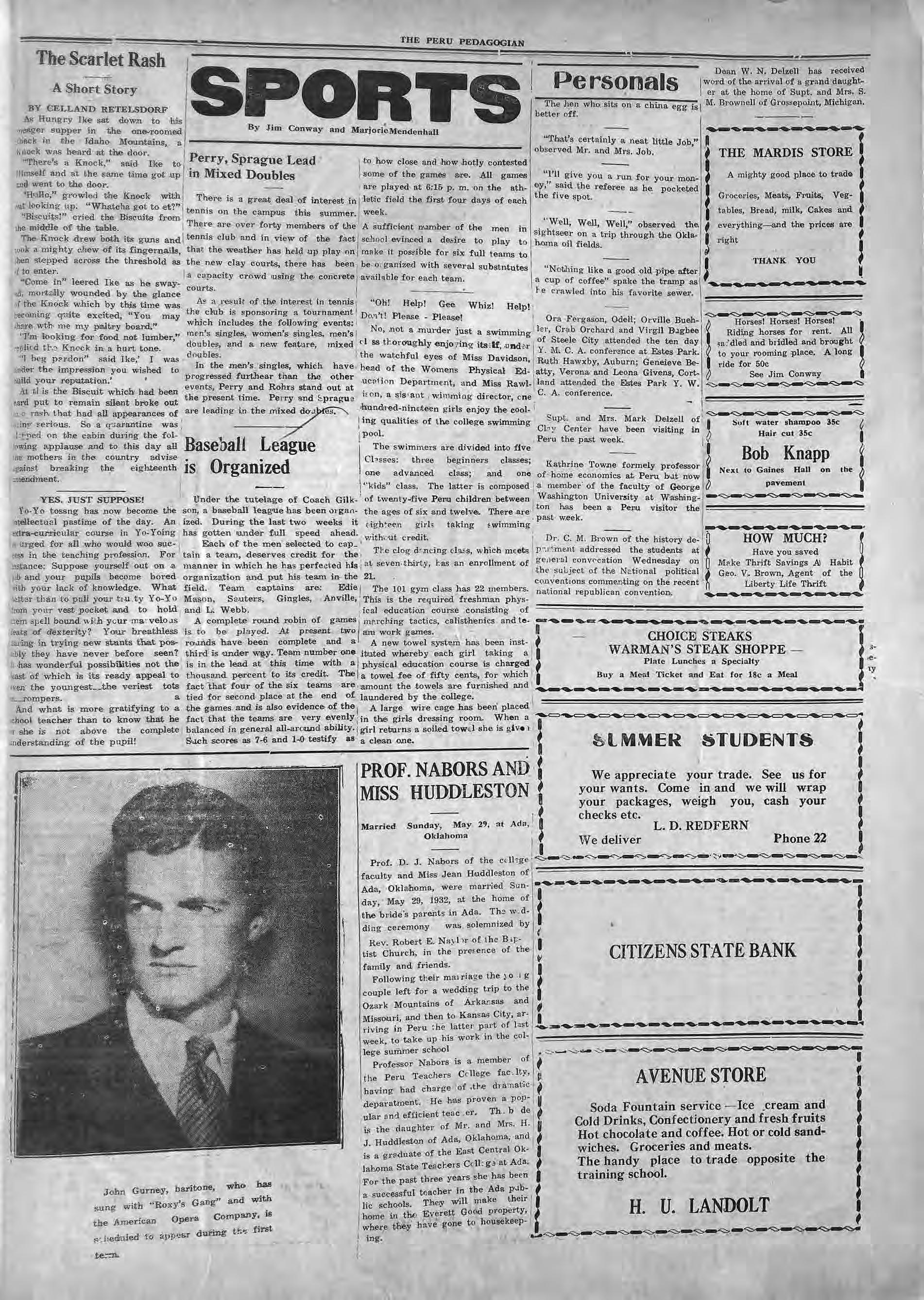 r eceived his M.. A. degree fr om the of Carthag e, Illinois has been elected Universjty of Minneapol is Pe11u and to that p osition Miss Konig was the Minneapolis seem t.o be exchanging he ad of t he language de partmen t at men fur Professor Frank H. H eck, Cart h age Co ll ege who wa.s last y ear in Mr Kahn's pos- In t he mathematics depa rtm ent is ition, is .now a,t M inneapolis workin g fo un d Ad a H. West, assistant pr of esso r of Mathematics. Miss West on his Ph D. degree. f was or merLy associa.te pr ofessor of Barner Bak er, for mer head, of mathem atics, Woma ns Oo lle ge of AJt he departni.,nt of education. is with abama, a.t Mo.ntg om ery, and is a g radPeru -again. Lasti y ear, o.n le ave odl ua te stu dent of th e U niv ersity of power to wheedle cheers fr om an audience of enthusiastic cih eerers. Th en from t hose w ho tried ou t the foHo wing pe r so.ns were c hos en : Walla ce Su gd en, le ader Bobby Sonderegger; ' Evely n Brecht; an d Fra nkie Brown We ought to. have a ve ry snappy pep cJ.ub u.nder the dir ec ti on of t hese capa ble le a ders. absence, he work on h is fll in ois. Ph. D. d egree which. was grante d him C. A. R uck,