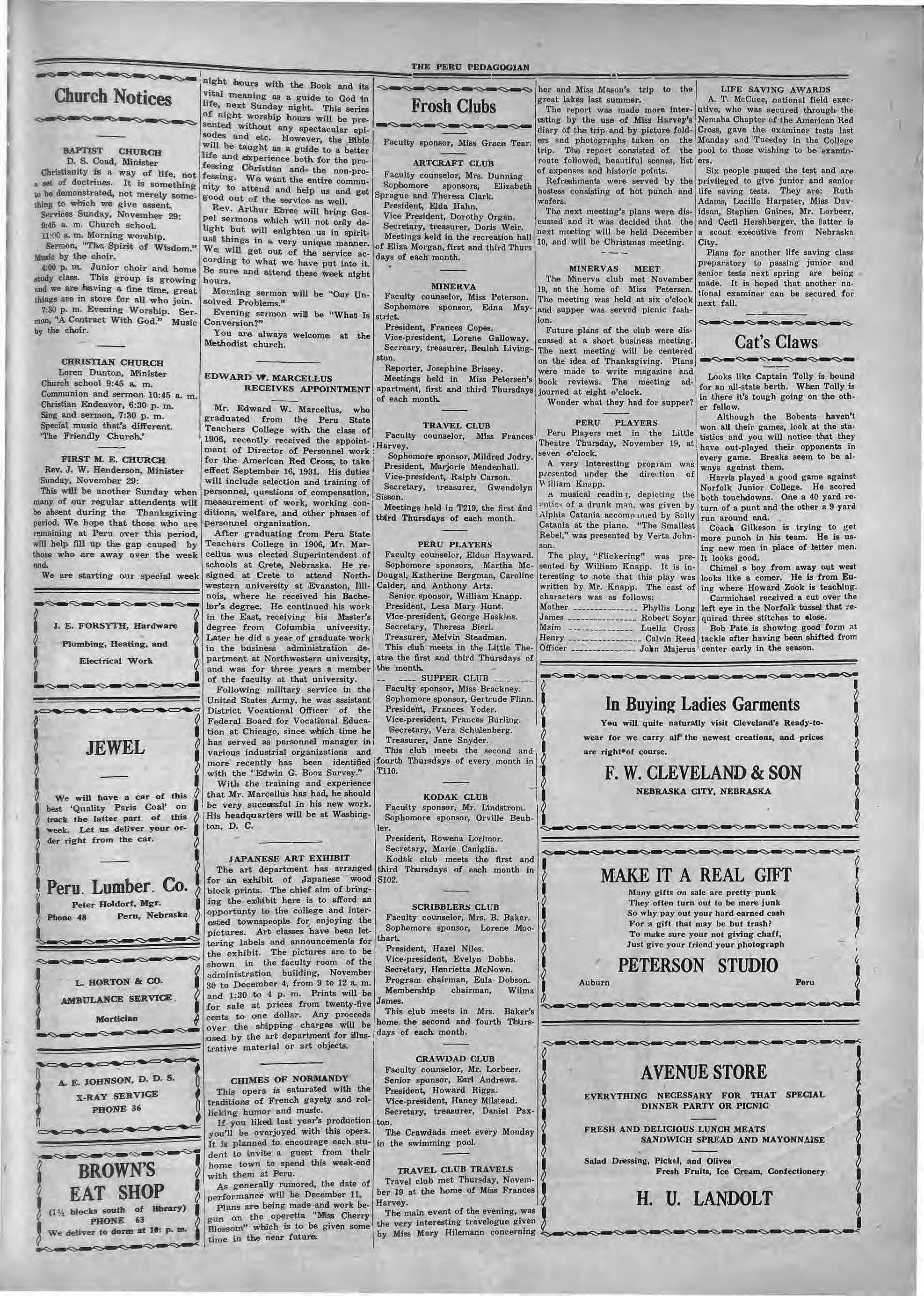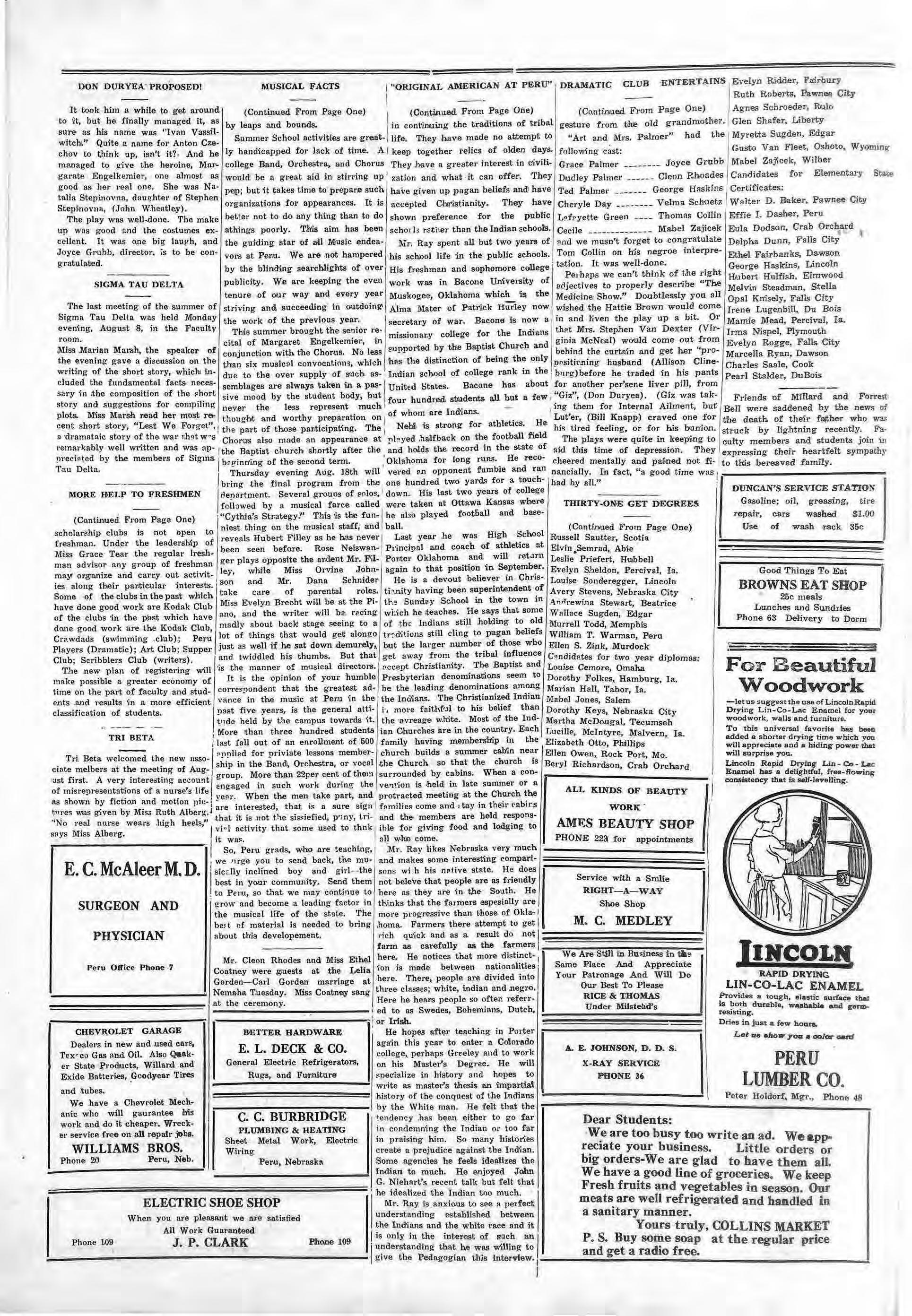 ·! SS .r ac e e.ar reg u ar res • 11 · t • " d f f h g er plays opposite the ar dient Mr. Fil- Porter Oklahom.a and. WI re Jrn Leslie Priefert HuL.be''.l man a visor any gr.oup o res man b ' 1 m ayt or,gianfae and carr:y out activit- le y, while Miss Orvine again to that '.m / Ev elyn S.heldon, Percival, Ia. ies along their particular •interests. !so.n and Mr. Dana Schmder is a .devout behev:r Ln Chris Louise So nde re gger,, Lincoln Some <>f the clubs in the past w.hich ta ke care of ti '.' nity havmg be en Avery Stevens, Nebraska City have d.one good work are Kod ak Club Miss E ve ly.n w1.U b.e at the .Pi- Sunda y m the town m An ,:rrewi.na Stew art, Beatrice of the clubs 'in the p(ast which h av e a.no, and the wnter w1H ra.c·mg wt:1ch he ;t;e ach.es He that some Wa'Il a·ce Su.gden, Ed gar d o.ne goo d work are the Kod-a k Club, madly about st ag e s eem g to a of .th<· Indians still holdmg to old Murrell Todd, Memphis Cr i>.wdads (s w imming cbub) .; Peru I of that would getl alongo tr '.' d'iti o.ns still cling to pagan beliefs Willi am T. Warman, Peru Players (Dr am atic); Art Club ; Supper JUSt as well if he s a.t down demur.ely,, biut the larger n.umber of w ho Ellen s. Z'ink, .M'urdock Club ; Scribblers Club (writers) Iand tw iddled his thumbs. But that ge t away from the tribal m:luence for two ye1ar diplomas : T.he new ,plan of registedng will •i s .the manner of musical directors. nc cept Chr.istia n:i.t y. The Baptist a.nd Louise Cemore, Oma ha make possible a greater economy of It is thte opini.o.n of your humble Presbyterian seem to D orothy Folkes,, Hamburg, Ia. time on the part of faculty and stud- that the greatest ad- be t.he leadin g .de.n ommat1ons among Marian Hall, Tabor Ia. e.nts .and results 'in .a m ore efficient va nce in the mu.sic at Peru 'in I I.nd'ians. The Indian Mabel J.one s, Salen: ' cl assifi ca tion of students !Jast fav·e years, .IS the general att1- I"o more fart.hf·'J[ to his belief than Dorothy Keys,, Nebr a.ska Gity t•1de held b.y the campus towards ·it. the 1a.vl'e:age w.h·ite. Most -0f the Ind - .Mia rtha McDo.ugal, Te cumseh TRI BETA 1 More ;than three hundred students ian Chiurches are in the Each Luciil e., Mcintyre, M:alve<r.n, Ia. i l as t fall out of an enrollment of 500 family having mem.l>ersh'1p m the Elizabeth Otto Phiill'ip ·