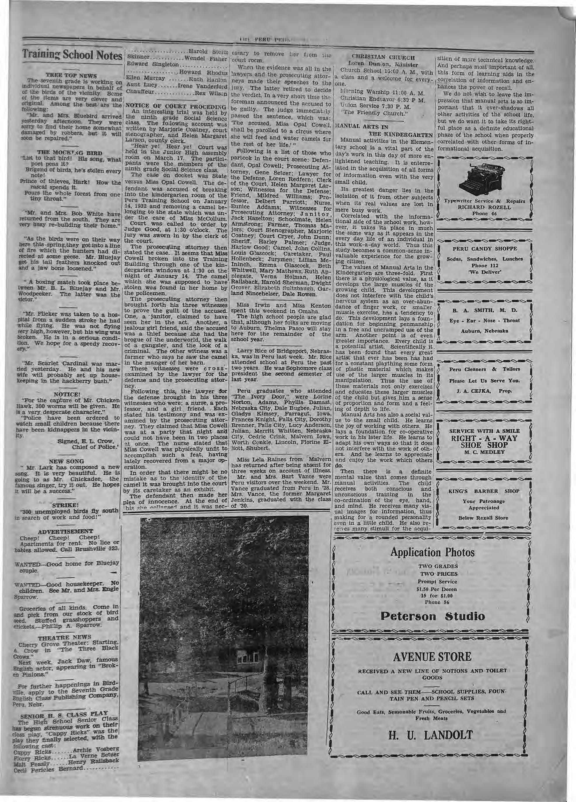 WELCOME to Peru We hope we can ma ke your /'J · L. _H_ OR_.:oN & co. r Iii MiHer for Litterell, Gaines for Goit, bert Filley, and Henry Schneider, I/ Petersen for Cowell F'she :f'.o L tt saxaph.ones, Charles Trenhillllli, tr.om- '!ltay here, both pleasant and profita ble See us for y our I AMBULANCE SER VI CE man. ' i r r u - bone ; and Lloyd Perry, cornet:' I O needs.