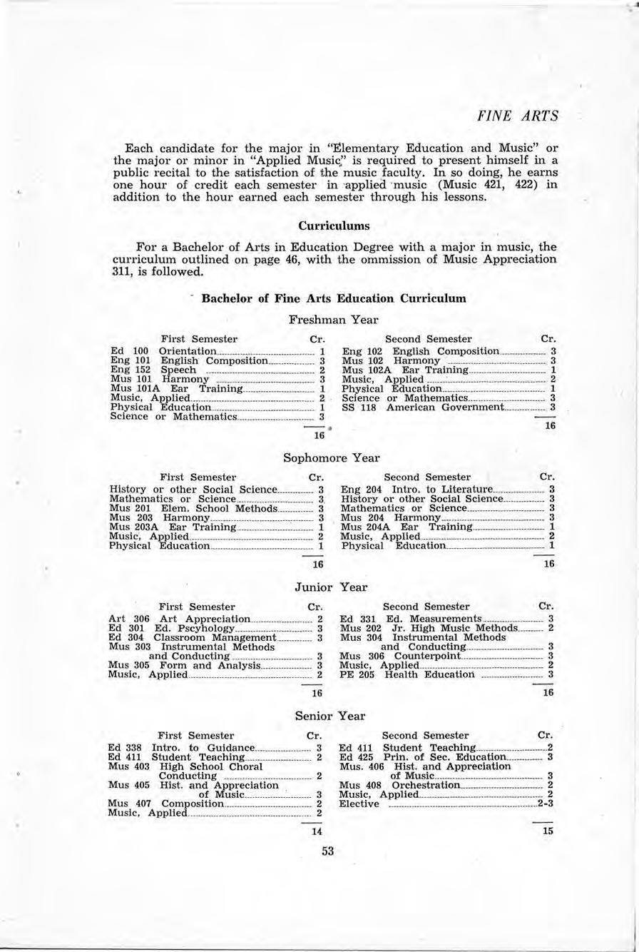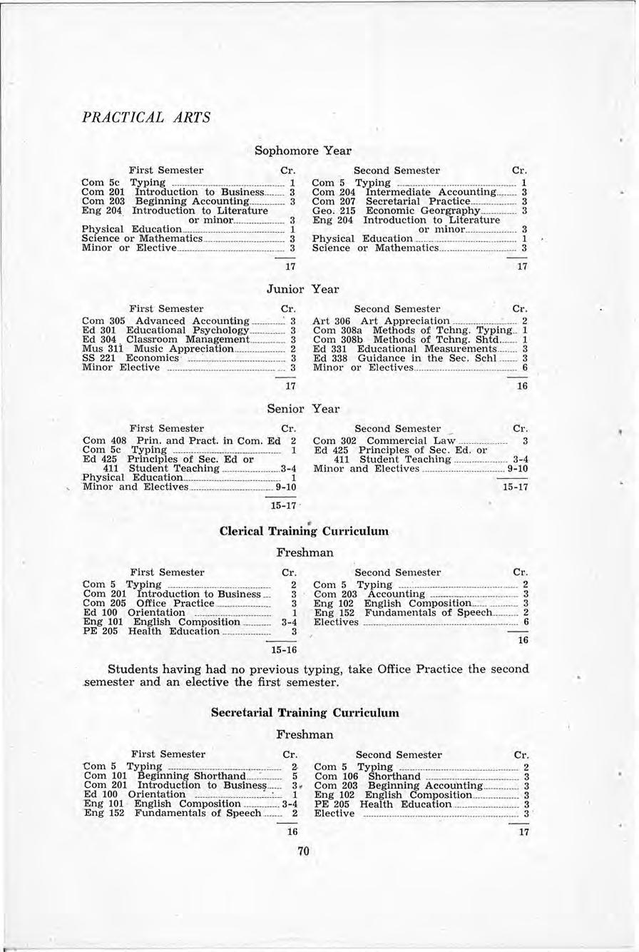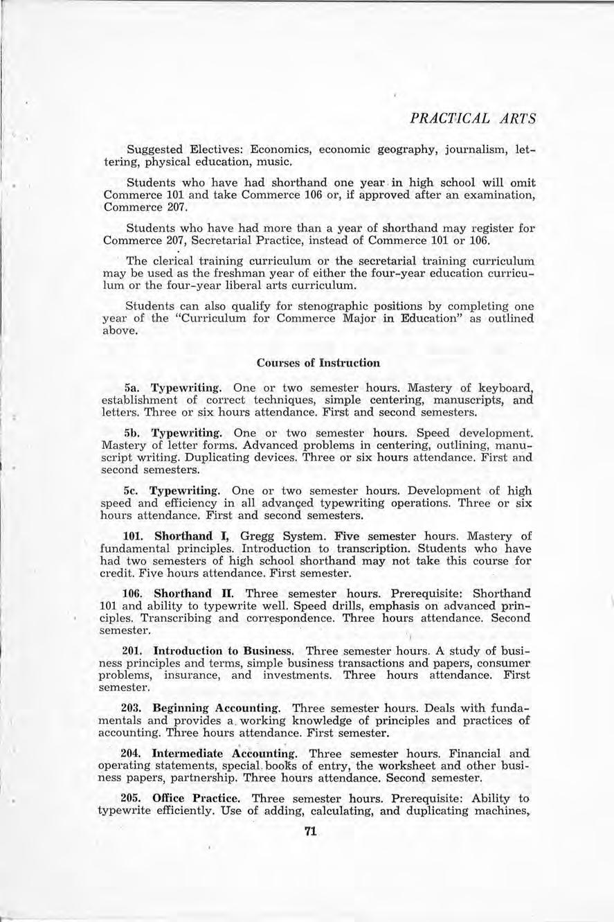 INDEX Academic regulations _______ 28 Accreditment ···············----·········-···· 11 Adminstration, school ········-- 47 Administrative officers ______ 6 Admission to college 28 Admiss ion to curriculumsteacher-preparation __________ 39 Alumni association 17 Art 50 Attendance ·································---31 Aw a rds ________ 20 Biology ····························------Buildings ····················-------Bus iness officers ········----83 12 6 Calendar ___ 4 Campus ______ ---~---- 12 Certificates --------~---- 36 Change in program ______ 30 Chemistry 86 Classification of students 29 Clerical training ---------·· 70 Commerce ______ ______ 69 Committees, faculty ________ 10 Correspondence courses ______ 94 Credit, college ················----········ 29 Credit for educational expedences in armed services _______ 29 Curriculum, selection of ______ 33 Degrees and diplomas ·------····36 Degrees granted .·......................................... 97 Diplomas ········------------36 Diplomas granted ····-------97 Dormitories ___________ 23 Education, Division of ______ 41 Elementary education _______ 41 English ························---61 Entertainment and social life ···-··-·····~ 14 Entrance requirements : 28 Expe11ses ·····----- 22 Extension services ________ 94 Faculty ···------ 6 Fees ············································-···················· 24 Fees for non-resident students 26 Fine Arts, Division of ···-··············-·'········· 50 French 65 General degree requirements 37 General information ··········-----11 Geography ·······················----············ 91 German 66 Grading system 31 Graduate courses ··················-······· 37 Guidance · 47 Health and· Physical Education, Divi sion of ····--------····58 Health and physical education for men - ·· 58 Health and physical education for women ___________ 59 Health services -----······ · 18 History -·-----·· • ···· 89 History of college ________ 11 Home economics -------------·······~·----······· - 72 Home making cun-iculums :.............. 73 Honor societies 16 Industrial arts 75 99 Industrial arts specialized curriculum 77 Instruction, officers of _______ 7 Junion termini,il curriculums 36 Language Arts, Division of 61 Languages, modern 65 Library science 65 Living accommodations 23 Loan funds 19 Location ........ ................ 11 Majors ·······------------33 Mathematics '. 82 Medical care - ··· 18 Memorials 19 Minors 33 Music 52 Non-resident fee _________ 26 Numbering of courses 30 Organizations Athletics 15 Educational and social 14 Music ·····--·--------15 Religious ············-------15 Personnel services ________ 18 Physical education 58 Physkal s cience ·~-------- 85 Physics ·········-···· :···-····· 87 Placement burea u, teacher 18 Practical Arts, Division of 69 Pre-professional curriculu ms 35 Program of instruction 33 Psychology 48 Recreation 14 Refunds ____________ 26 Resident attendance 31 Rural education :.......... 41 Russian. 67 Scholarships ················-----2() Scholarship standards ···-··· 31 Scholastic honors 32 Science ·········-················ 83 Science and Mathematics, Divi s ion of ········------ 81 Secondary education ··············---4& Secretrial officers 6 ~~~f!f1s~~n~~ai~i~!..:::::::::::=::::::::::::::::::::::: ~? Social Studies, D ivision of 88 Spanish ······································----67 Speech education ·······-······63 Sponsors of student groups ·······-··········10 S tate Board of Education ______ & Student load 30 Study cente r ' 94 T a ble of contents 3 Terminal curriculums ····-···36 Transportation facilities ·····················-· ·· 11 Tuition ························-------24 Vocational agriculture Vocational curriculums Vocational hom emaking 81 3& 73 Withdrawal from school 3«.