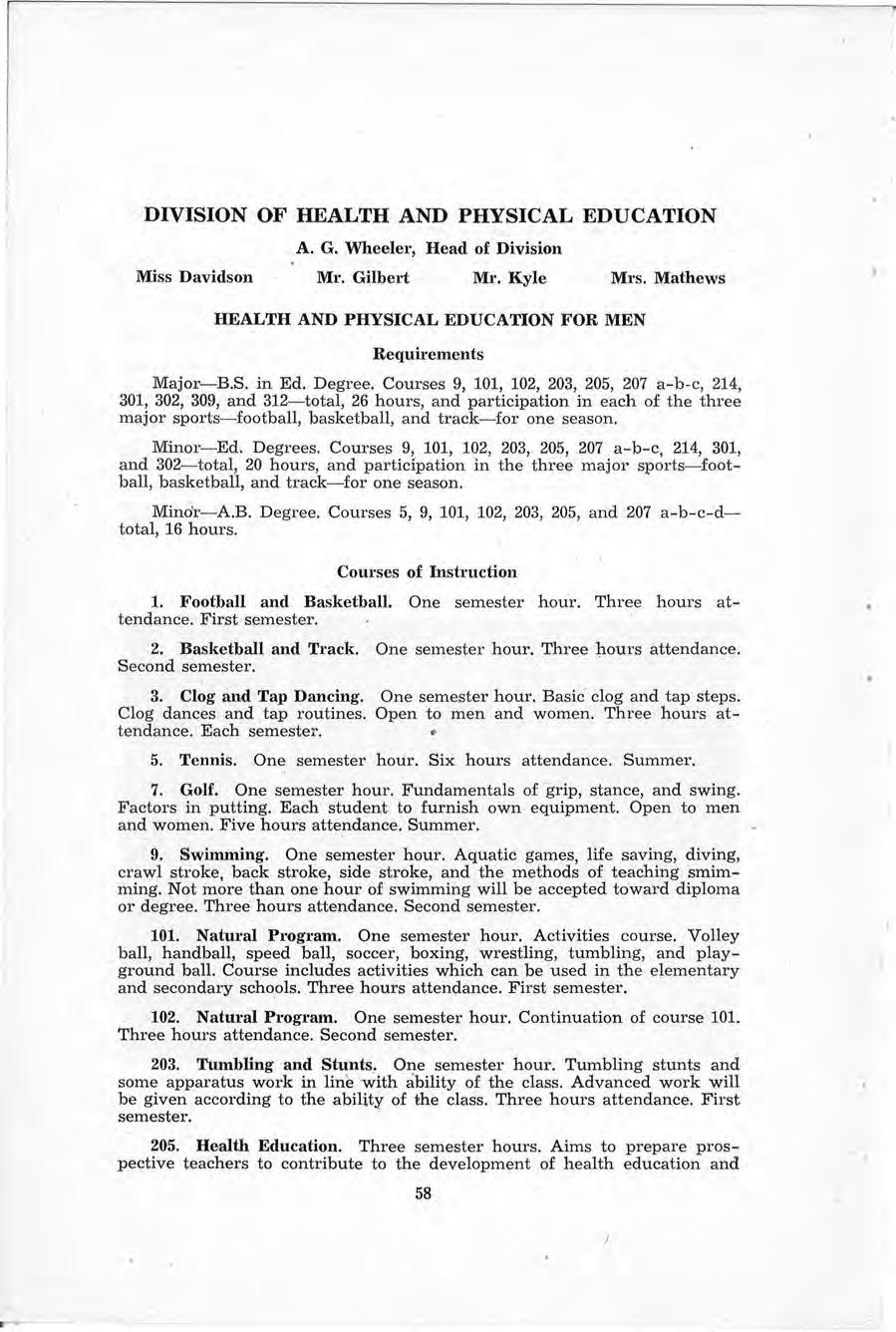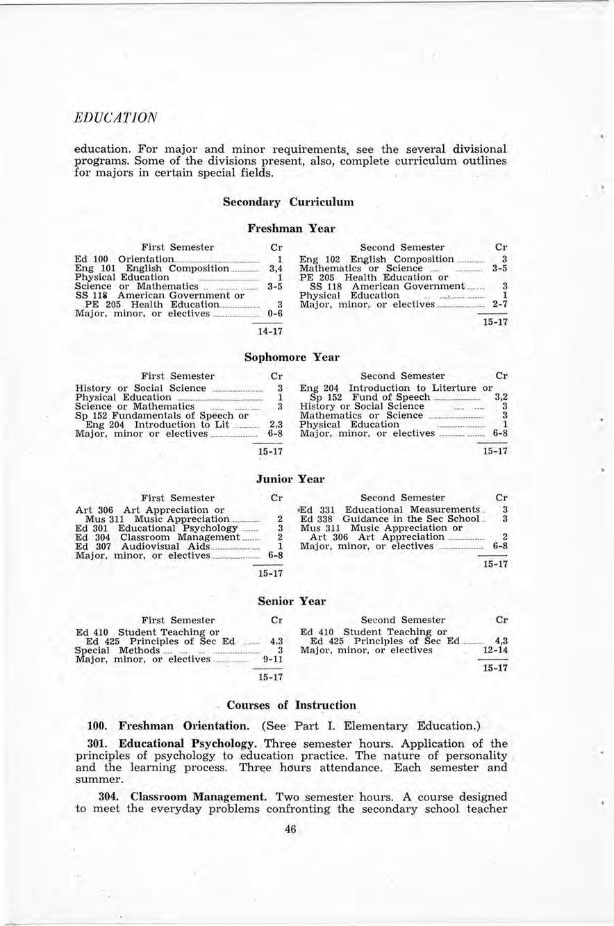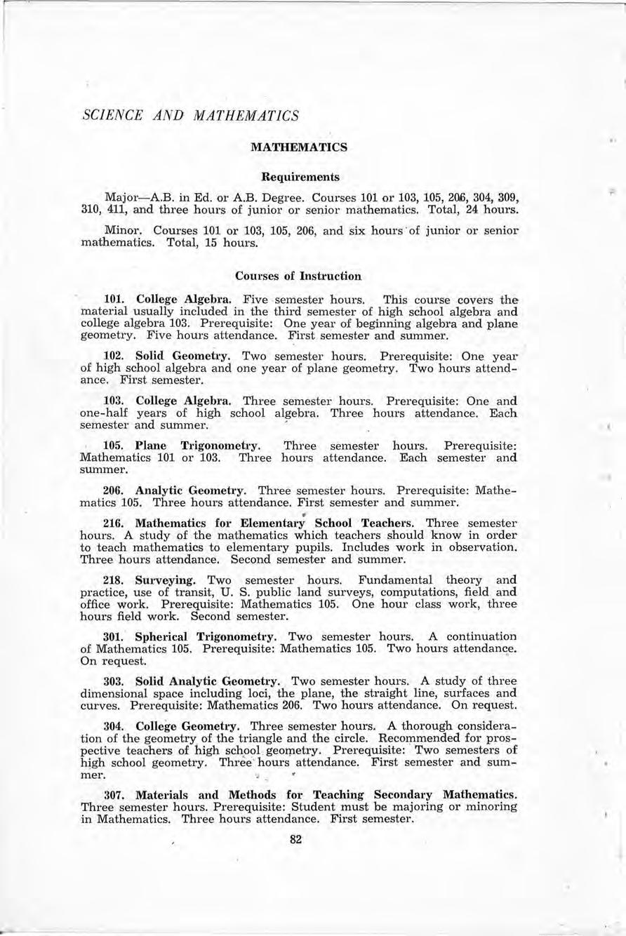 INDEX Academic regulations _______ 28 Accreditment ···············----·········-···· 11 Adminstration, school ········-- 47 Administrative officers ______ 6 Admission to college 28 Admiss ion to curriculumsteacher-preparation __________ 39 Alumni association 17 Art 50 Attendance ·································---31 Aw a rds ________ 20 Biology ····························------Buildings ····················-------Bus iness officers ········----83 12 6 Calendar ___ 4 Campus ______ ---~---- 12 Certificates --------~---- 36 Change in program ______ 30 Chemistry 86 Classification of students 29 Clerical training ---------·· 70 Commerce ______ ______ 69 Committees, faculty ________ 10 Correspondence courses ______ 94 Credit, college ················----········ 29 Credit for educational expedences in armed services _______ 29 Curriculum, selection of ______ 33 Degrees and diplomas ·------····36 Degrees granted .·......................................... 97 Diplomas ········------------36 Diplomas granted ····-------97 Dormitories ___________ 23 Education, Division of ______ 41 Elementary education _______ 41 English ························---61 Entertainment and social life ···-··-·····~ 14 Entrance requirements : 28 Expe11ses ·····----- 22 Extension services ________ 94 Faculty ···------ 6 Fees ············································-···················· 24 Fees for non-resident students 26 Fine Arts, Division of ···-··············-·'········· 50 French 65 General degree requirements 37 General information ··········-----11 Geography ·······················----············ 91 German 66 Grading system 31 Graduate courses ··················-······· 37 Guidance · 47 Health and· Physical Education, Divi sion of ····--------····58 Health and physical education for men - ·· 58 Health and physical education for women ___________ 59 Health services -----······ · 18 History -·-----·· • ···· 89 History of college ________ 11 Home economics -------------·······~·----······· - 72 Home making cun-iculums :.............. 73 Honor societies 16 Industrial arts 75 99 Industrial arts specialized curriculum 77 Instruction, officers of _______ 7 Junion termini,il curriculums 36 Language Arts, Division of 61 Languages, modern 65 Library science 65 Living accommodations 23 Loan funds 19 Location ........ ................ 11 Majors ·······------------33 Mathematics '. 82 Medical care - ··· 18 Memorials 19 Minors 33 Music 52 Non-resident fee _________ 26 Numbering of courses 30 Organizations Athletics 15 Educational and social 14 Music ·····--·--------15 Religious ············-------15 Personnel services ________ 18 Physical education 58 Physkal s cience ·~-------- 85 Physics ·········-···· :···-····· 87 Placement burea u, teacher 18 Practical Arts, Division of 69 Pre-professional curriculu ms 35 Program of instruction 33 Psychology 48 Recreation 14 Refunds ____________ 26 Resident attendance 31 Rural education :.......... 41 Russian. 67 Scholarships ················-----2() Scholarship standards ···-··· 31 Scholastic honors 32 Science ·········-················ 83 Science and Mathematics, Divi s ion of ········------ 81 Secondary education ··············---4& Secretrial officers 6 ~~~f!f1s~~n~~ai~i~!..:::::::::::=::::::::::::::::::::::: ~? Social Studies, D ivision of 88 Spanish ······································----67 Speech education ·······-······63 Sponsors of student groups ·······-··········10 S tate Board of Education ______ & Student load 30 Study cente r ' 94 T a ble of contents 3 Terminal curriculums ····-···36 Transportation facilities ·····················-· ·· 11 Tuition ························-------24 Vocational agriculture Vocational curriculums Vocational hom emaking 81 3& 73 Withdrawal from school 3«.