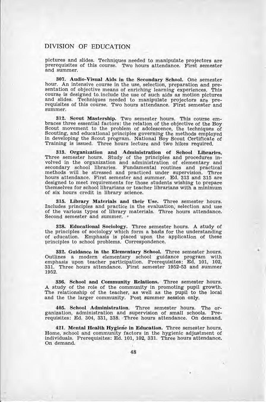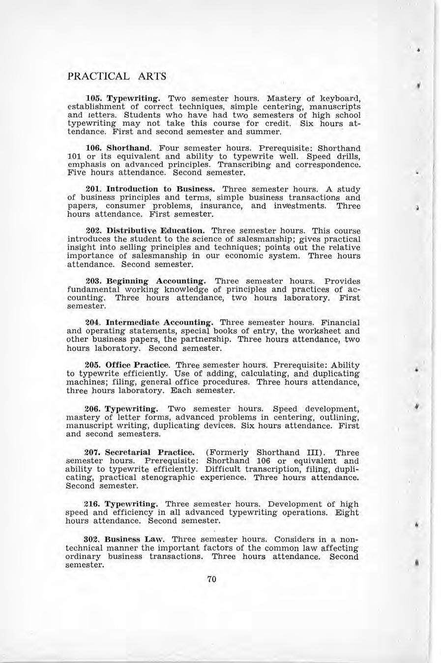 t INDEX Academic regulations - 28 .Accreditation ···-----···· ··· 11 Administration ··············-- 6 Administration officers _____ 6 Admission to college .......................... 28 Admission to teacher-preparation curriculums - 39 Alumni association -··· ··· 17 Art ------· ··- ·-·······50 Attendance ----·· ··················· 30 Awards ······-········· · 19 Biological Sciences -················ ·-· 82 Buildings __ 12 Business education ······-·· 69 Business officers ········------ 6 Calendar _______ 4 Campus ············-- 12 Certificates -· ---······36 Change in program 30 Chemistry -················ ···· 84 Classification of students .................... 29 Clerical training 69 Correspondence cour ses 94 Applications ·~-----···...... 9G Credit for educational experiences in armed services 29 Curriculums ·····-----··················. 33 Curriculum, selection of •....... .... ......... 33 Degrees and diploma s 3G Degrees, general requirements - ···· 37 Education ___ ·- 3 8 Liberal Arts _______ 39 Degrees granted ···········----97 D ining services -------·········· 24 Diplomas ···-·········-·················· ··· 3G Diplomas granted ·········-··98 Dormitories ................................................ 23 . Education, Division of 40 Elerh e nt a ry education 40 English , 60 Entertainment and social life 14 Entrance requirements 28 Expenses ·········----················· ····· 22 Extension services .......... .................. ... 94 Fees •• ·-··· 24 Course _ ----·--···-·······-···------··-- 25 Non-re s ident - ·········-· 2G Priva te in stru c tion 26 Fine .Arts, Divi sion of 50 French ·-·-··---············· ·· 65 Genera l information .................... .......... 11 Geography ·············-································· 91 German ·------ 66 Grading system 31 Hea~tlJ .and Physical Education, D1v1s10n of 56 Health and physical education for men ·----· ·· 56 He a lth and physical education for women 58 m~t~~; of college .- : ············: ff Home economics _________ ............J. ••...• •••• "71 Homemaking curriculums · 71 Industrial arts ····-··· ······················ 74 Industrial arts specialized curriculum ______ 74 99 Instructional staff 6 Junior termina l curriculums 35 Language Arts, Divi sion of 60 Languages, modern 65 t~eral Ai·ts -------····-······· 39 1 rary scien c e ······•·········-----48 Library staff ----·······················: 6 Living accomod a tions ··-·· ···· 23 tii::u:i nd s ::::~:::::::::: ::::: rn Majors ··-······· ·- · 33 Mathematics ____ 80 Memorials ········---------18 Minors ----······ ······33 Music - ··-----·············· ··· 52 Memberships 11 Non-resident fee 26 Numbering of courses 29 Organizations Athletics ·········-·····•··•············· · 14 Educational and social 14 ~11!{u;~~'.;:~'.;:~::::::::::::::::::::::::::.:::::::::: ii Permanent Faculty Committees .... ... 10 Physical education _______ 56 Physical science ·····----- 84 Physi cs ~,--------- 86 Pl a cement bureau, teacher 18 Plac e ment, commercial :::::::::::::::: 18 Practical Arts, Divi sion of ·······-······ · 69 Pre-professional curriculums 35 P res ident 's office - · 6 Program of instruction ---··· 33 Purposes of college _______ 11 Recreation ···-··········--- 14 Refunds -,cc--- 26 Residence halls 23 Resident attendance , : 30 ··············:::::::::: i~ Scholarships 19 Scholarship standards ·-······ ···· 31 Scholasti c honors ······-·························· 32 Science ---=--c---····-································ 81 Science and M a thematics, Divis ion of ··- 79 Secondary education _______ 44 Secretarial trai ning ----···········69 Social Scienc e 90 Social Studies, Divi s ion of ·····'·····-··· 87 Spanish ········----·············· ·· 68 Speech education 63 Sponsors of stu dent groups ................ 10 State Board of Education .......... ........ 5 Student load 30 Study cente r ···-· · 94 Table of contents 3 Terminal curriculums 35 Transportation facilities .. 12 Tuition ····----24 Vocational agriculture _____ 79 35 Vocational curriculum s Vocational homemaking 71 Withdrawal from school ·- ·····-- 30