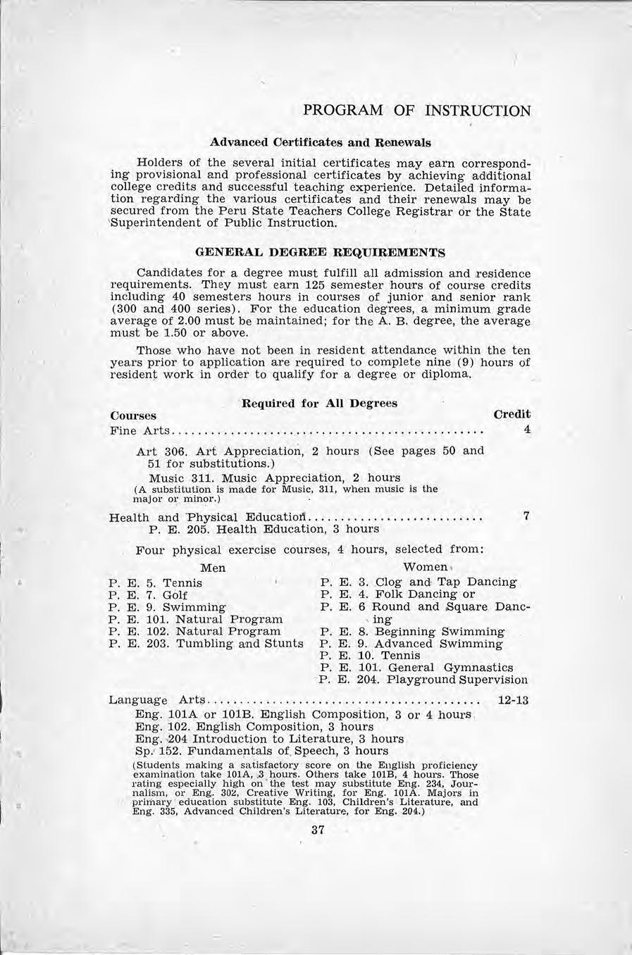" iJ _, ,.. ,. TABLE OF CONTENTS College Calendar 4 State Board of Education ·........ . . 5 Personnel 1951 -5 2 6 Instructional Staff 6 Sponsors of Student Groups .. ..... ... . .................... ... 10 Permanent Faculty Committees . . . . . . . . . . . . . . . . . . . . . . . . . . . . . . 10 General Information ' " 11 History 11 Purposes 11 Accreditation 11 Memberships . . . . . . . . . . . . . . . . . . . . . . . . . . . . . . . . . . . . . . . . . . . . 11 Lo catio n and Tr a nsportation Facilities . . . . . . . . . . . . . . . . . . . . 12 Campus and Buildings 12 Entertainment, Recreation, Social Life 14 Organizations .. . . . ... .. ........ .. . . ...... . ............ • . . 14 Peru Alumni Association , 17 Te ac her Placement Bureau 18 Memorials and Loan Funds . . . . . . . . . . . . . . . . . . . . . . . . . . . . . . 18 Awards and S cholarships 19 Expenses for One Year , 22 Living, Ac c ommodations . . . . . . . . . . . . . . . . . . . . . . . . . . . . . . . . . 23 Tuition and Fees . . . . . . . . . . . . . . . . . . . . . . . . . . . . . . . . . . . . . . . . 24 Refunds to Students Who Withdraw from School . . . . . . . . . . 26 Academic Regulations 28 Admission • • 28 Cr e dit for Educ a tion a l Experien ce s in the Armed Service . . 29 Cl assification of Stud e nts 29 Numbering of Courses . . . . . . . . . . . . . . . . . . . . . . . . . . . . . . . . . . . 2~ Student Load . . . . . . . . . . . . . . . . . . . . . . . . . . . . . . . . . . . . . . . . . . . . 30 Ch a n g e in Progr a m a nd Withdrawal Procedure 30 Att e ndance • 30 Resident Attendanc e .... .... ... . . .. ...... .. ... . .. .. . .... . 30 Gr a ding- System 31 Sch ol arship Standards 31 Scholasti c Honors 32 Program of In structio n . . . . . . . . . . . . . . . . . . . . . . . . . . . . . . . . . . . . . . 33 Curriculums 33 Sel ec tion of a Curriculum 33 De g ree M a jors a nd Minors . . . . . . . . . . . . . . . . . . . . . . . . . . . . . . . 33 Pr e -Profession a l Curric ulums • 35 Junior Terminal or Vocational C urri cu lums 35 General Degree Requirements . . . . . . . . . . . . . . . . . . . . . . . . . . . . 37 ' Degrees , Diplomas, Certifi ca tes 36 Admission to Teacher -Preparation Curriculums 39 Division of, Education .............................. . ·.. .. 40 Division of Fine Arts 50 Division of Health and Physical Education . . . . . . . . . . . . . . . . nfi Division of Lan guage Arts . . . . . . . . . . . . . . . . . . . . . . . . . . . . . . 60 Division of Pr actical Arts ....... . ......... . ....... . . .... ·69 Division of Scienc e a nd Mathematics 79 Division of Social •Studies 87 Extension Services , •. : 94 Study-Center and Correspondence Course 94 Application for Correspondence Course . . . . . . . . . . . . . . . . . . . . 96 Degrees ·and Diplomas Granted . . . . . . . . . . . . . . . . . . . . . . . . . . . . . . . 97 Index 99