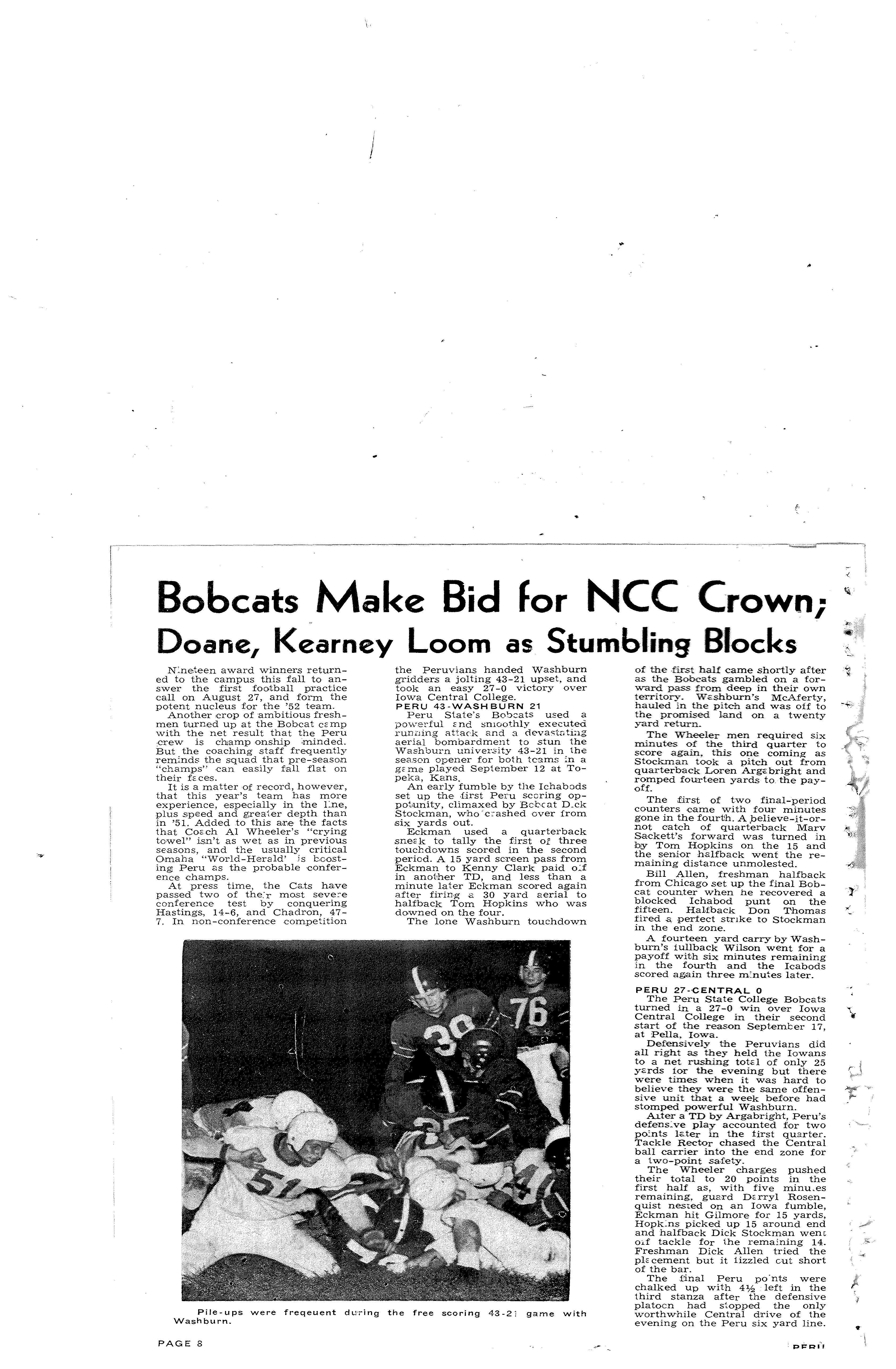A 21-yard screen pass from Ned Eckman to Ken Clark brought Peru its first TD and Donnie Thorn.as scooted 11 for the marker E1at put the B:Jbcsts ahead to stay Je1-r.:; Trullinger, sopho1nore end from. Ia., zipped 40 with a pass to n'lake it 20-7 at the Fre_lln""len were the big guns in the second-hali runway, with a 165-pound halfback fr01n Ch:c:;go, Bill Allen, dorninating.