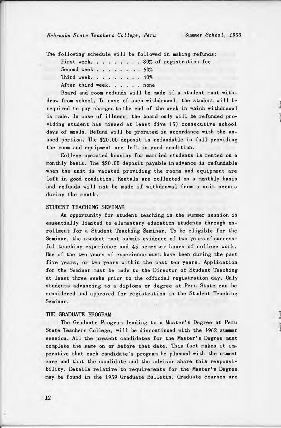 The Graduate Program leading to a Master's Degree at Peru State Teachers College, will- be discontinued with the 1962 summer session All the pre s ent candidates for the Master's Degree must complete the same on ot' befo~e that date. This fact makes it imperative that each candidate's program be planned with the utmost care and that the candidate and the advisor share this responsibility. Details relative to requirements for the Master' s Degree may be found in the 1959 Graduate Bulletin. Graduate courses are