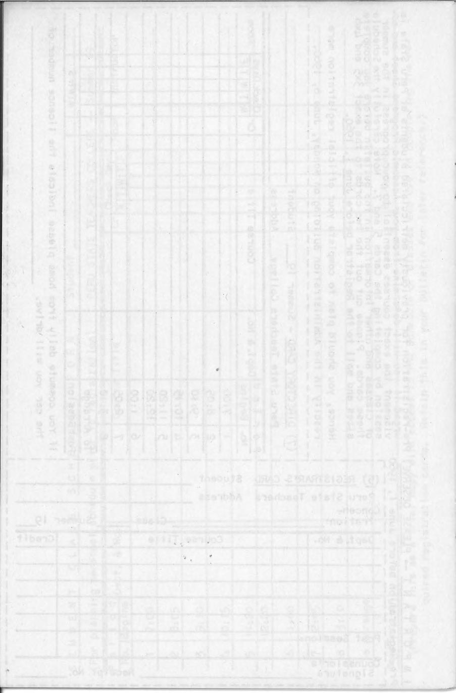 Pre-registration for previously matriculated students at Peru State is urgeij if you wit I determine from your Academic Progress Sheet and advisement the exact courses essential to your progress in the summer session by completing the Cards 5 and 7. Note carefully the Schedule of Classes and other information in the bulletin before iou complete these cards. Please cut out the two cards to the exact ,x5 and 4x6 sizes and mall to the Registrar before June!, .!.2§Q.