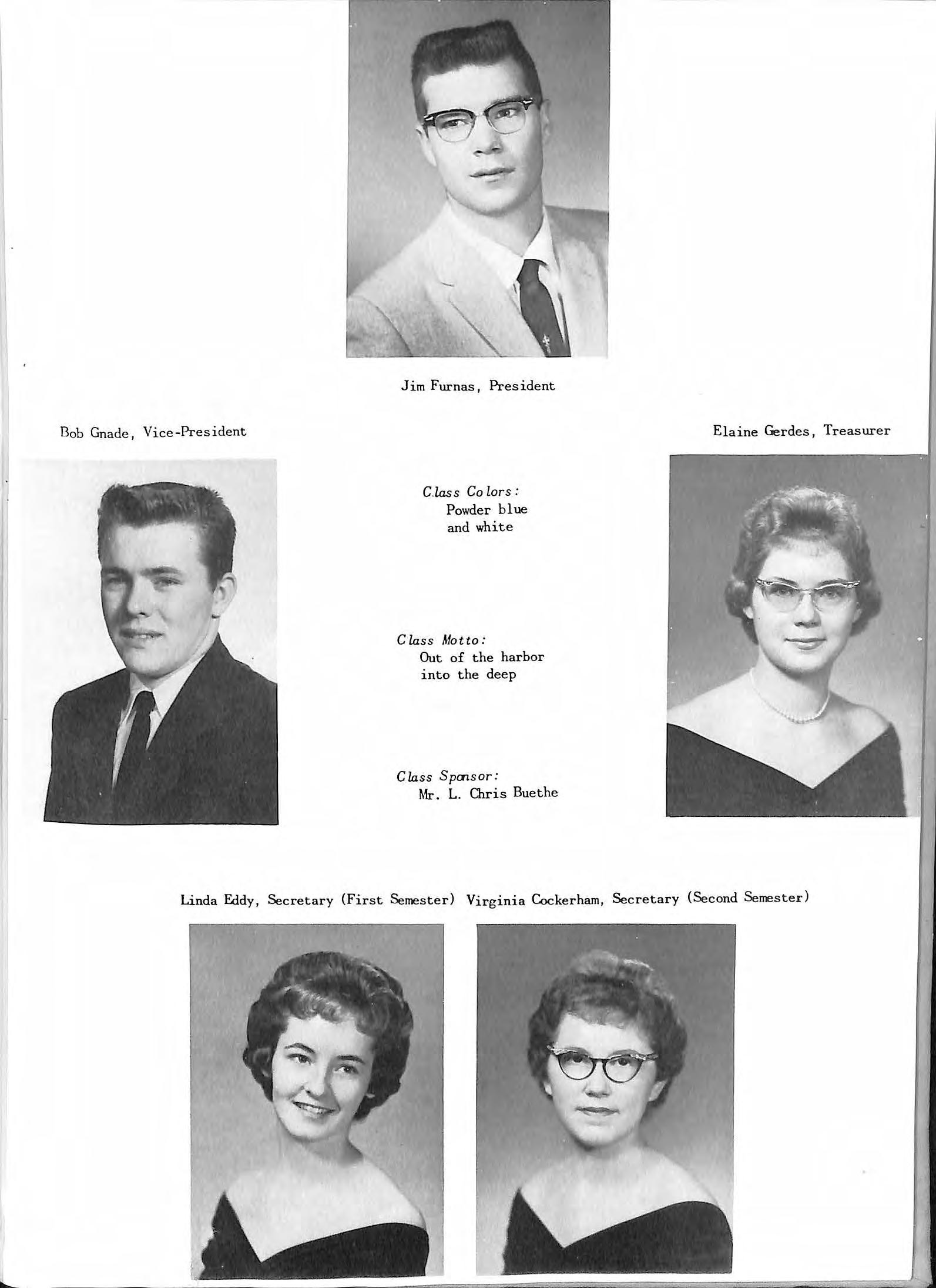Firs t Row : Danna Henry, Margie urnas, L>Ne n i s • he J Allgood vicepresident, hlary Lutt, treas urer. Second Row : Ronald Fis ~; 1 errdy F.ciward,Langham, ' d tr.-J)~ Wh • l Robert l\u stea , pres:t.< en , u u .rarKer, secre tary, James 1s er, M:Connaughey, John Kite , Robert Witte. Third Row: Bill Straw, David Newton, Clarence f.ciward Cox, Marshal Meritt, Mr. Sheely.