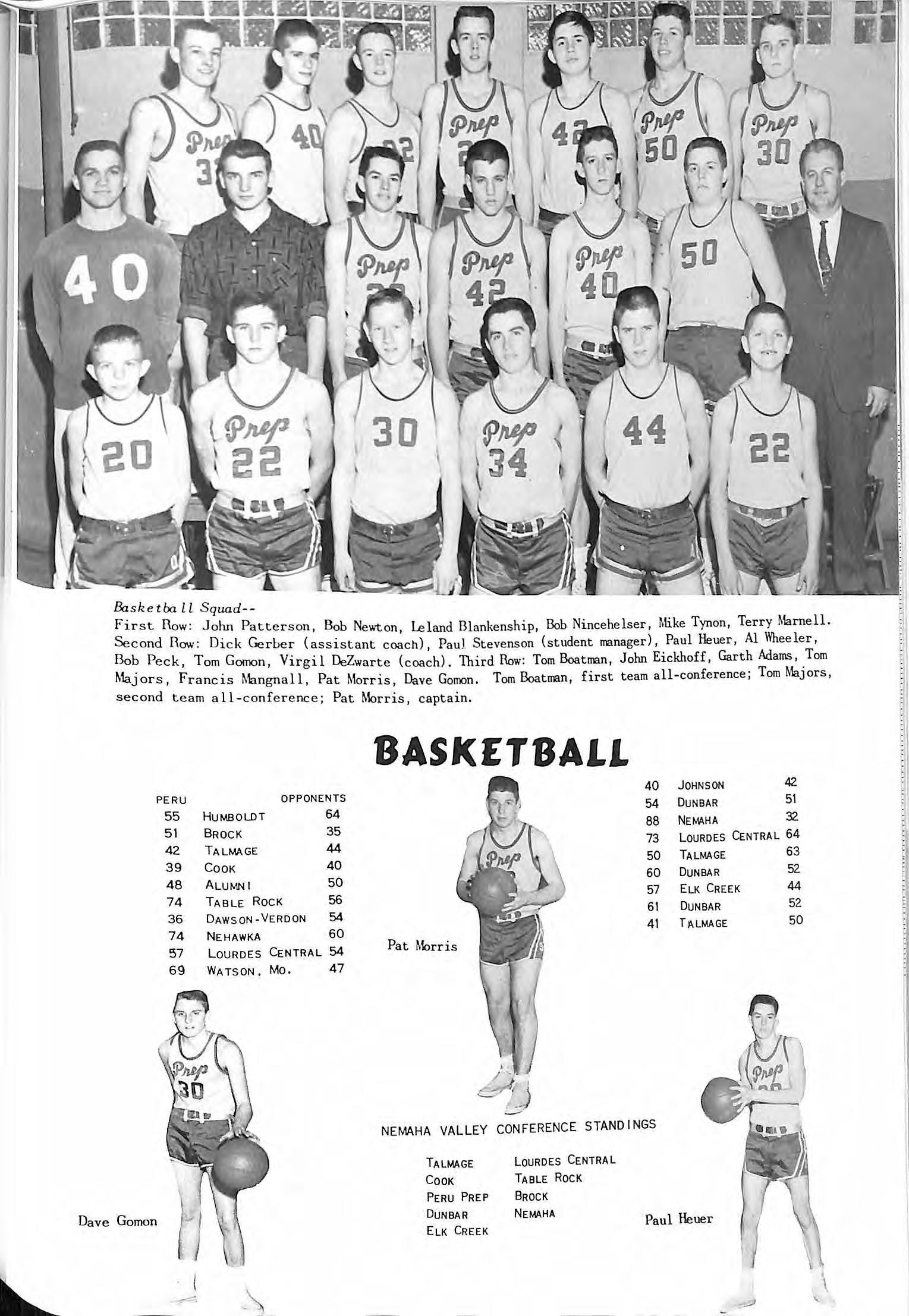 First now: John Patterson, Bob Newton, Le l and 13lankenship, Bob Nincehelser, Mike Tynon, Terry Marnell. Second now: Dick Gerber ( assistant coach), Paul Stevenson (student manager), Paul Heuer, Al Wheeler , Bob Peck, Tom Gomon, Virgil DeZwarte (coach). Third Row: Tom Boatman, John Eickhoff, Garth Adams, Tom Maj ors, Francis Mangnal l, Pat Morris, Dave Gomon. Tom Boatman, first team all-conference; Tom Majors, second team all-conference; Pat Morris, captain.