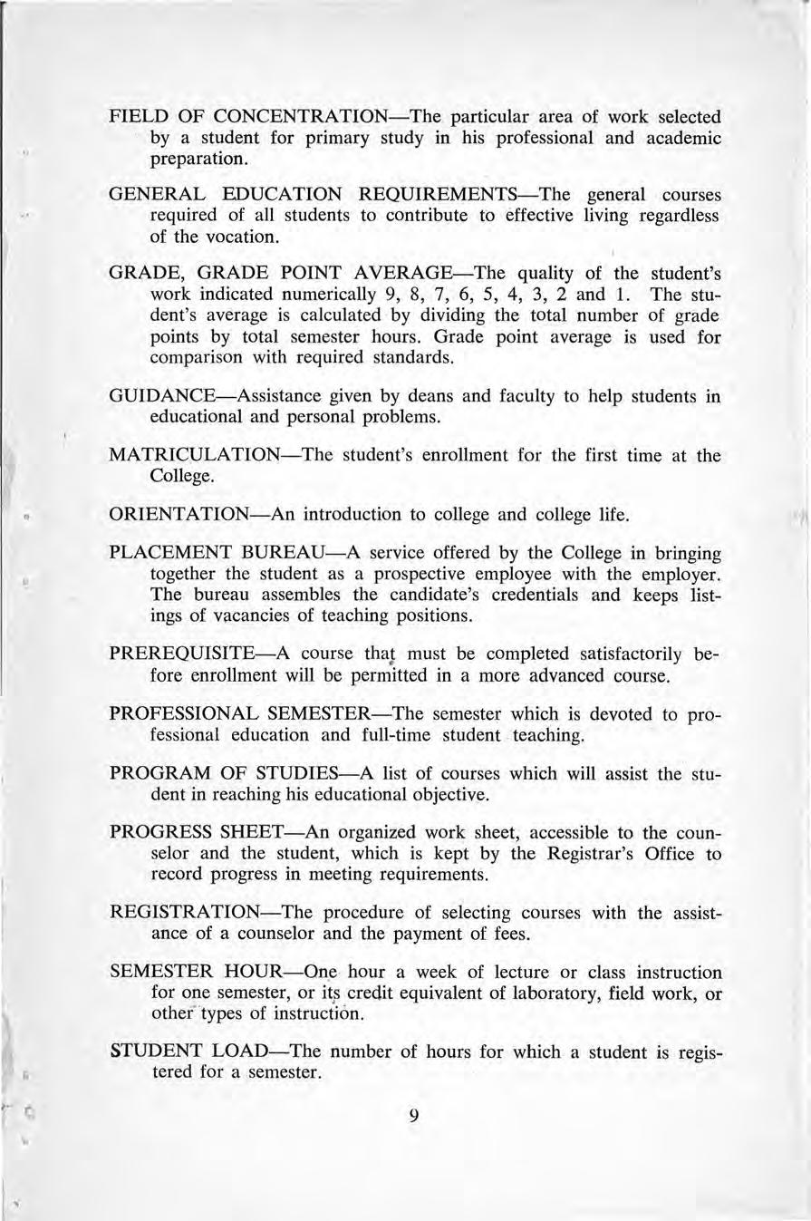 GRADE, GRADE POINT AVERAGE-The quality of the student's work indicated numerically 9, 8, 7, 6, 5, 4, 3, 2 and 1. The student's average is calculated by dividing the total number of grade points by total semester hours. Grade point average is used for comparison with required standards .
