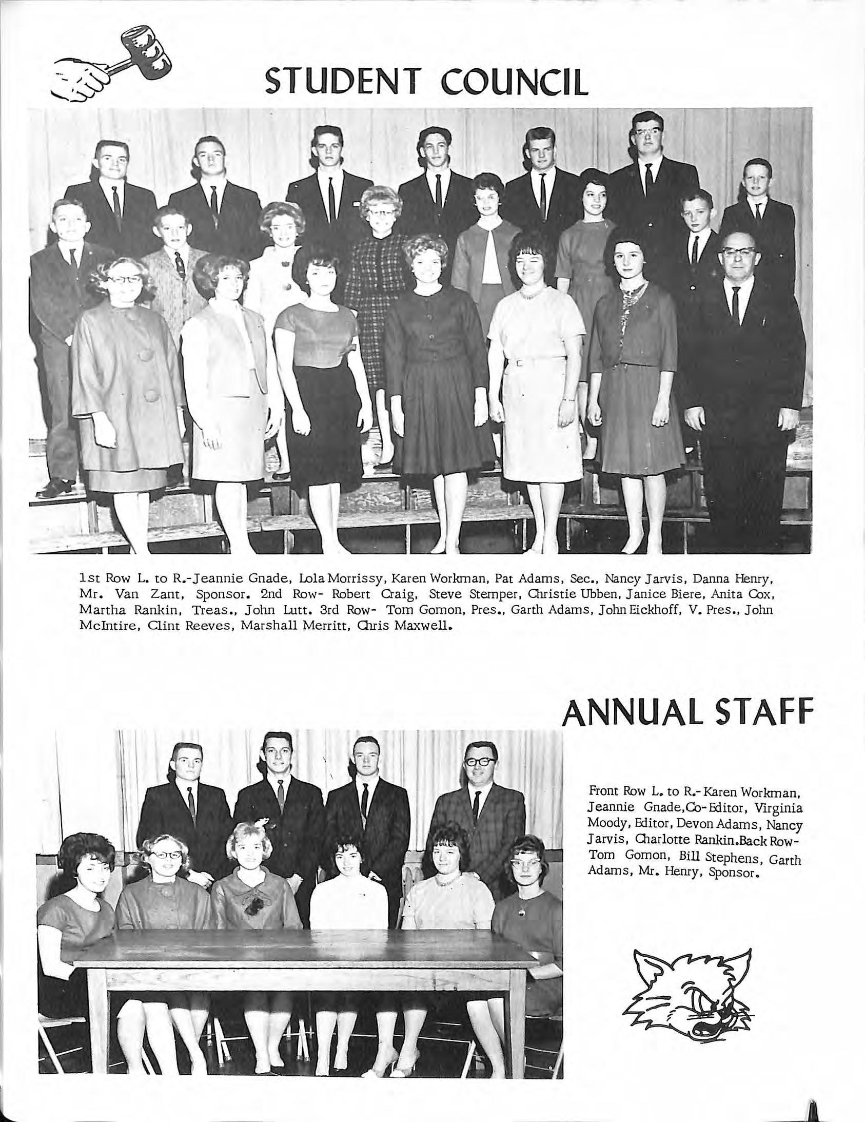 1st Row L. to R.-J eannie Gnade, LolaMorris sy , Karen Workman, Pat Adams, Sec ., Nancy J arvis, Danna Herny, M r Van Zant, Sponsor 2nd Row - Robert Oaig, Steve Stemper, Chri stie Ubben, J a nice Biere, Anita Cox, Martha Rankin, Treas ., John Lutt. 3rd Row- Tom Gomon , Pres., Garth Adams, John Eickhoff, V Pres., John McIntire, Clint Reeves , Marshall Merr itt, Oiris Maxwell.