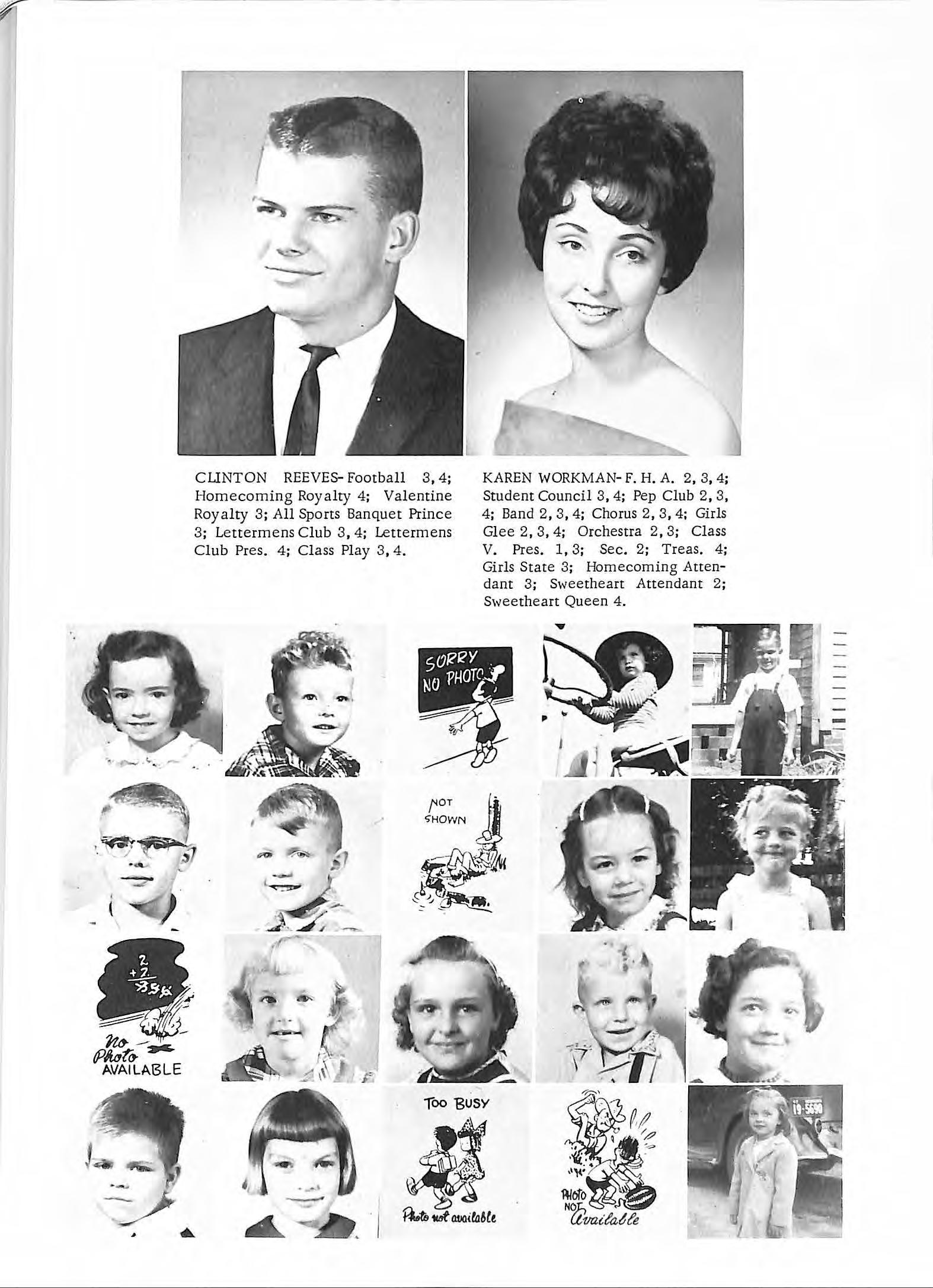 KAREN WORKMAN- F. H. A 2 , 3 , 4 ; Student Council 3 , 4 ; Pep Club 2, 3 , 4 ; Band 2 , 3 , 4 ; Chorus 2, 3 , 4; Girls Glee 2 , 3 , 4 ; Orchestra 2, 3; Class V. Pres. 1, 3; Sec. 2; Treas. 4 ; Girls Sta t e 3 ; Homecoming At tendant 3 ; Sweetheart Atte ndant 2; Sweetheart Queen 4.