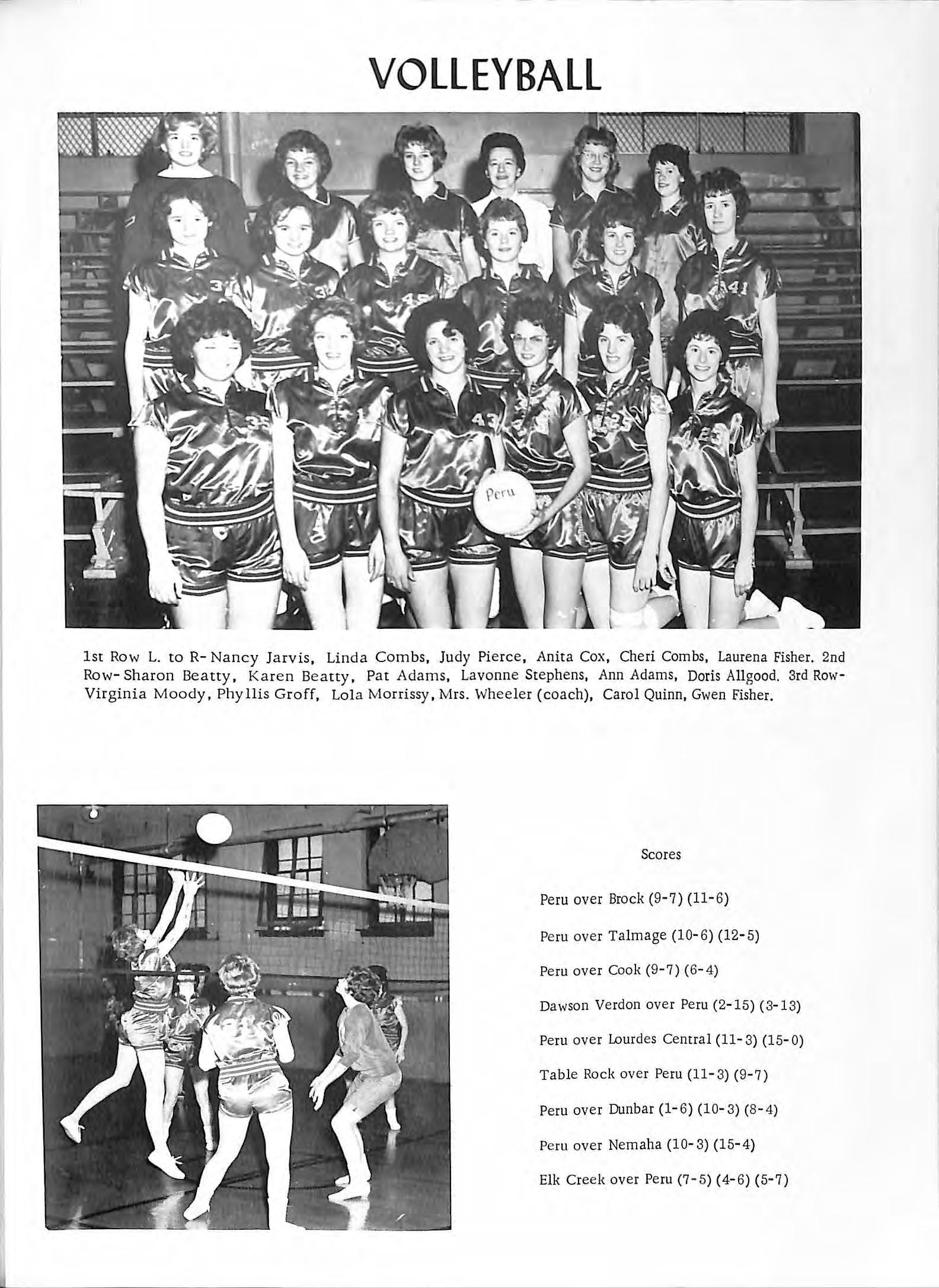 1st Row L. to R- Nancy J a r v is, Linda Combs, Jud y Pi e r ce , An it a Cox , Ch e ri Combs, Laurena Fisher. 2nd Row- Sharon Bea tt y, Ka r en Bea tt y, Pa t A d ams , Lavonne Step h ens, Ann Adams , Doris Allgood . 3rd RowVir gin ia Moody , Phy llis Groff, Lol a Morrissy, M rs. \ vh ee l e r ( coach), Carol Quinn, Gwen Fishe r.