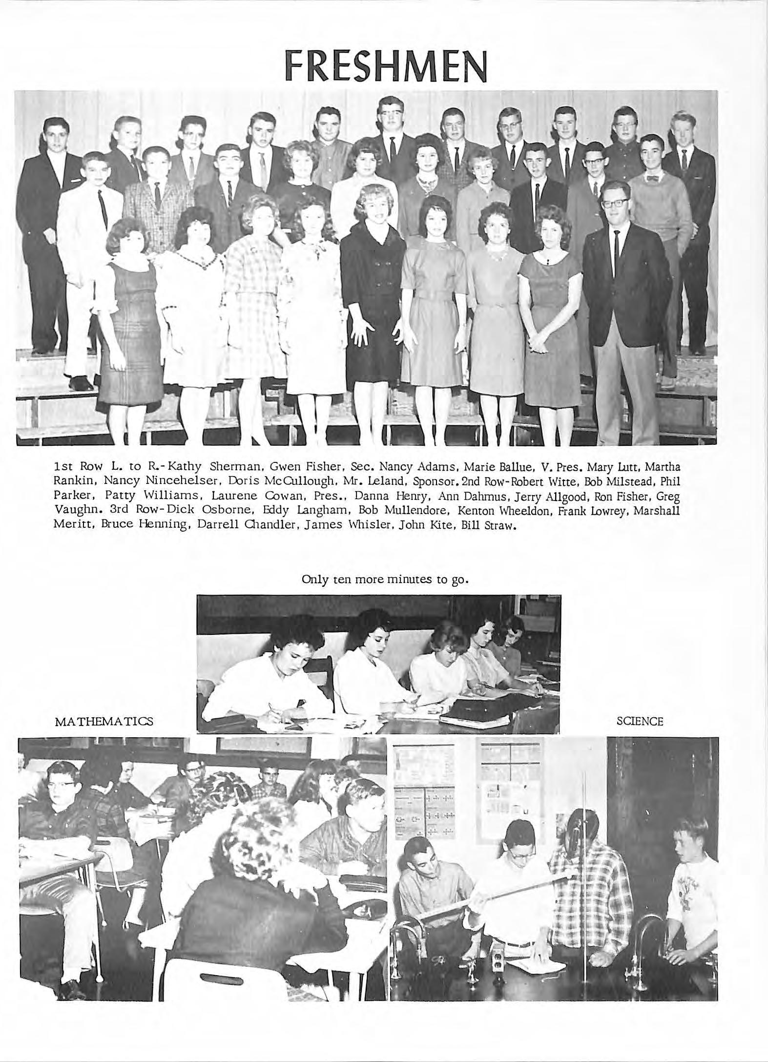 1st Row L. to R.- Kathy Sherman, Gwen Fisher, Sec Nancy Adams, Marie Ballue, V. Pres. Mary u.m, Martha Rankin, Nancy Nincehelser, Doris McCUllough. Mr. Leland, Sponsor. 2nd Row-Robert Witte, Bob Milstead, Phil Parker, Patty Williams, Laurene Cowan, Pres., Danna Henry, Ann Dalunus, Jerry Allgood, Ron Fisher, Greg Vaughn. 3rd Row- Dick Osborne, Eddy Langham, Bob Mullendore, Kenton Wheeldon, Frank Lowrey, Marshall Meritt, Bruce Henning, Darrell Olandler, James \ \ihis l er, John Kite, Bill Straw.
