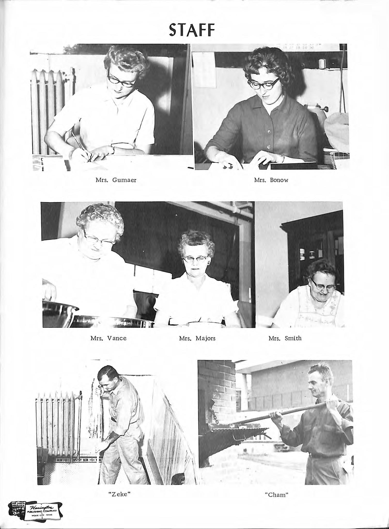 Front Row L. t o R.- Karen Workman, Jeannie Gnade ,Co- f:di tor , Virginia Moody , F:ditor , Devon Adams, Nancy J arvis, Oiarlotte Rankin.Back RowTo m Gomon, Bill Stephens, Garth Adams, Mr Herny, Sponsor