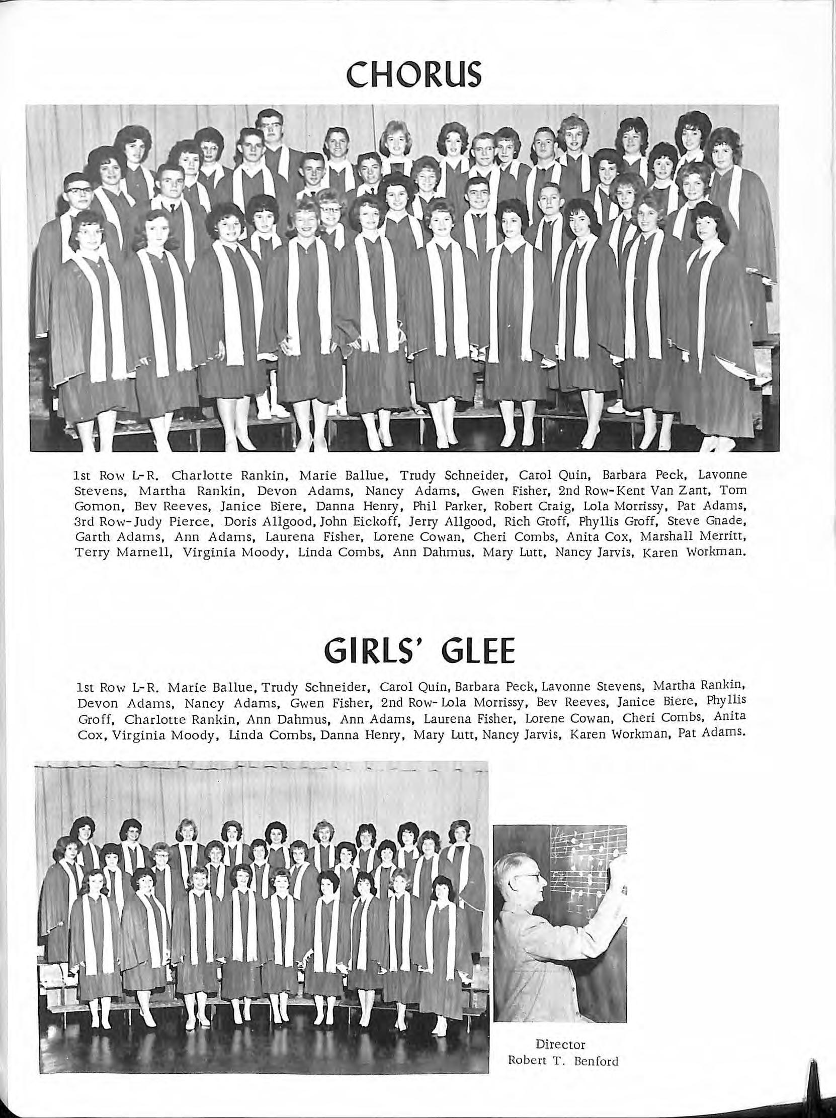 1st Row L- R. Charlotte Rankin , Marie Ballu e , Trudy Schneider, Carol Quin, Barbara Peck, Lavonne Stevens, Martha Rankin , Dev on Adams , Nancy Adams, Gwen Fisher, 2nd Row- Kent Van Zant, Tom Gomon, Bev Re eves , Janice Biere, Danna He nry, Phil Parker, Robert Craig, Lola Morrissy, Pat Adams, 3 rd Row- Ju dy Pi e rce, Doris Allgood, John Eickoff, Jerry Allgood , Rich Groff, Phyllis Groff, Steve Gnade , Garth Adams , Ann Adams, Laurena Fisher, Lorene Cowan, Cheri Combs, Anita Cox, Marshall Merritt , Terry Marnell, Virginia Moody , Linda Combs, Ann Dahm us. Mary Lutt, Nancy Jarvis, Karen Wo rkman.
