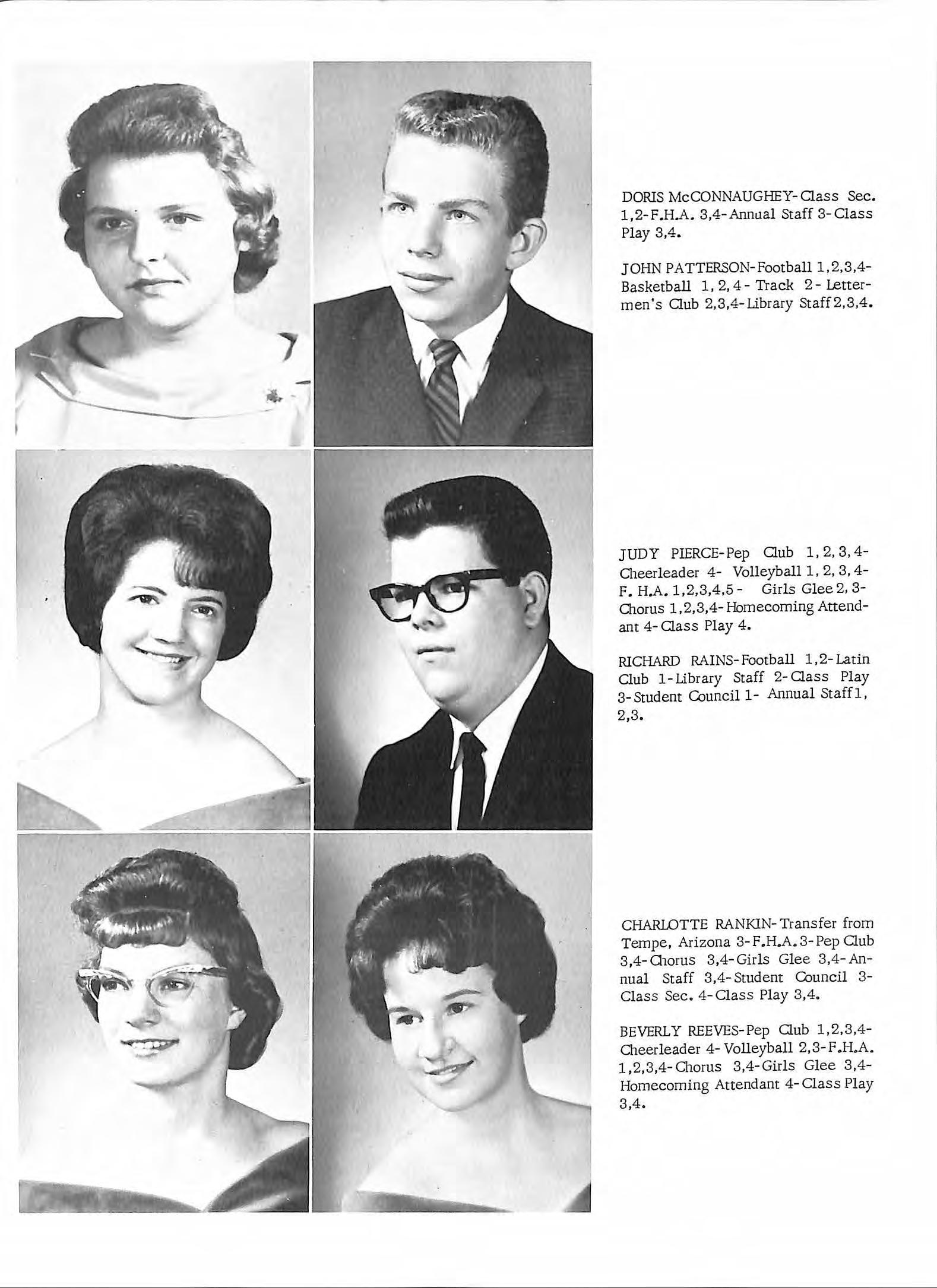 JUDY PIERCE- Pep Club 1, 2, 3, 4Cheerleader 4- Volleyball 1, 2, 3, 4F. H.A. 1,2,3,4,5 - Girls Glee 2, 3Chorus 1,2,3,4-Homecoming Attendant 4- Class Play 4.