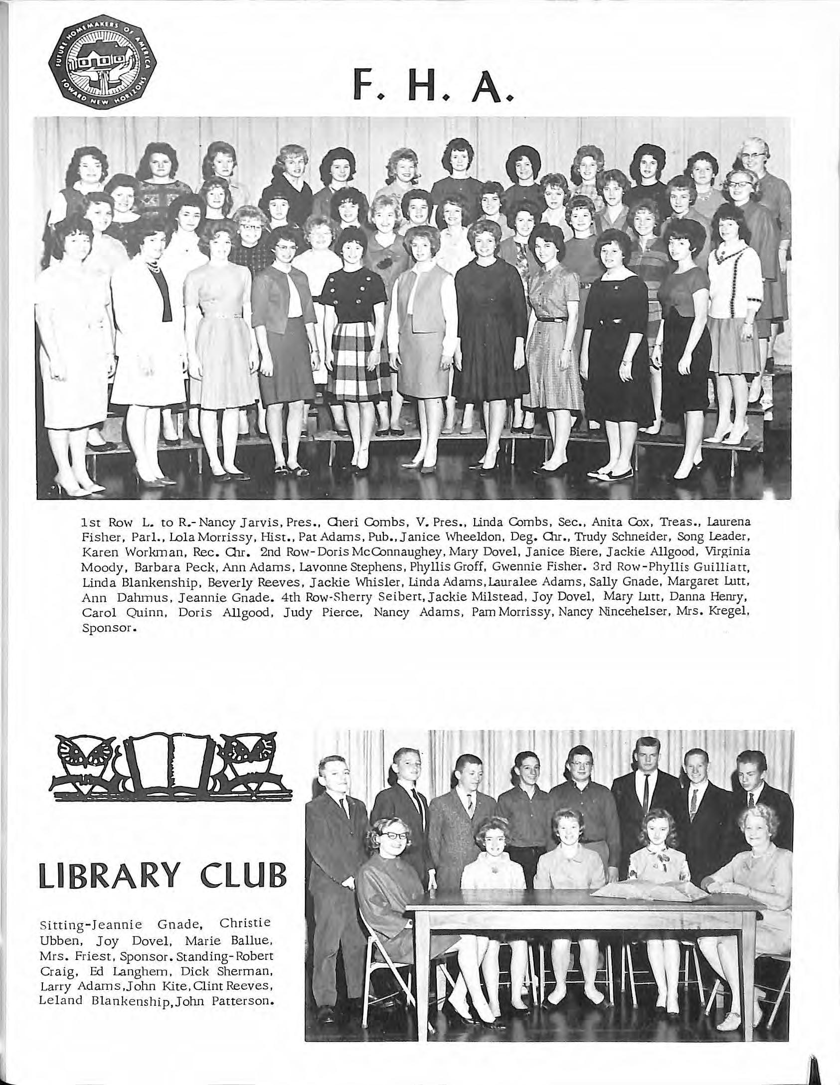Fisher, Parl., Lola Morrissy, Hist . , Pat Adams, Pub., Janice \vheeldon, Deg. Oir., Trudy Schneider, Song Leader, Karen Workman, Rec. Oir. 2nd Row-DorisMcC.Onnaughey,Mary Dovel. Janice Biere, Jackie Allgood, Virginia Moody, Barbara Peck, Ann Adams, Lavonne Stephens, Phyllis Groff. Gwennie Fisher 3rd Row -Ph yllis Guilliatt, Linda Blankenship, Beverly Reeves, Jackie Whisler, Linda Adams ,Laura lee Adams , Sally Gnade, Margaret Lutt, Ann Dalmms, Jeannie Gnade. 4th Row-Sherry Seibert, Jackie Milstead, Joy Dovel, Mary Lutt, Danna Henry, Carol Quinn. Doris Allgood, Judy Pierce, Nancy Adams , Pam Morrissy, Nancy Nincehelser, Mrs. Kregel, Sponsor.