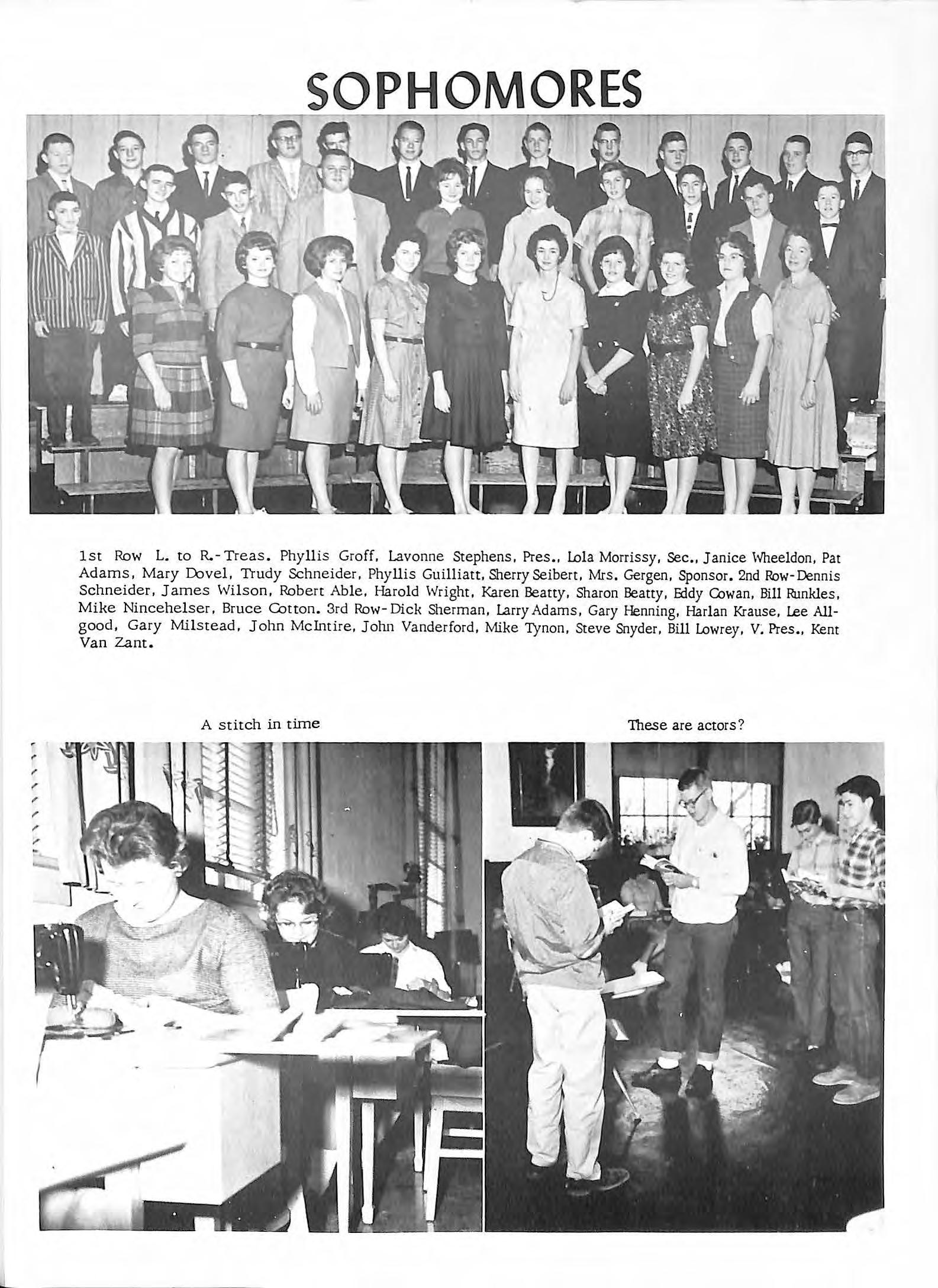 1st Row L. to R.-Treas. Phyllis Groff, Lavonne Stephens, Pres., Lola Morrissy, Sec., Janice Wheeldon, Pat Adams, Mary Covel, Trudy Schneider, Phyllis Guilliatt, Sherry Seibert, Mrs. Gergen, Sponsor 2nd Row-Dennis Schneider, James Wilson, Robert Able, Harold Wright, Karen Beatty, Sharon Beatty, Eddy Cowan, Bill Runkles, Mike Nincehelser, Bruce Cotton. 3rd Row- Dick Sherman, Larry Adams, Gary Henning, Harlan Krause, Lee Allgood, Gary Milstead, John McIntire, John Vanderford, Mike Tynon, Steve Snyder, Bill Lowrey, v; Pres., Kent Van Zam.