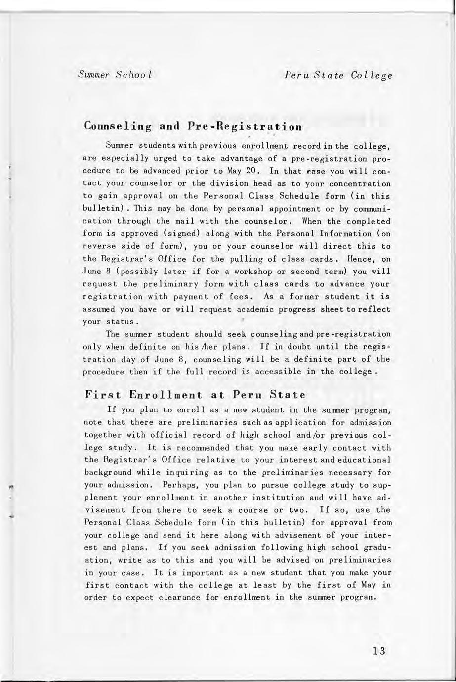 Endorsement--At Peru State the responsibility of approving or recommending qualified persons for certification, has been delegated to Administrative Council which passes on the applicant's academic and professional qualifications, and his character and competence as a teacher, All applicants should note that by meeting graduation scholastic requirements does not mean that one will be automatically recommended for certification. All applications for certification in the summer should be cleared in the Registrar's Office at least two weeks prior to the end of either term of enrollment.