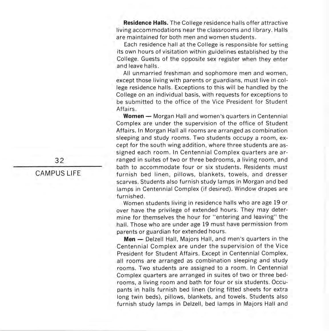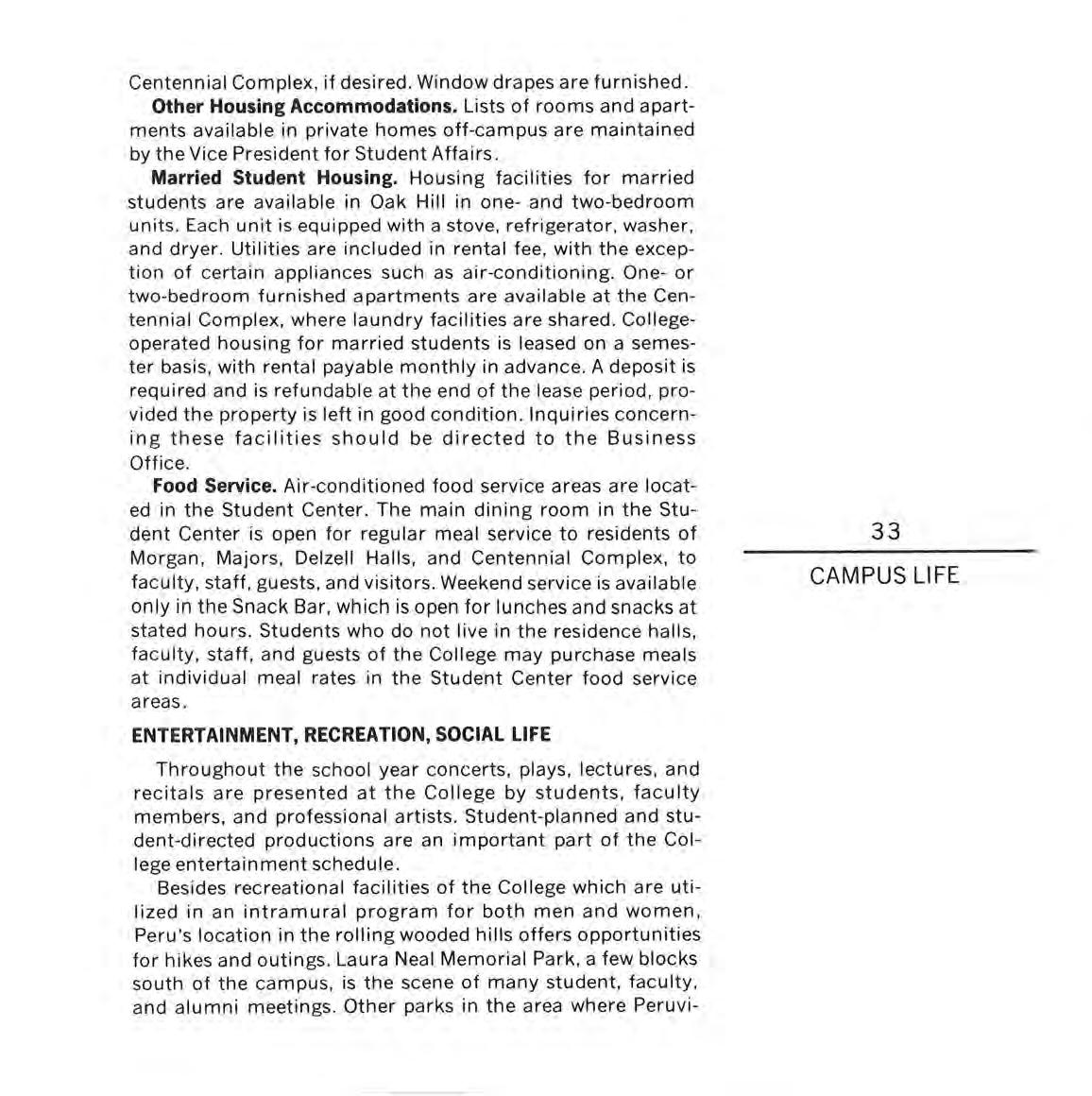 Pate Hall at Centennial Complex was converted to apartments tor married students in 1970 with plans to do the same tor Nicholas Hall in the future . Each apartment contains kitchen-dining area, living room , full bath, and one or two bedrooms . All are furnished.